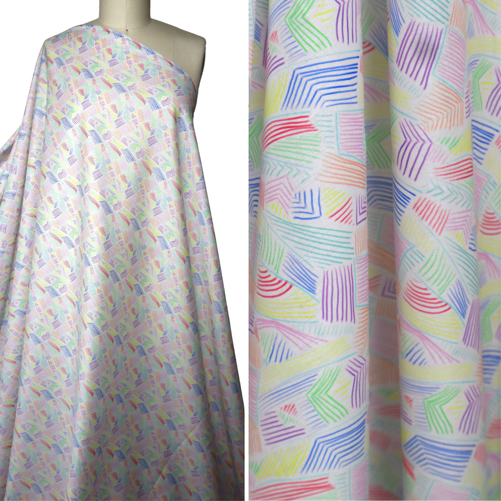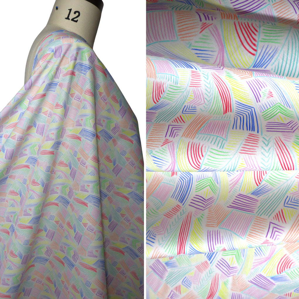 The ‘Scribble’ design is a multi-colour freestyle drawn print replete with little assemblies of lines in pinks, orange, green, red, yellow and purple (purple on the white only). The overall effect is mesmerising. These prints are going to be perfect for shirts and blouses, and striking summer dresses. ‘Scribble’ comes in either a black or white background.