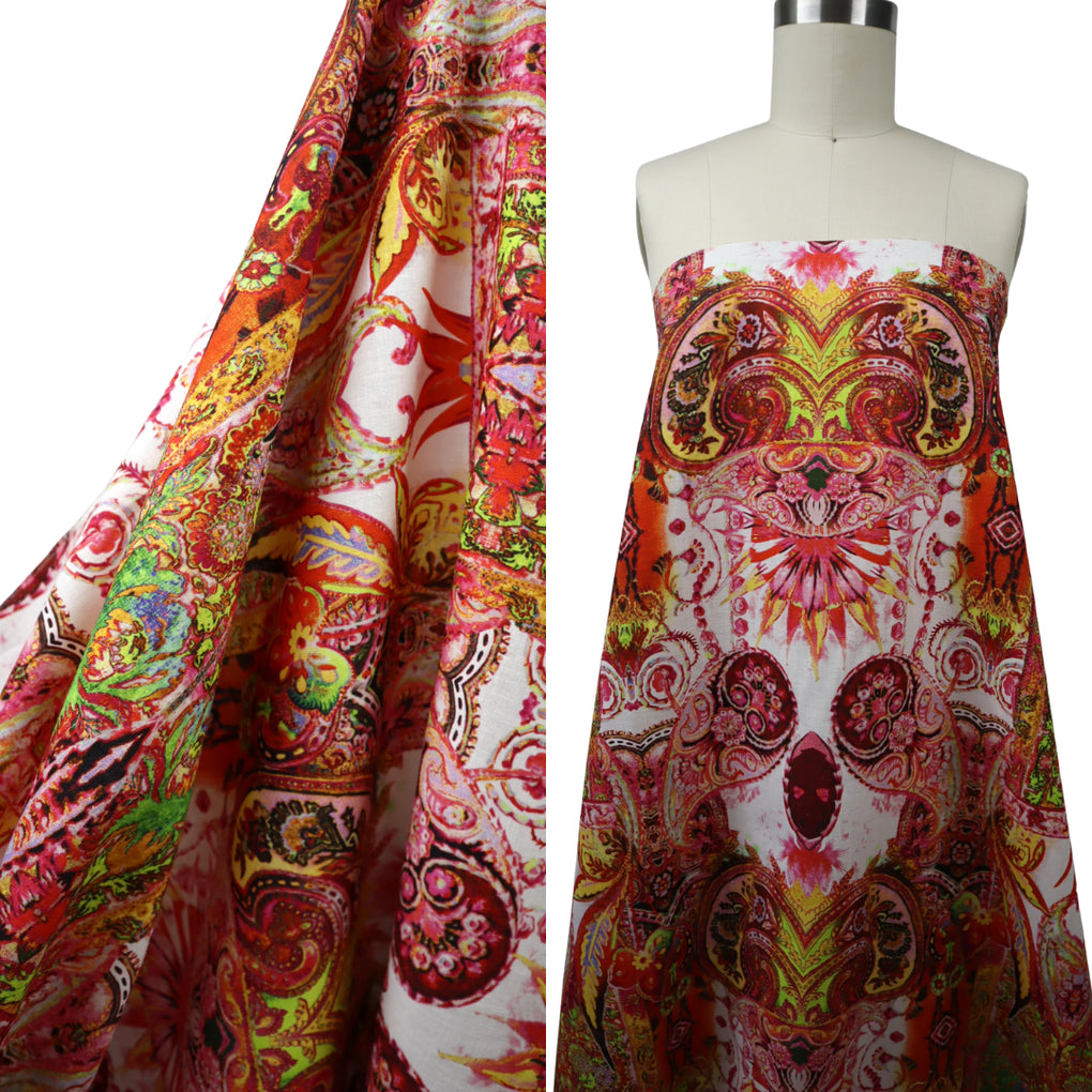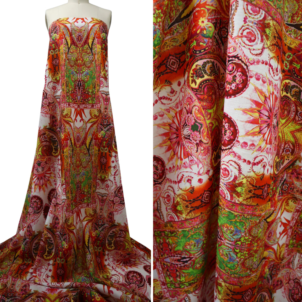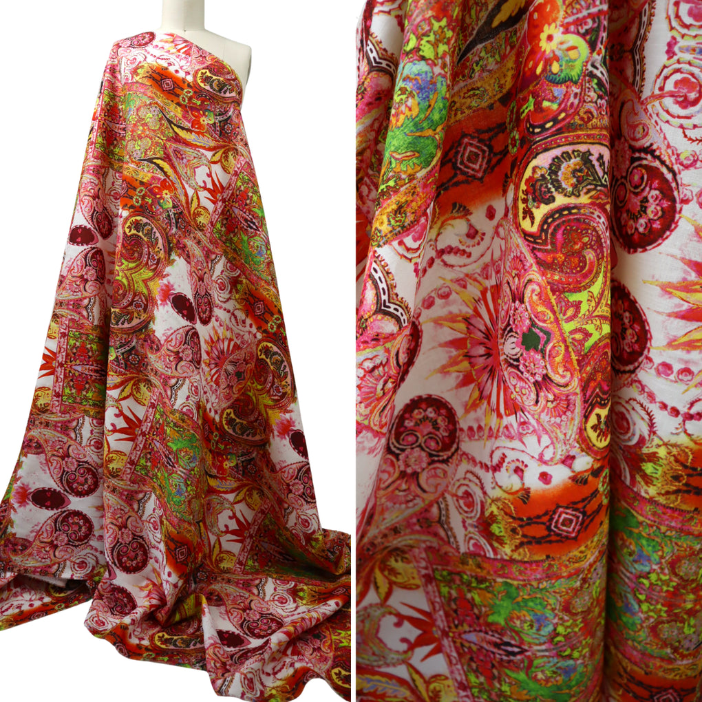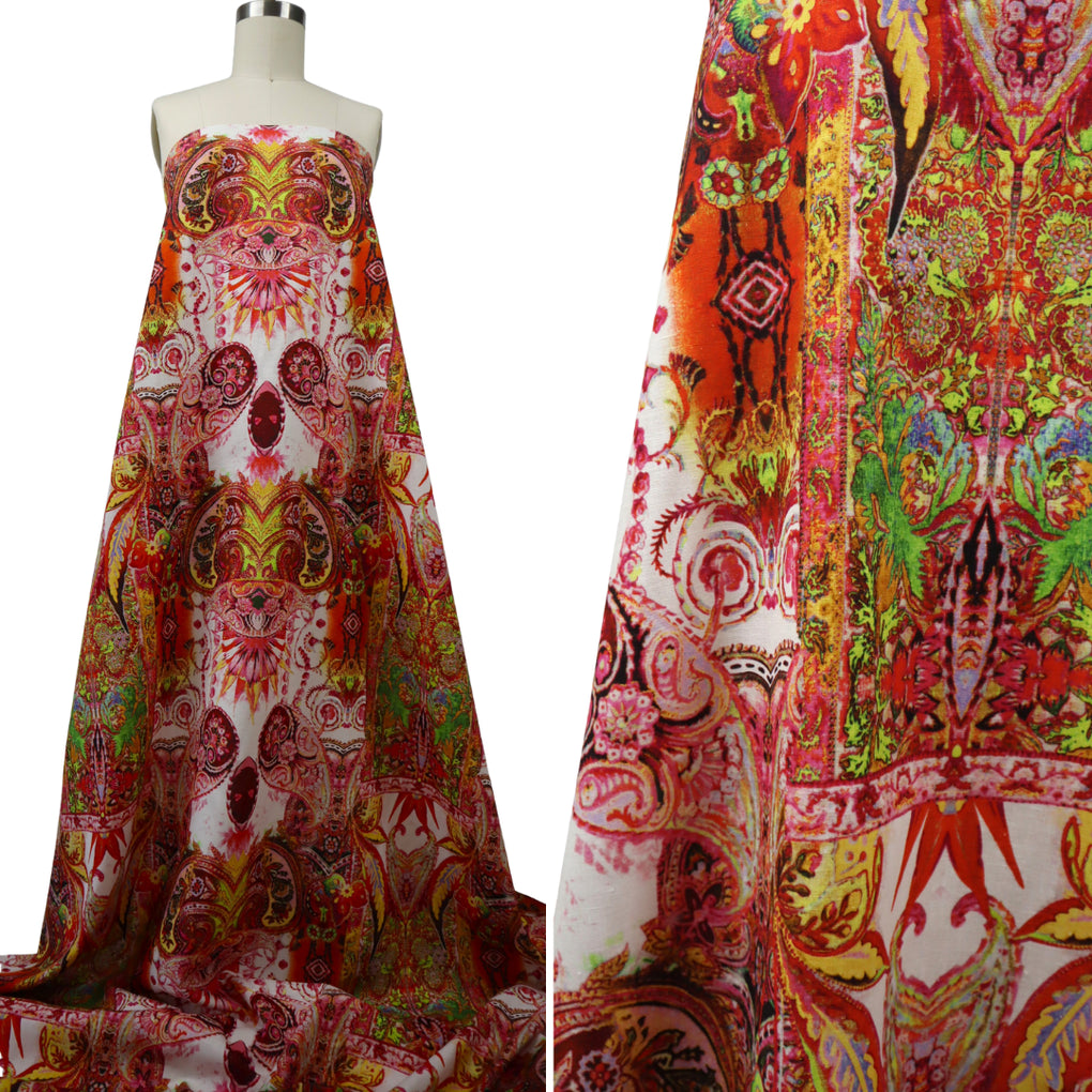 If you like prints that are a little different from the usual offerings, and love bold, sophisticated designs, then this will quickly find its way into your shopping cart ;-). The design is completely unique, and features a sun burst, decorative scrolls, small flowers and leaves, a modern take on paisley, and a glorious ‘window’ into a garden paradise. The artwork is thoughtful, balanced, and could best be described as a watercolour effect. You will notice in the full-width images that there is a pattern repeat, but the brilliance of this design is that the key elements (the sunburst, and the garden window) are staggered across the design. The many images give you a good indication of the scale and drape of the fabrics.