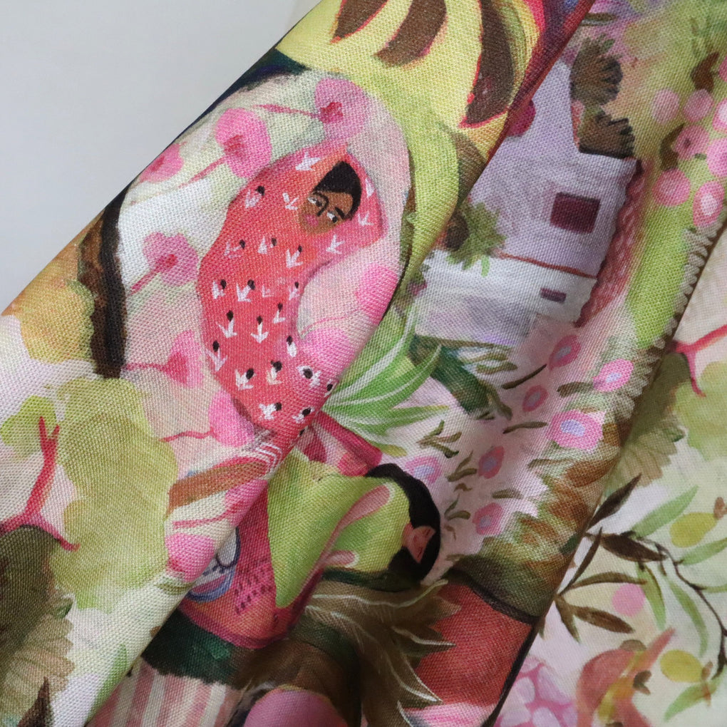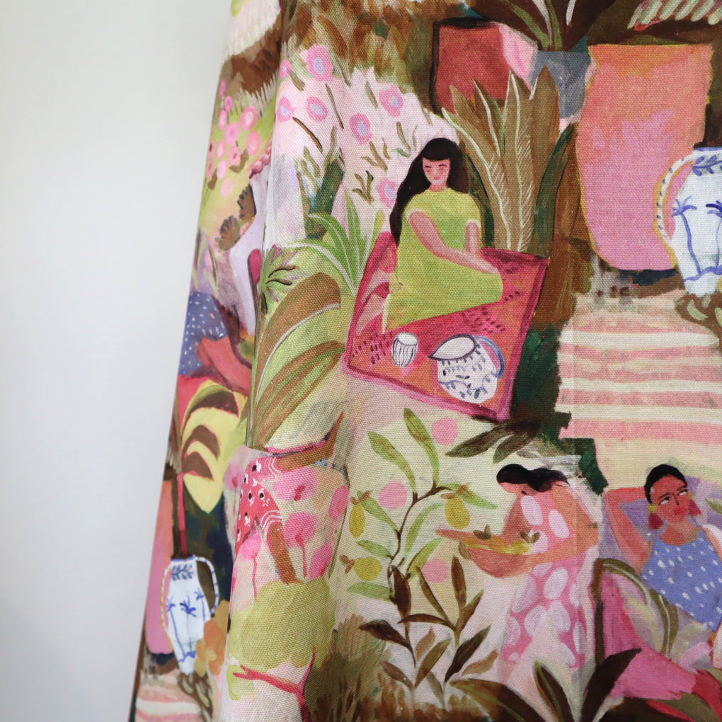 'Tuscan Escape' ~ This dreamy print features a beautiful villa, surrounded by gardens. You'll see four gorgeous women enjoying the Italian summer jaunt; picnicking, picking pears, or just lazing in the summer sun. I adore the inclusion of blue and white porcelain (both the planter, and also in the picnicking scene), and the lovely patterns on the clothes.