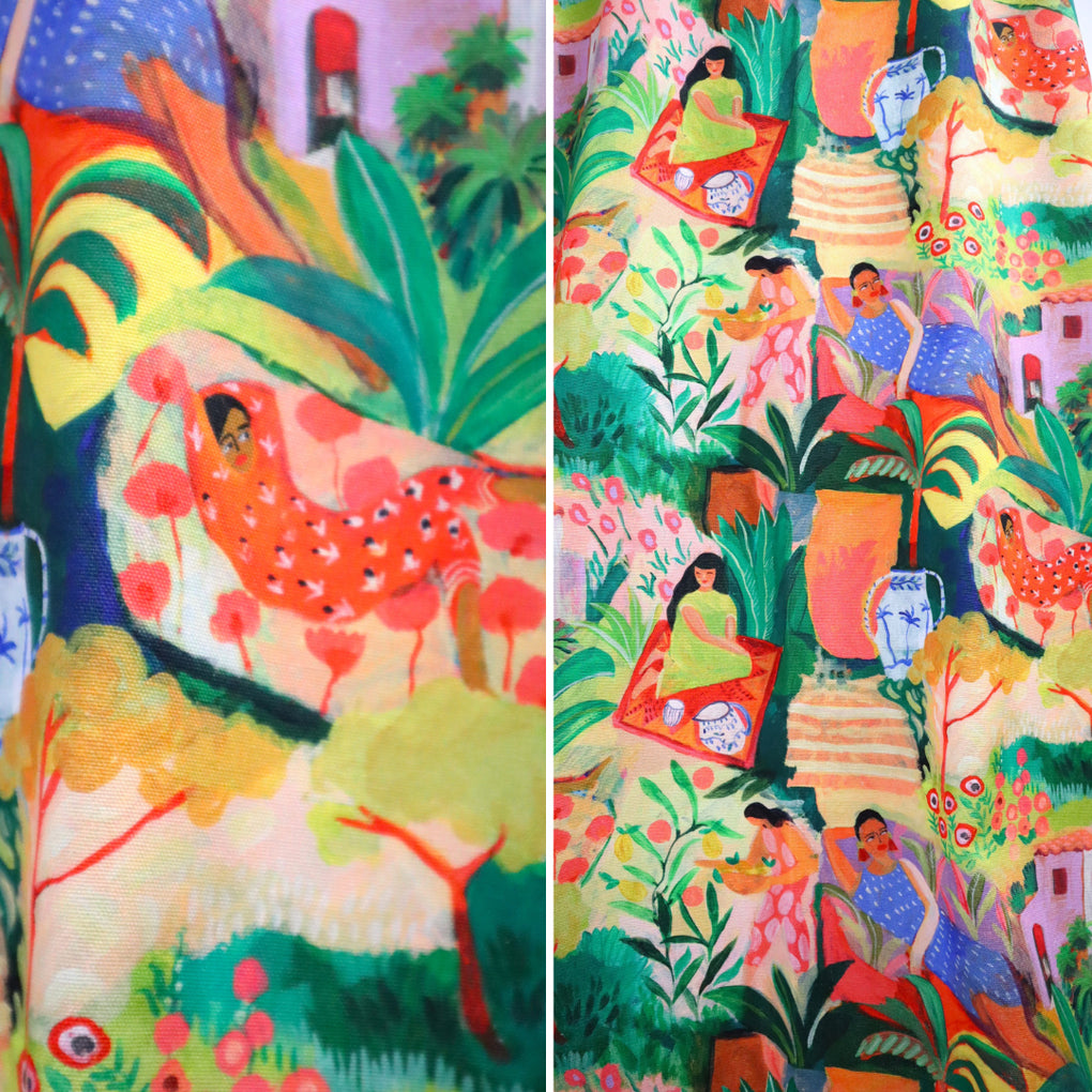 'Tuscan Escape' ~ This dreamy print features a beautiful villa, surrounded by gardens. You'll see four gorgeous women enjoying the Italian summer jaunt; picnicking, picking pears, or just lazing in the summer sun. I adore the inclusion of blue and white porcelain (both the planter, and also in the picnicking scene), and the lovely patterns on the clothes.
