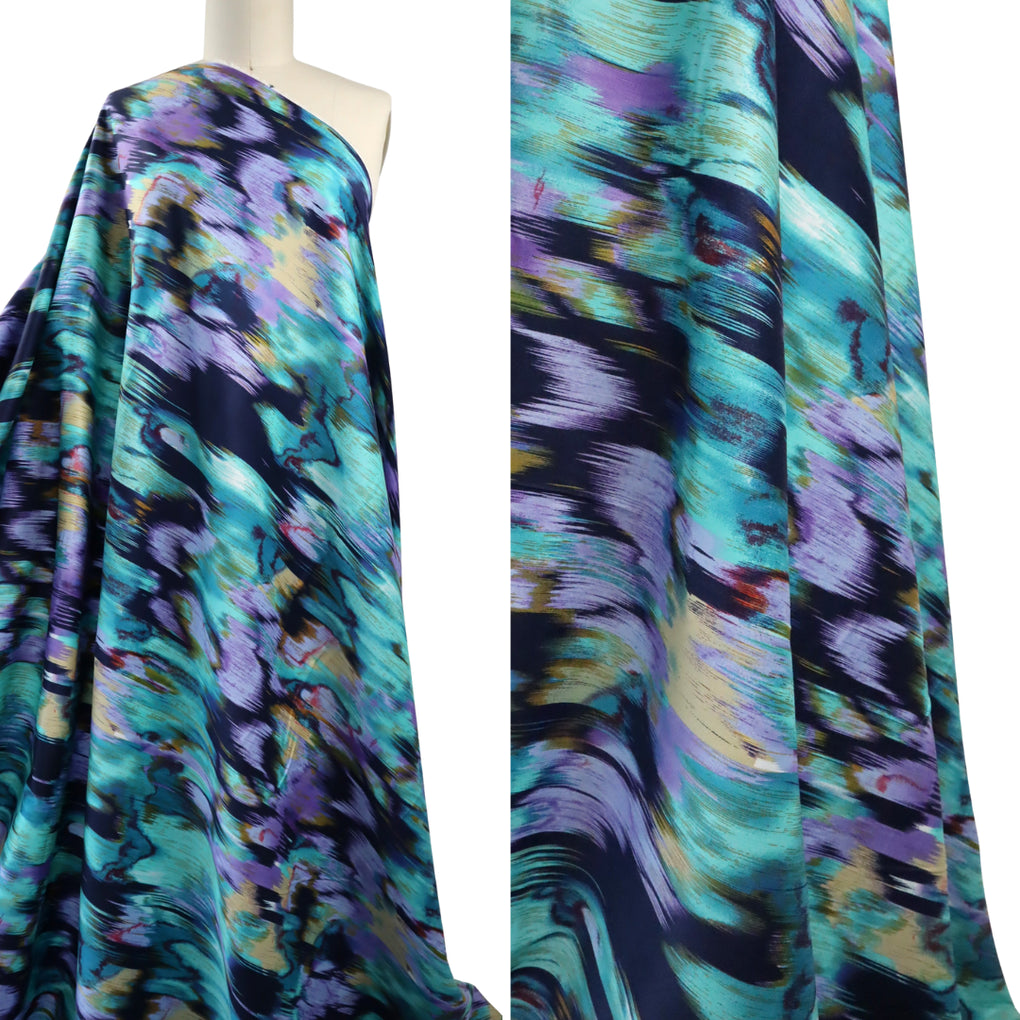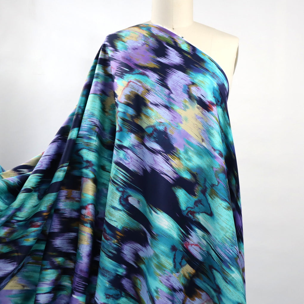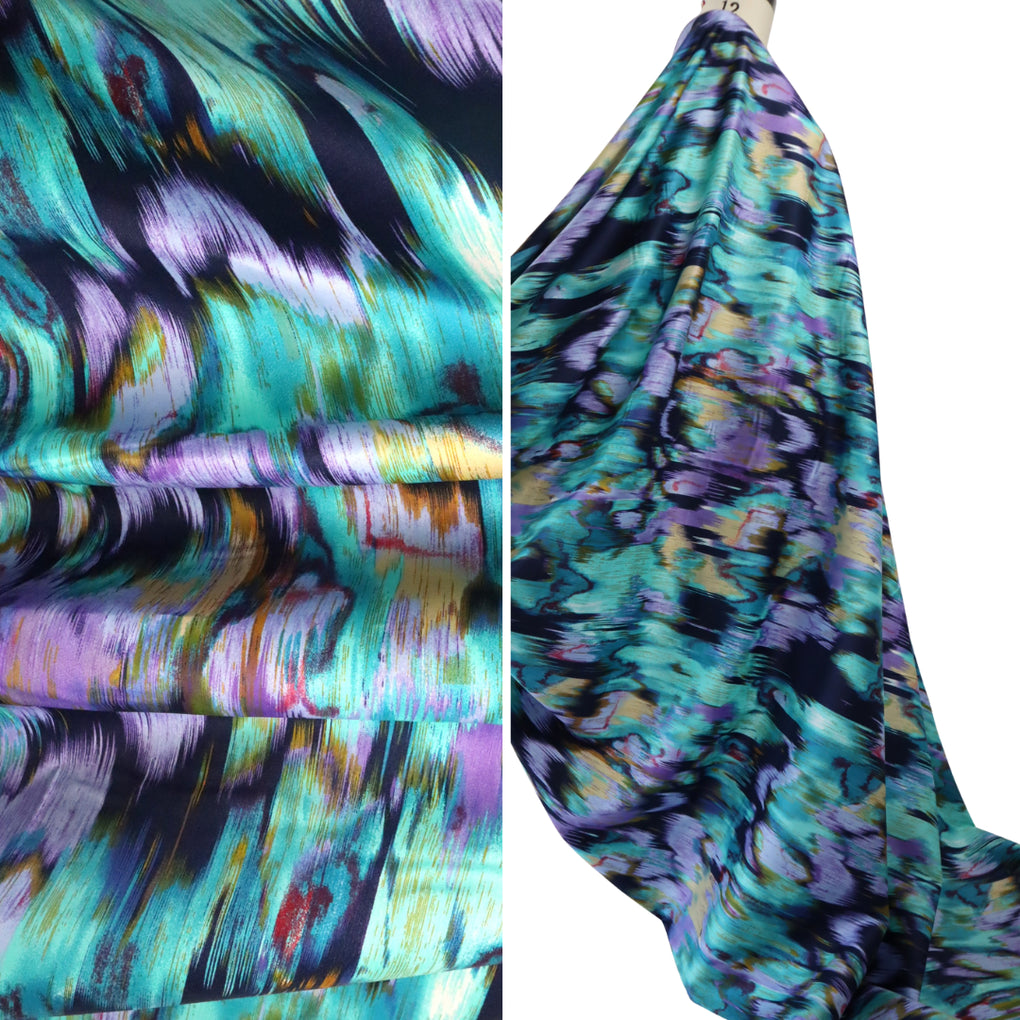 I've had quite a few 'brush stroke' style prints in the shop over the years, and I adore the colour combination of this beauty. You'll see cornflower, mauve, purple, aqua, teal, super dark navy, small amounts of black, butter yellow and other golden hues. This is a classic cotton satin and has a subtle sheen.