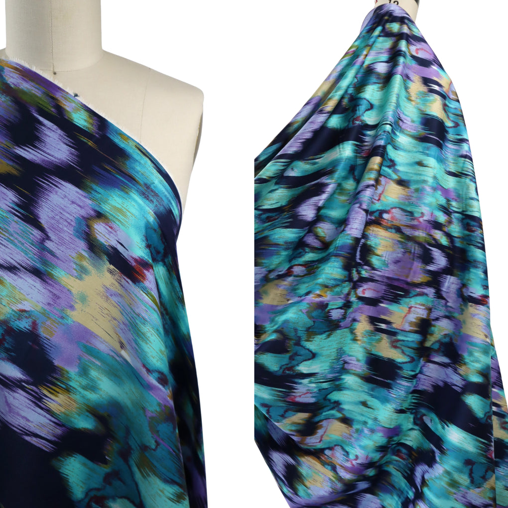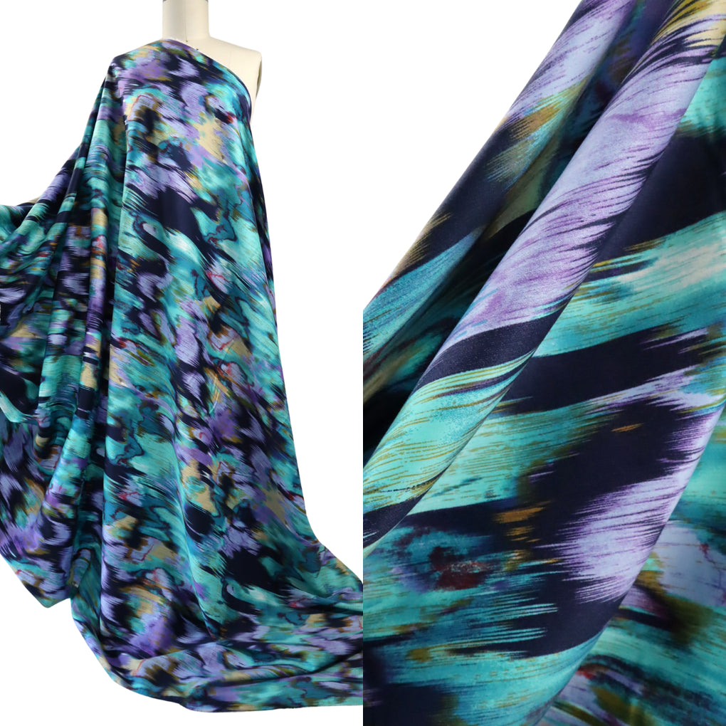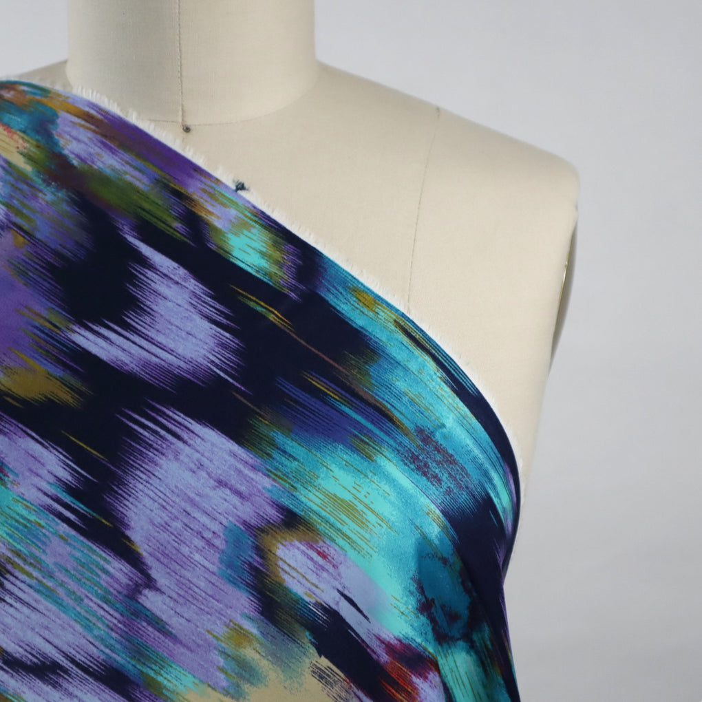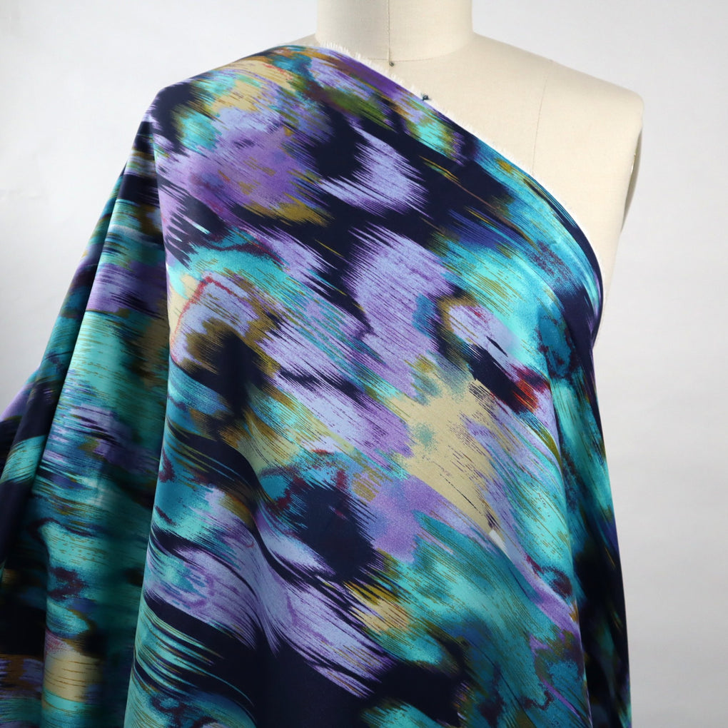 I've had quite a few 'brush stroke' style prints in the shop over the years, and I adore the colour combination of this beauty. You'll see cornflower, mauve, purple, aqua, teal, super dark navy, small amounts of black, butter yellow and other golden hues. This is a classic cotton satin and has a subtle sheen.