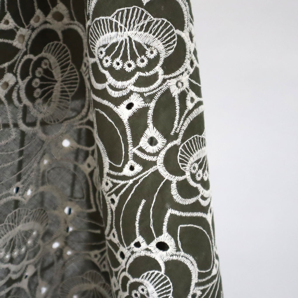 'Amaya' is a sublime embroidered cloth. It's a lightweight poplin (lighter than your average poplin), but the embroidery adds both some weight and body. It drapes in soft folds so it's perfect for both shirts and blouses, as well as dresses. If you love a statement sleeve this will add volume and hold the shape more than a plain cotton. The floral embroidered design non-directional, and it features a scalloped edge running parallel to the selvage.