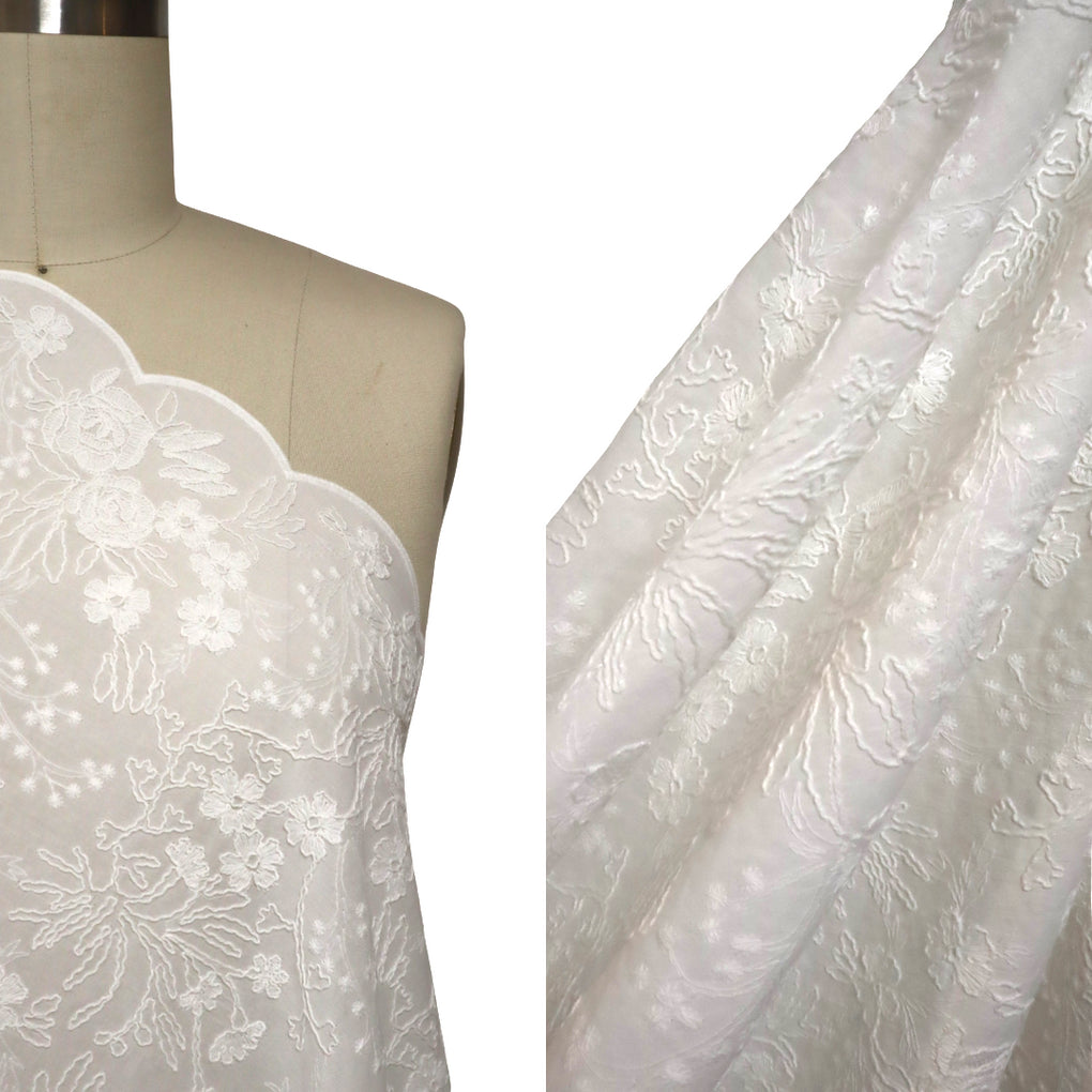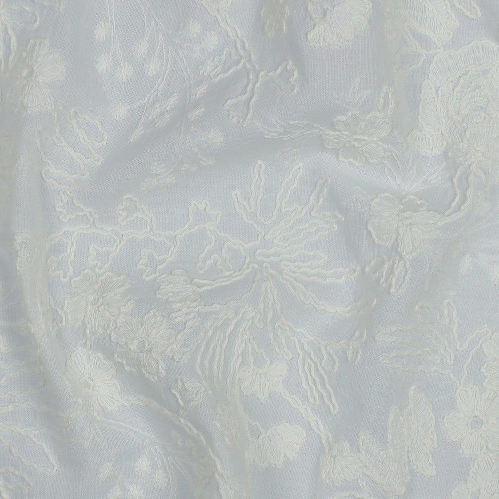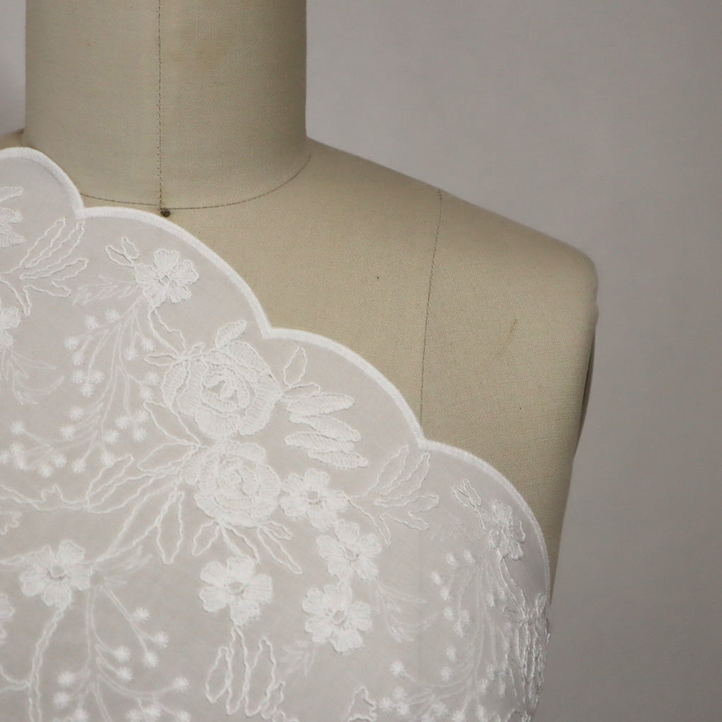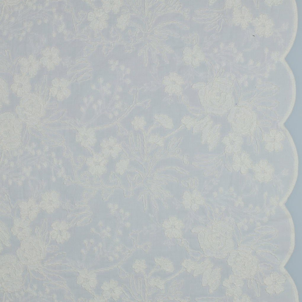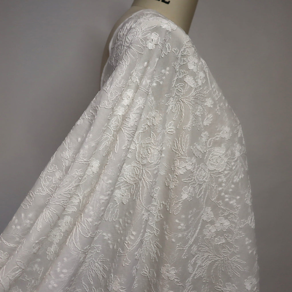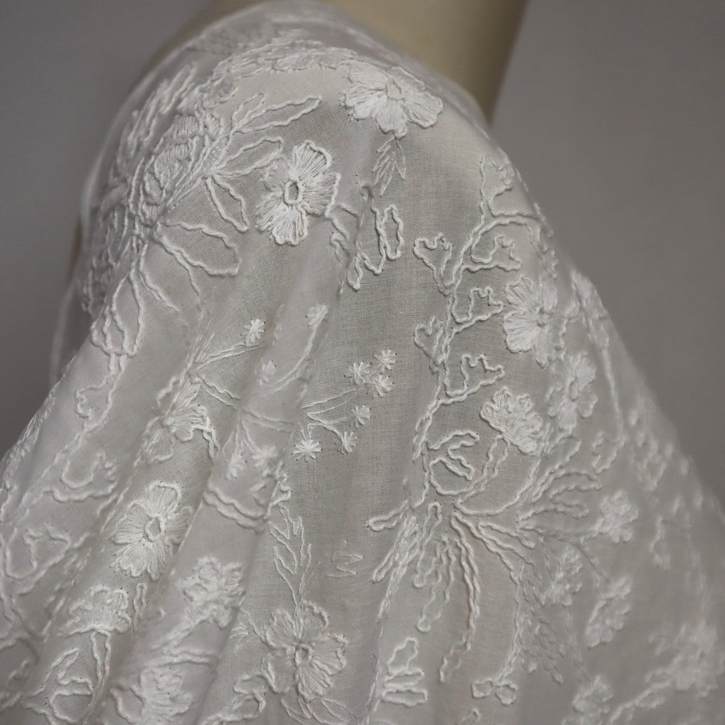 'Arabelle' is the most beautiful white-on-white embroidered voile. I should note that it's more of a winter white or ivory rather than a bright white. The embroidered design is quite dense with flowers and foliage across the cloth. The groups of flowers face both directions along the grain, so you can make the most of your cloth with some economical cutting out. You will also love the scalloped selvages, giving you lots of wonderful options for pretty skirt and sleeve 'hems' and delicate necklines. Even though this is a voile, the embroidery brings a bit of body to it. There is a bit of texture on the underside of the cloth so you might want to underline or line some fitted tops or bodices. This is a spectacular fabric.