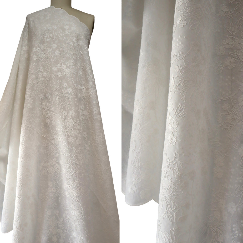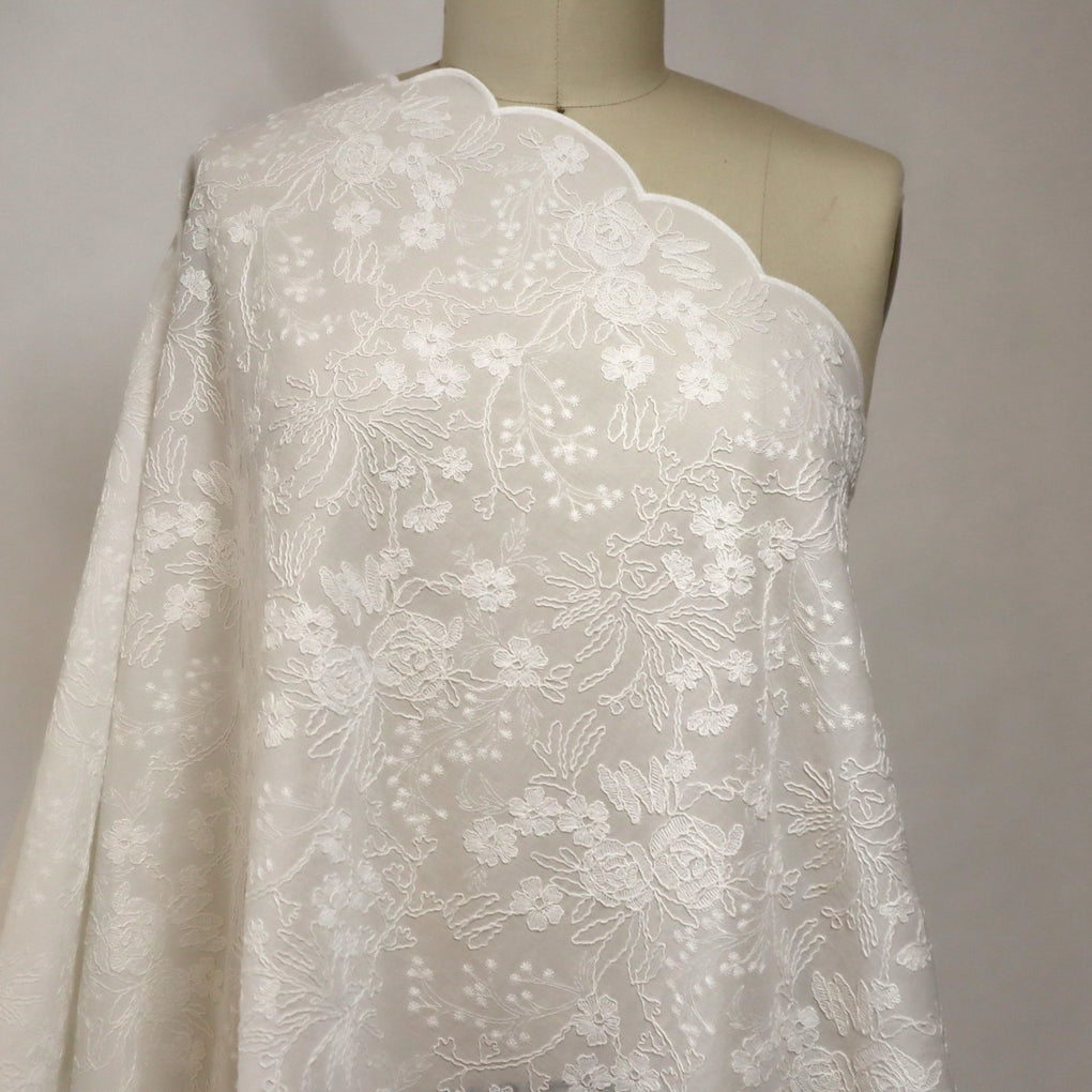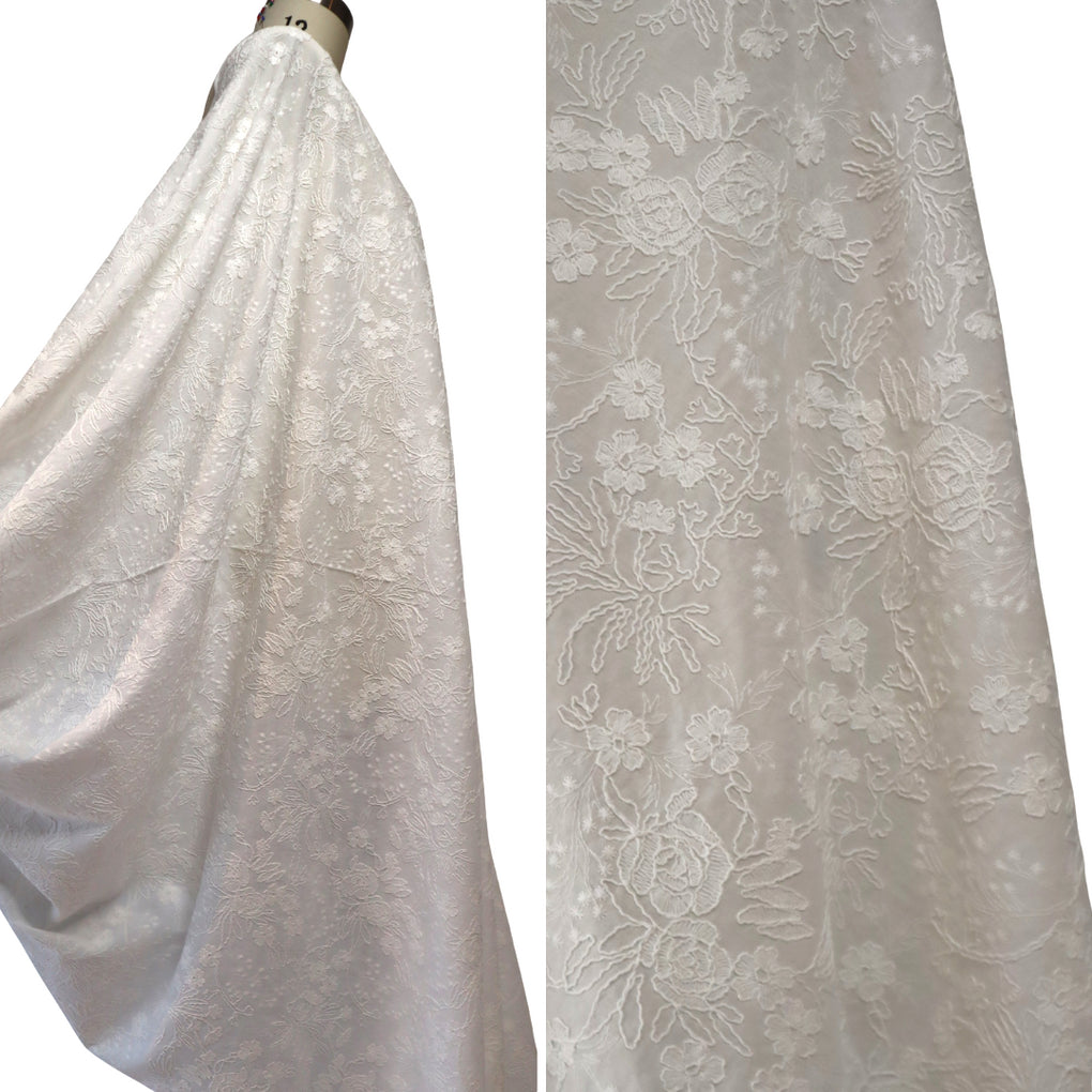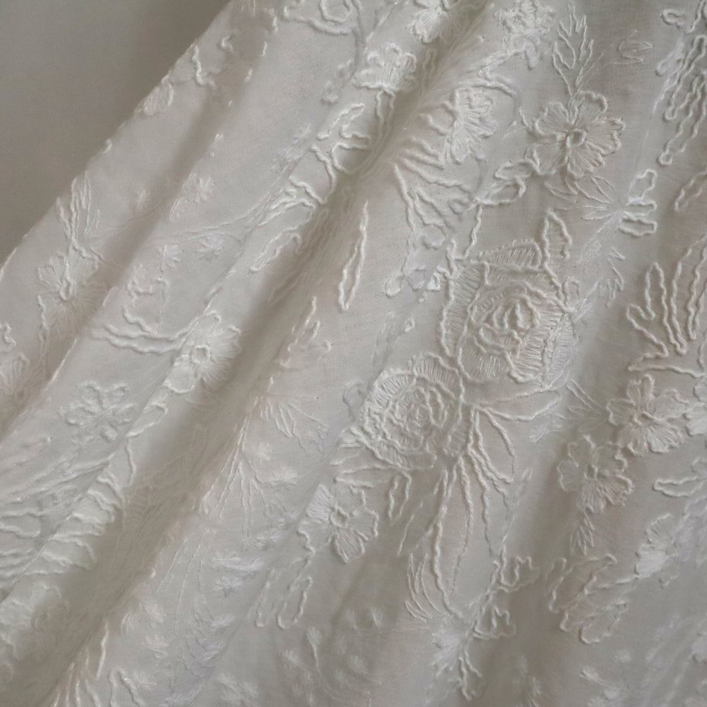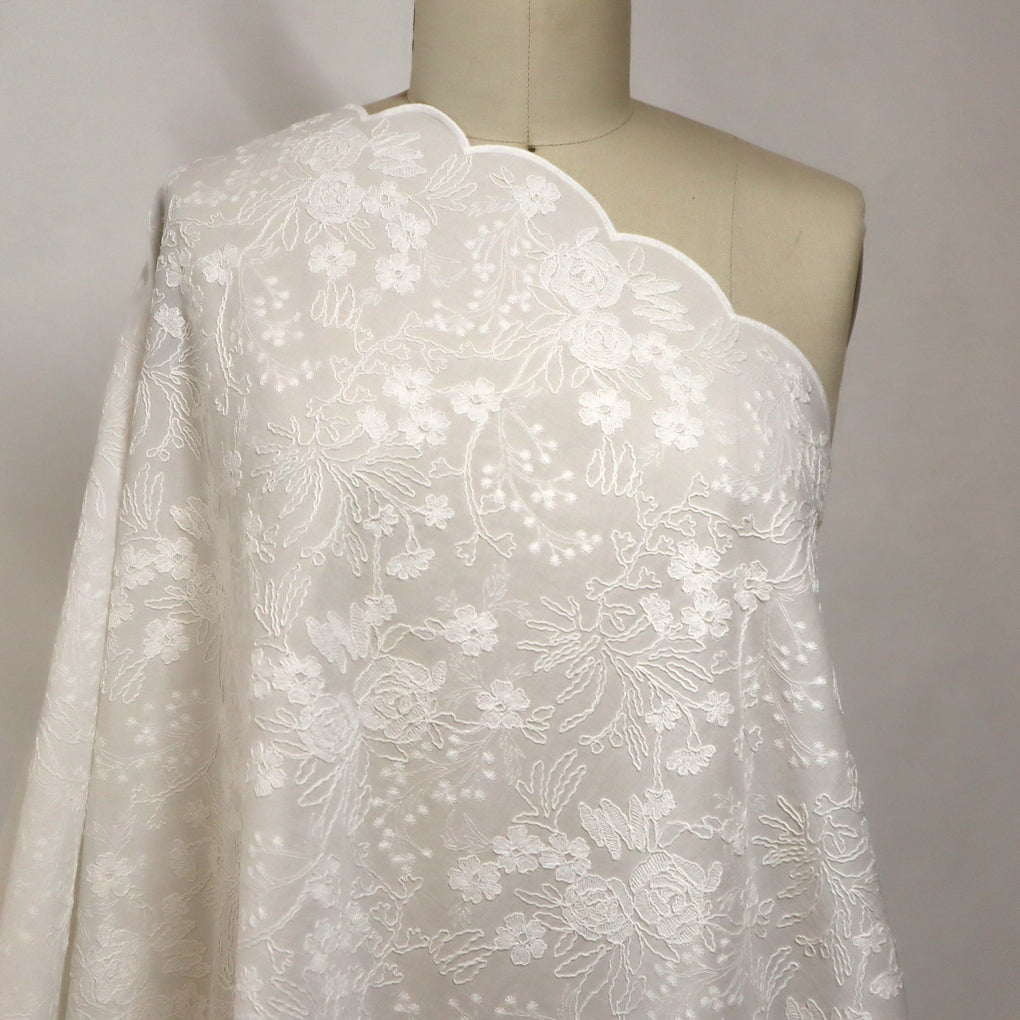 'Arabelle' is the most beautiful white-on-white embroidered voile. I should note that it's more of a winter white or ivory rather than a bright white. The embroidered design is quite dense with flowers and foliage across the cloth. The groups of flowers face both directions along the grain, so you can make the most of your cloth with some economical cutting out. You will also love the scalloped selvages, giving you lots of wonderful options for pretty skirt and sleeve 'hems' and delicate necklines. Even though this is a voile, the embroidery brings a bit of body to it. There is a bit of texture on the underside of the cloth so you might want to underline or line some fitted tops or bodices. This is a spectacular fabric.