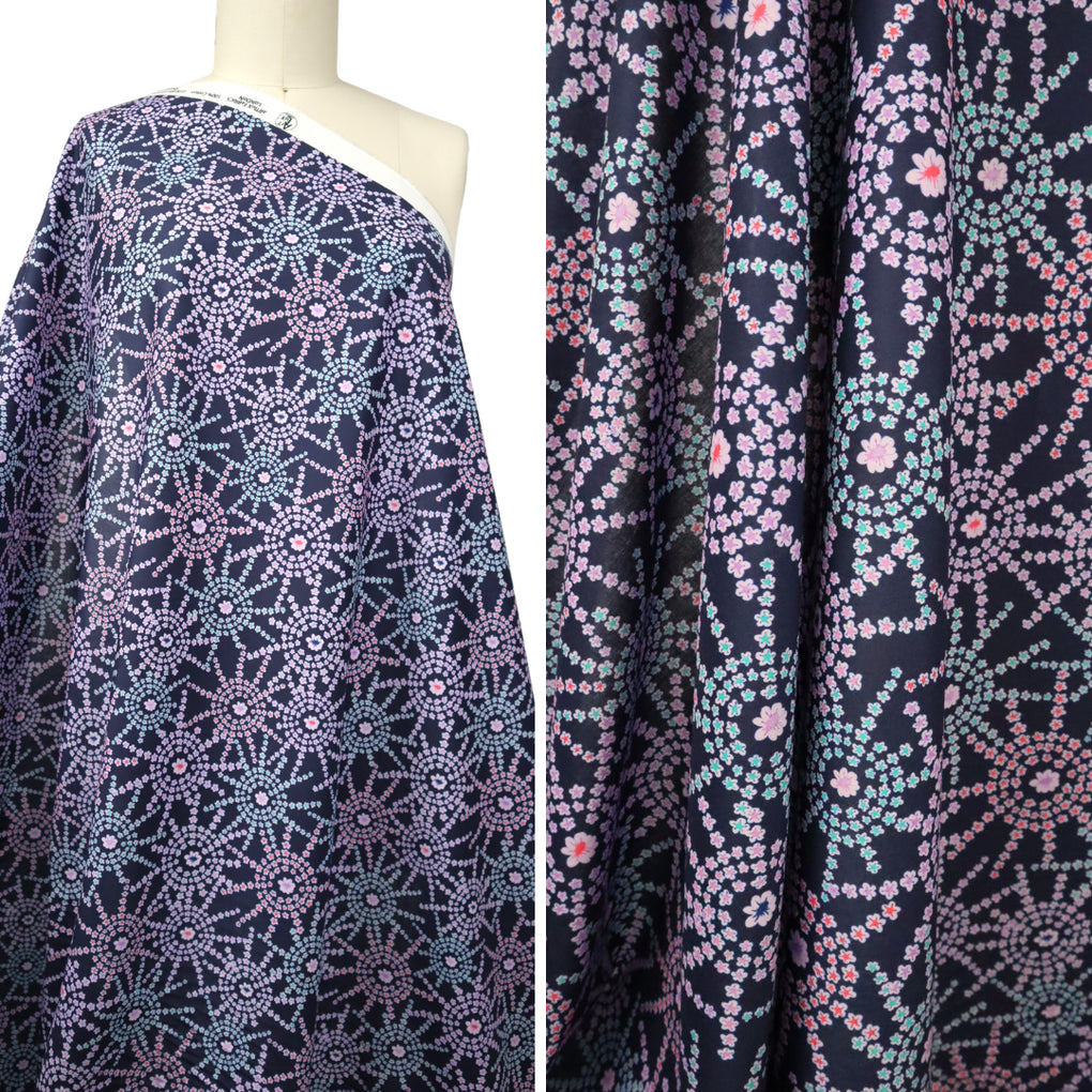These star bursts and made up of tiny flowers. You will see a bigger flower in the centre of the concentric circles. This has a classic navy background, and the beautiful combination of pink, lilac and green. The design is modern design, with a fresh colour combination.