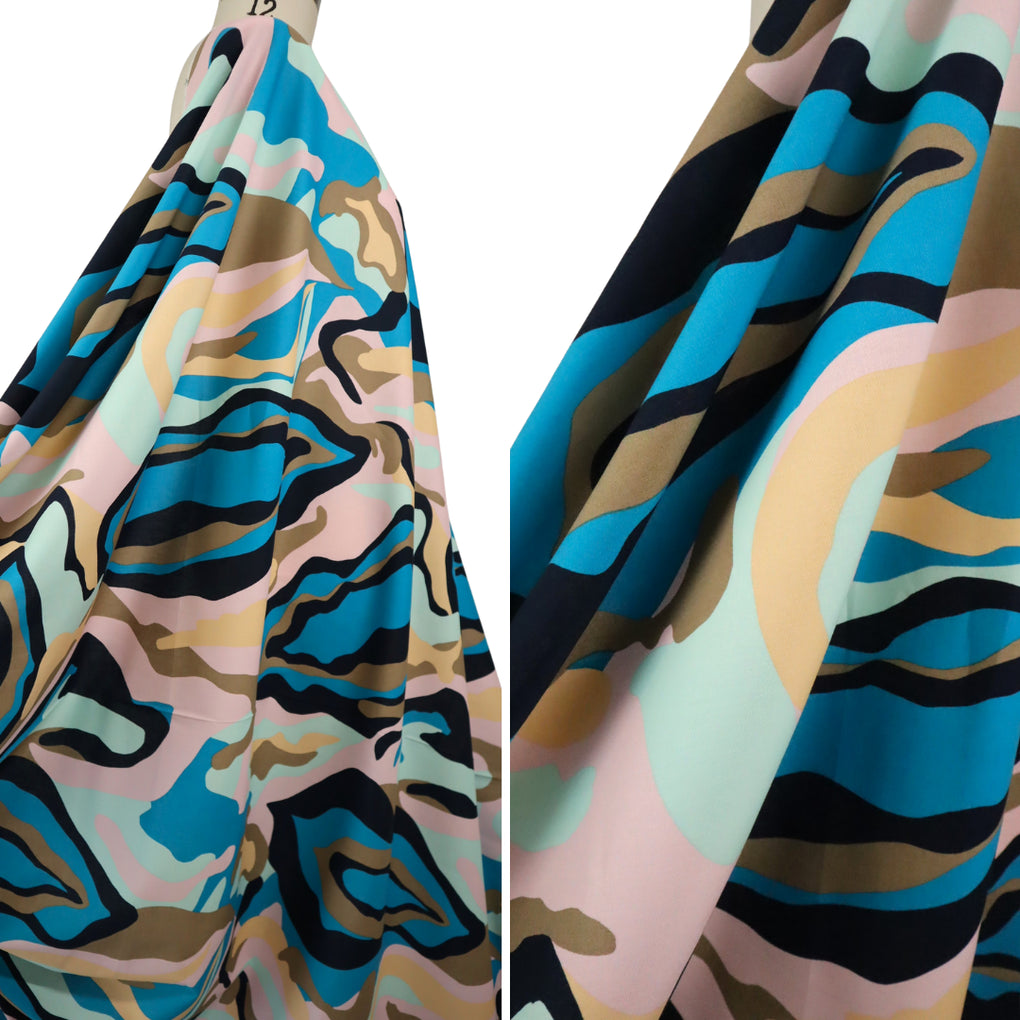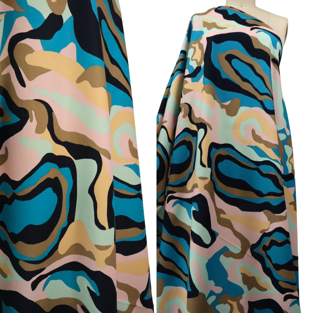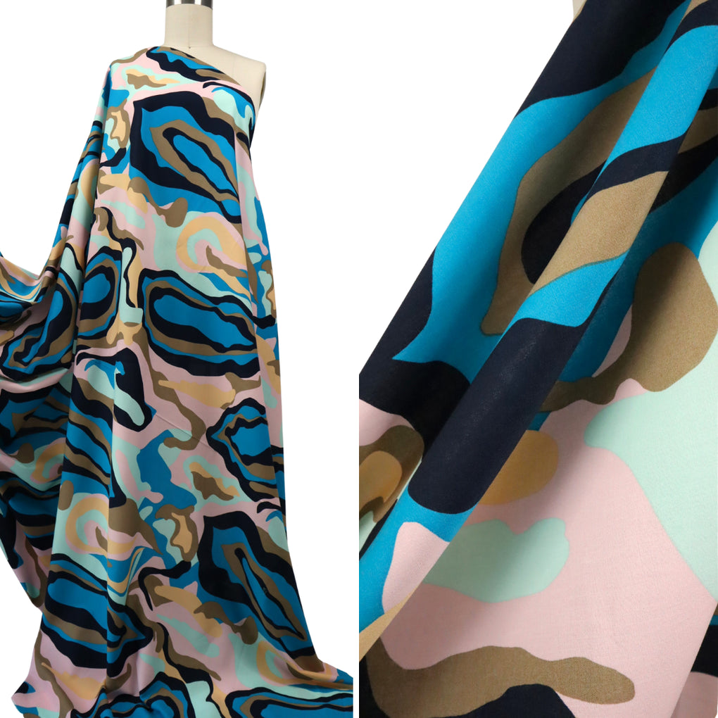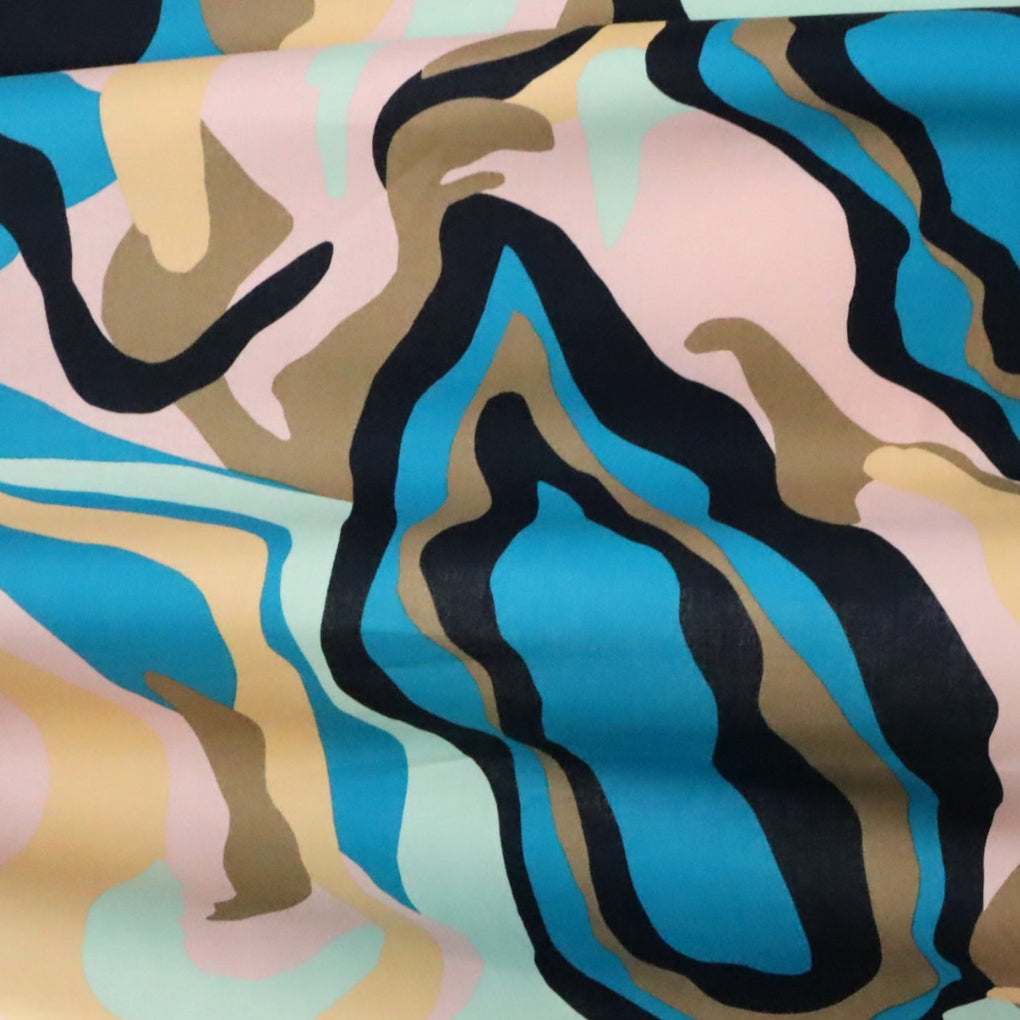 What a dreamy take on a camo print. It has the more pronounced marble effect, and the swirling design is on a striking larger scale. The colour combo is sensational, with the taupe, mint, pale pink, beige and black accompanying the gorgeous teal colour. This is a light weight stretch cotton. It has a nice amount of give across the grain, but just choose the same sort of patterns as you would for a poplin. The only way the stretch will be a factor is if you wanted a fitted blouse (for example). This is perfect for dresses, blouses, shirts, loose or straight pants, skirts and jumpsuits.