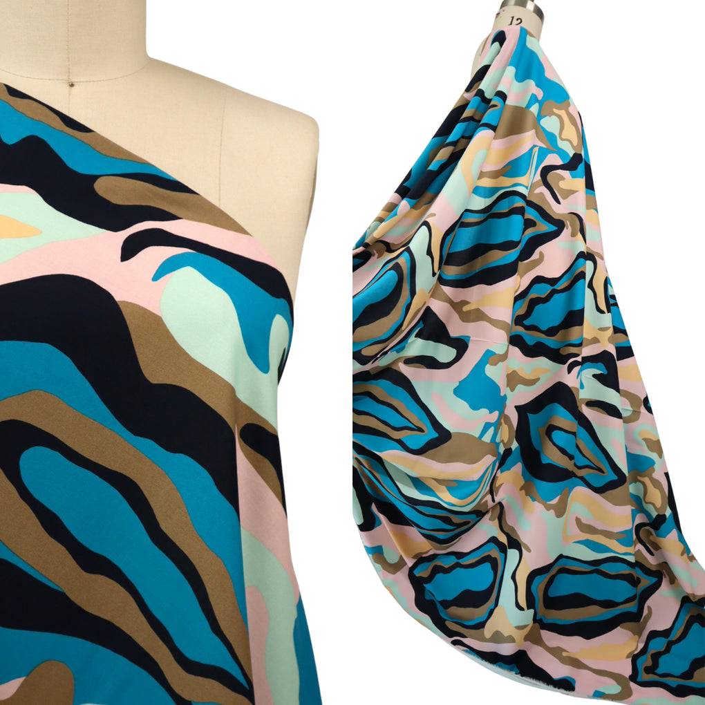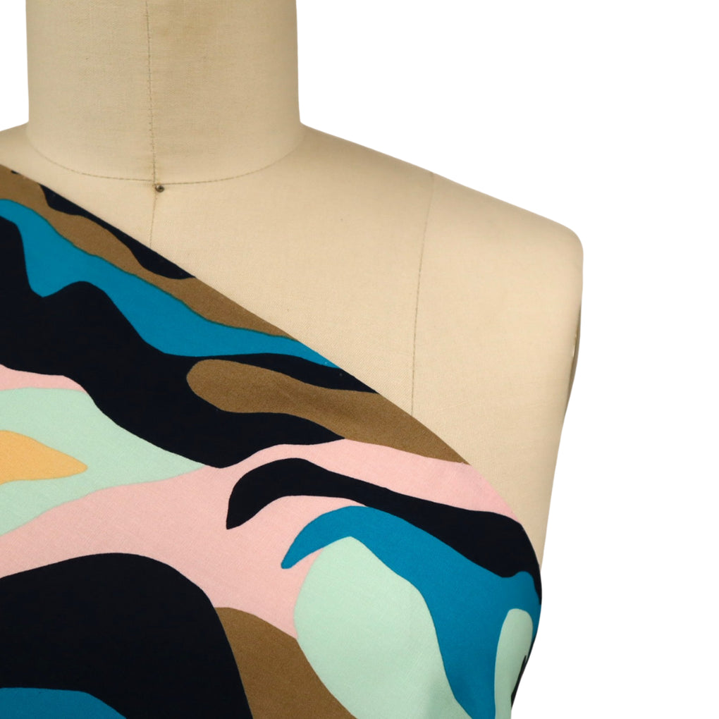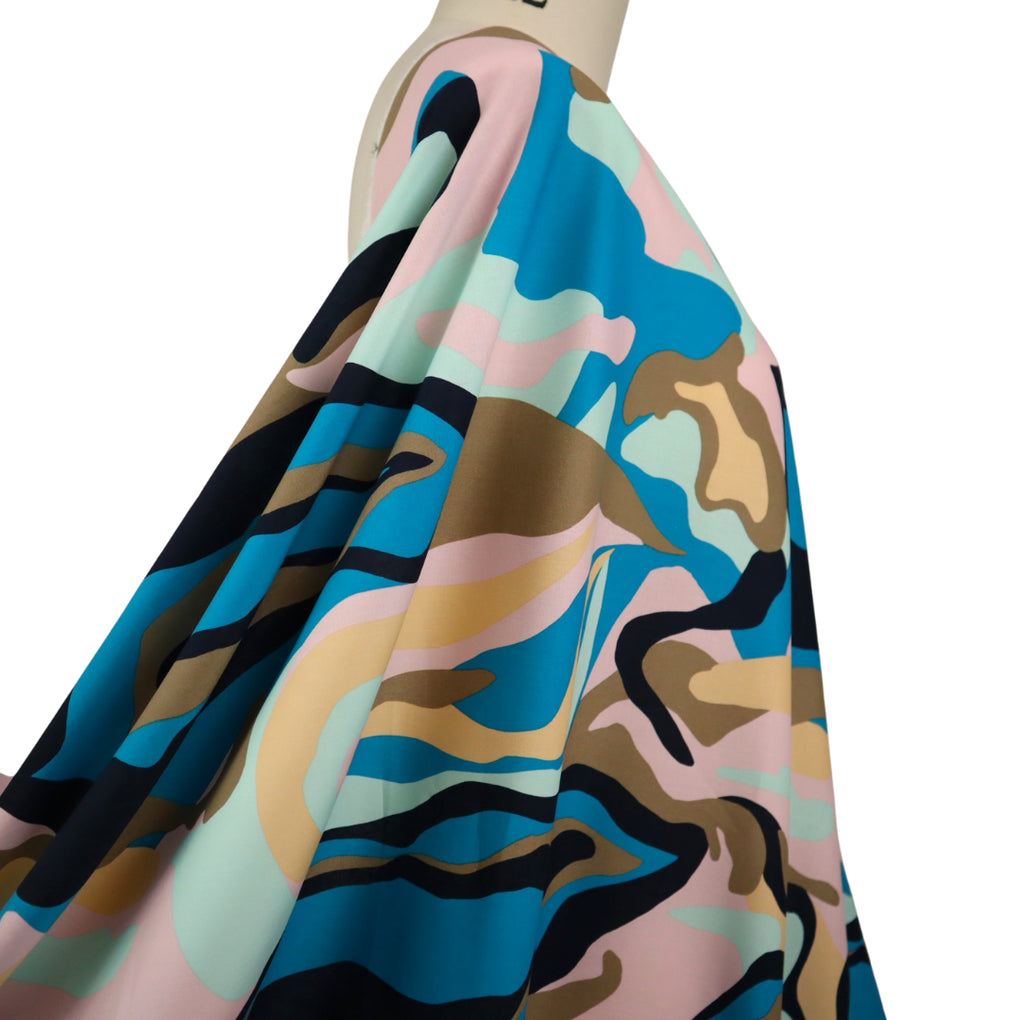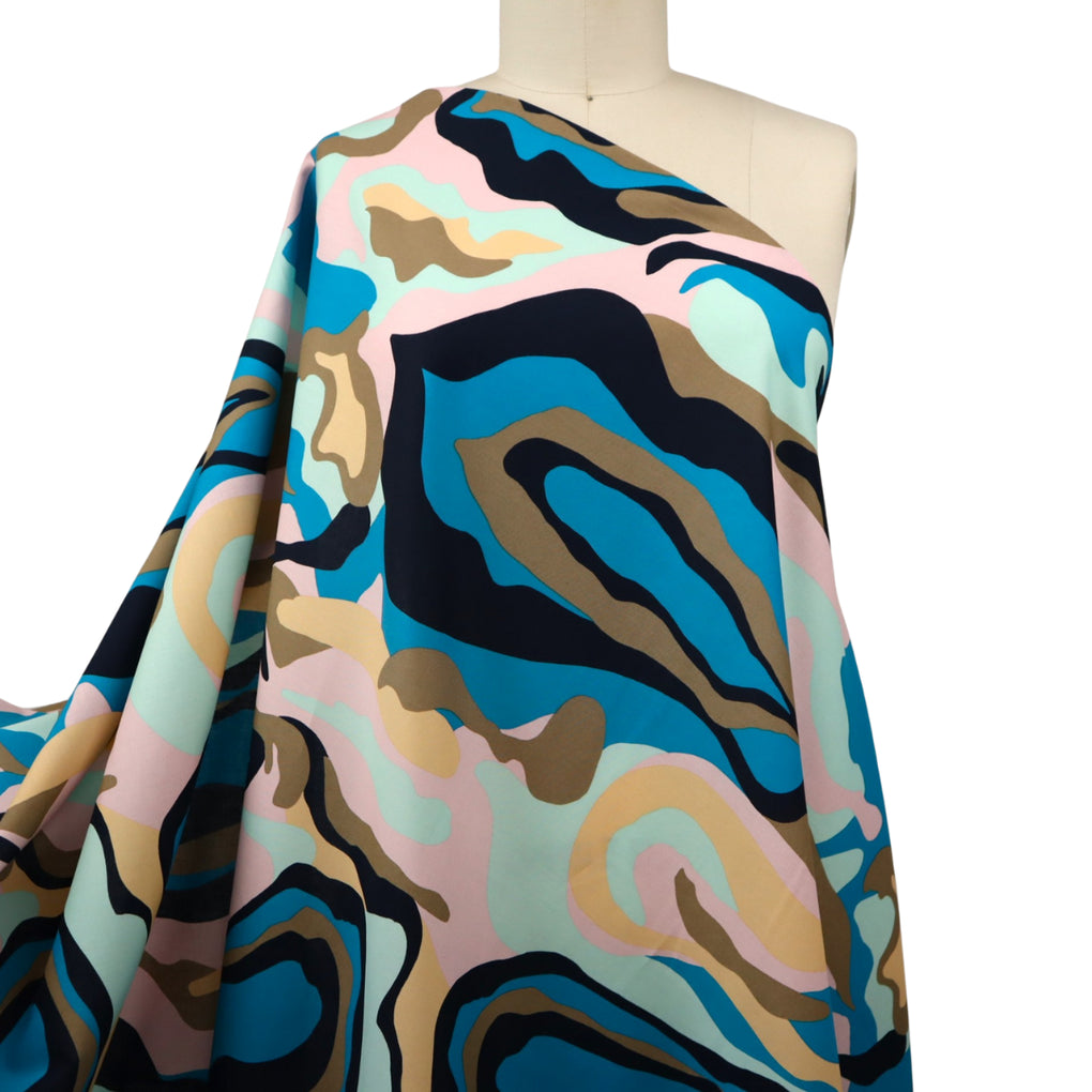 What a dreamy take on a camo print. It has the more pronounced marble effect, and the swirling design is on a striking larger scale. The colour combo is sensational, with the taupe, mint, pale pink, beige and black accompanying the gorgeous teal colour. This is a light weight stretch cotton. It has a nice amount of give across the grain, but just choose the same sort of patterns as you would for a poplin. The only way the stretch will be a factor is if you wanted a fitted blouse (for example). This is perfect for dresses, blouses, shirts, loose or straight pants, skirts and jumpsuits.