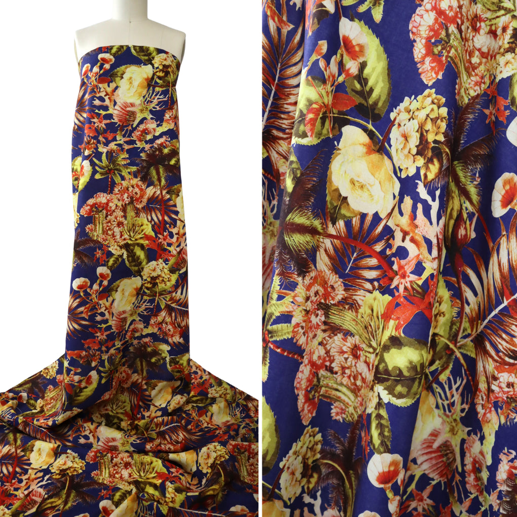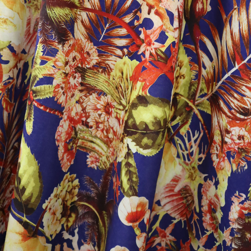 This version has a deep cobalt background, and the colour palette is warmer and muted. You’ll see an array of browns, reds, seaweed greens, muted yellows and oranges, and variegations of pale ochre. There are even tiny moments of pale pink. The shells, seaweed, cacti and array of blooms are still there (as per the original colourway), but it looks like another world.