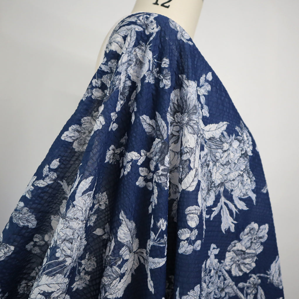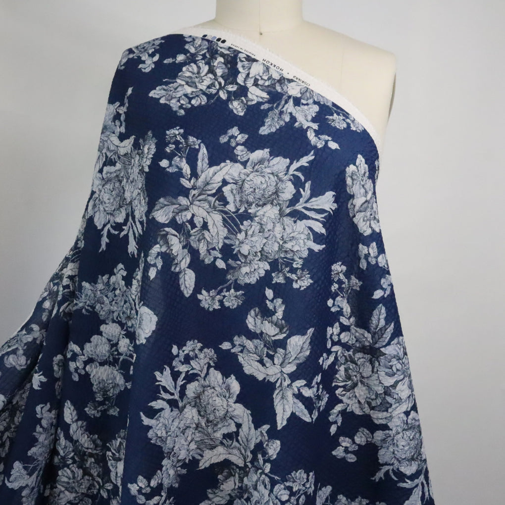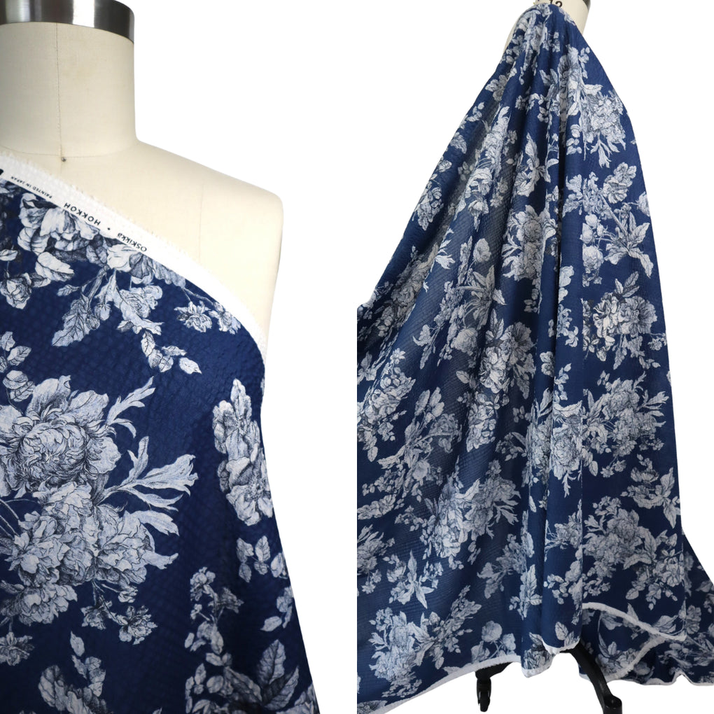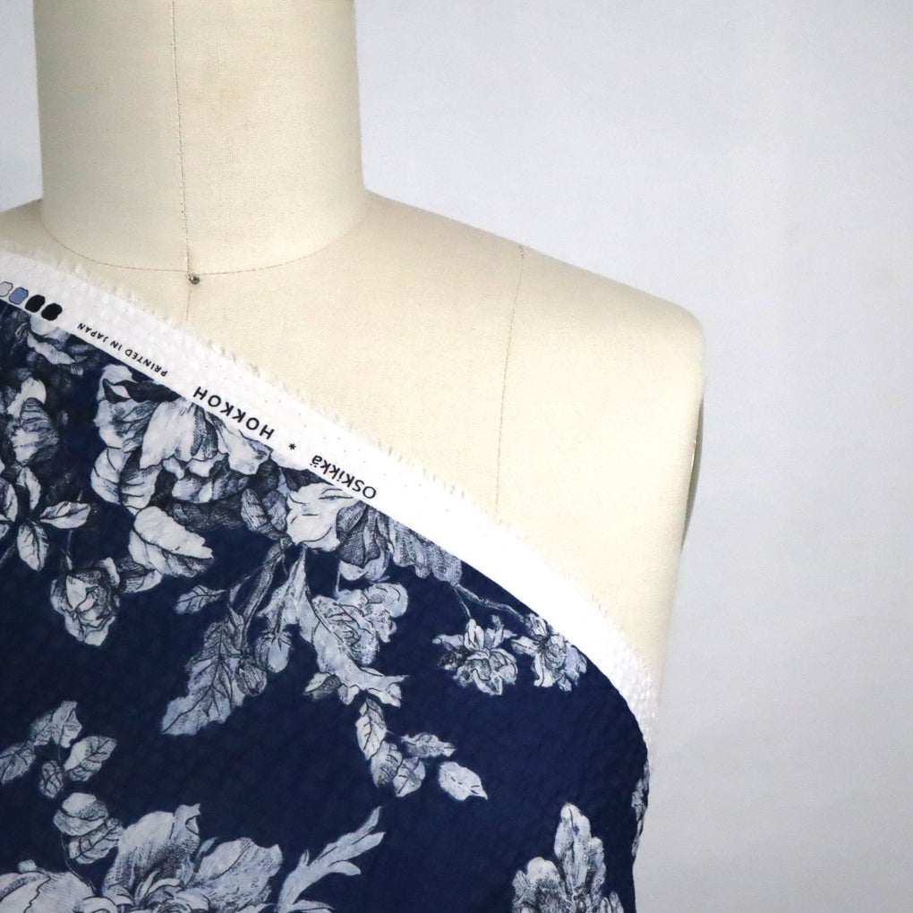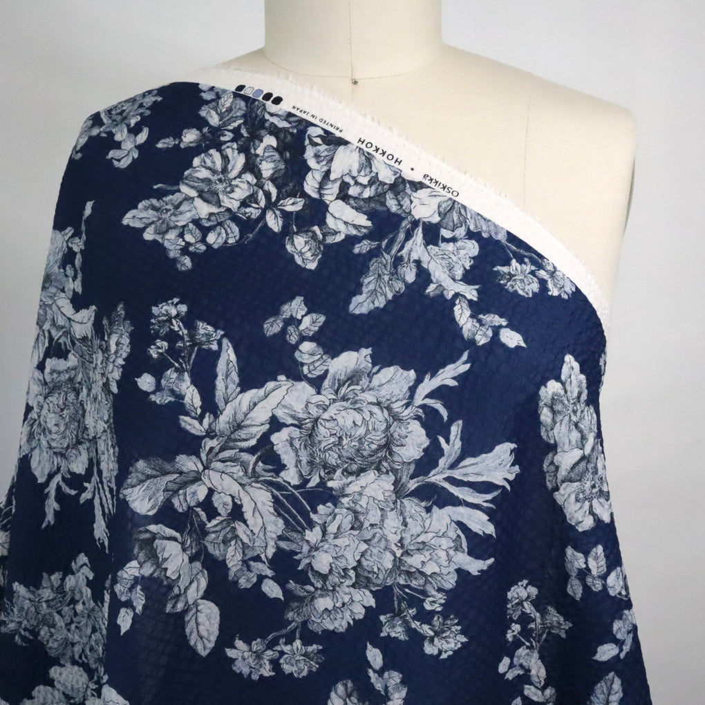 'Natsuki' is a dreamy Hokkoh seersucker. Not only is this a super soft, quality cloth, but the larger-scale floral is romantic and a unique design for a seersucker. The navy background isn't as dark as the 'Asuka' print, and the flowers and foliage are in a pencil, sketch style, with shading here and there in a bluish-grey. As per the other new Hokkoh seersuckers, the 'lines' are narrow and the profile is low, making this a cool and comfortable option for mid-summer. This is perfect for cool dresses, blouses, shirts, skirts and loose pants. Enjoy!