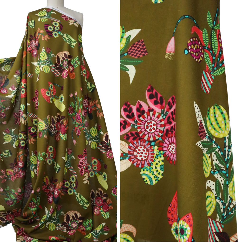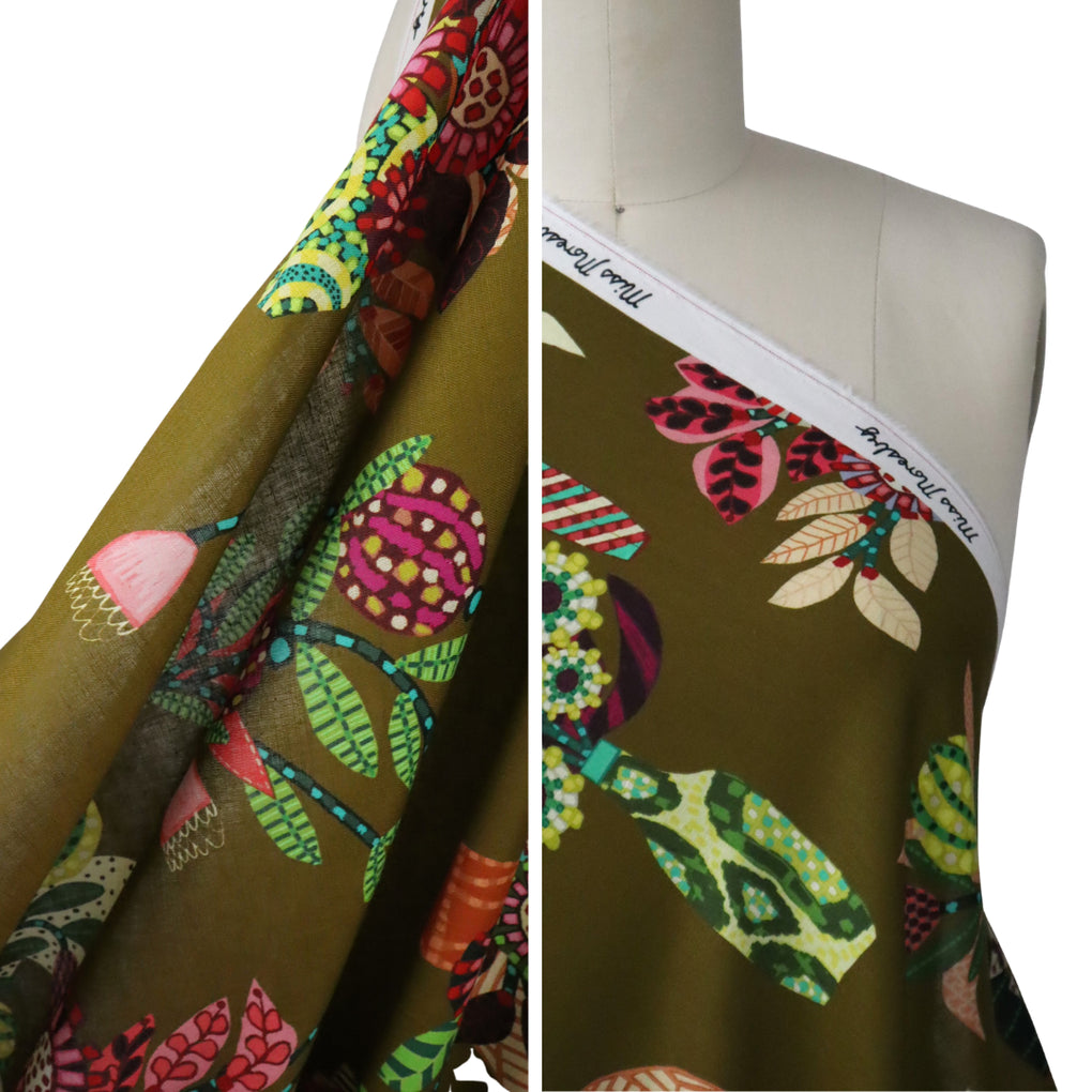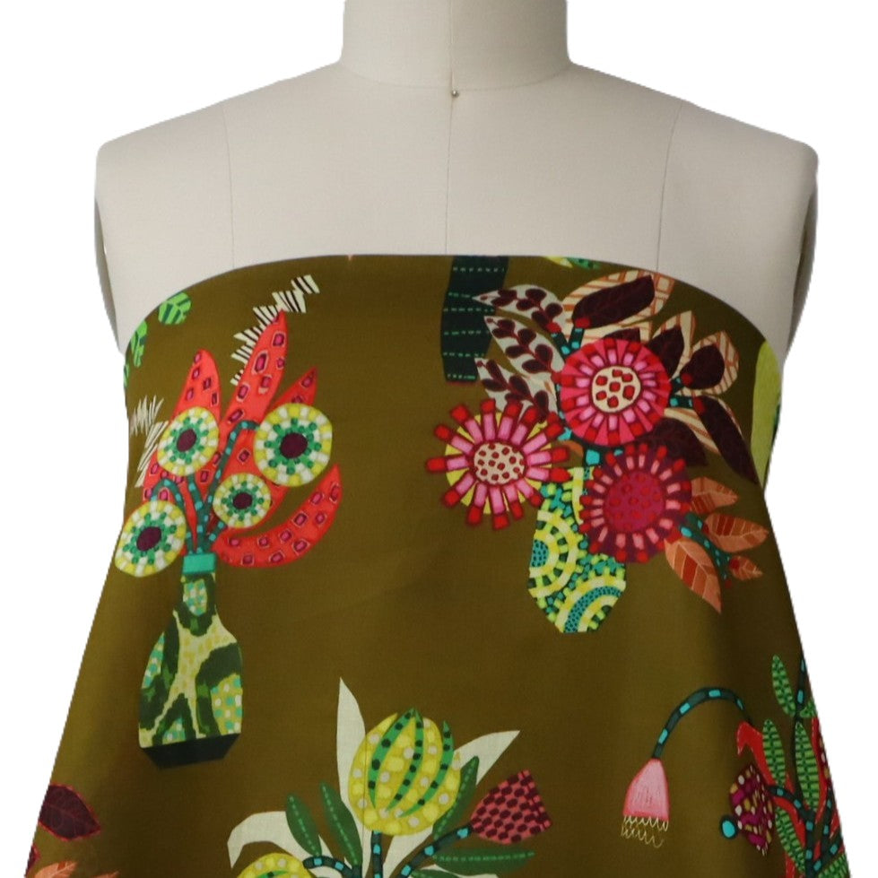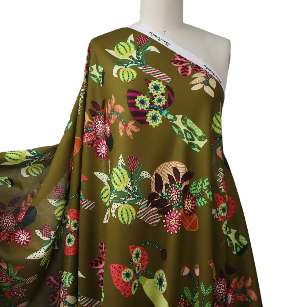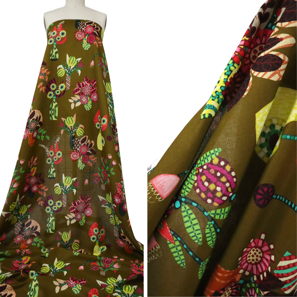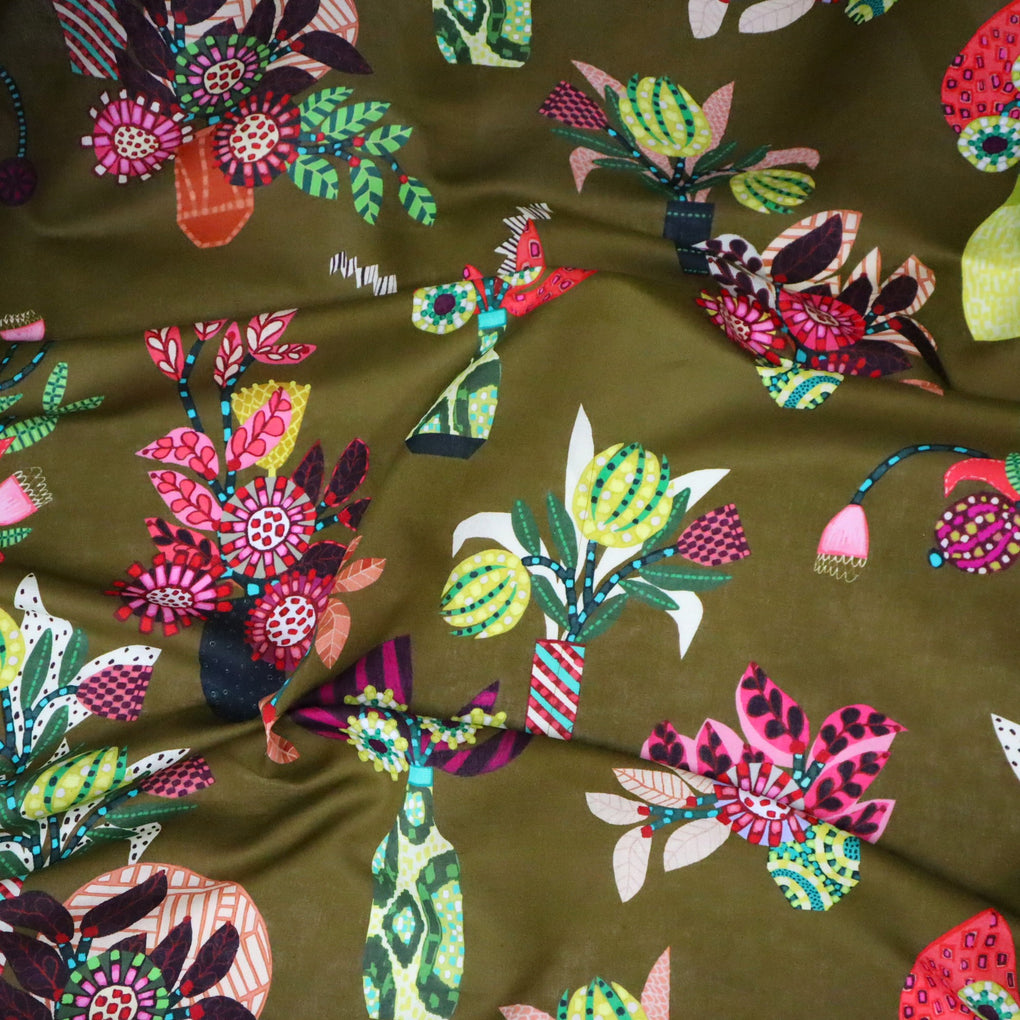 'Chennai' encapsulates Sarah's eye for colour. The amazing background hue is a hybrid of tan and chartreuse. It has a golden-olive tinge to it. It's so hard to describe, but I feel the images do it justice. The design is directional, and you'll see and assortment of flowers and foliage in the Miss Moresby signature style of creating patterns within a petal, or leaf, or stem. I love the incorporation of vases, which are also adorned with their own unique patterns. This is so unique, and I think you'll love it. You might consider mixing this with the 'Oaxacal' print. The chartreuse is a bit light in the zigzag 'Oaxacal' design, but they work really well together.