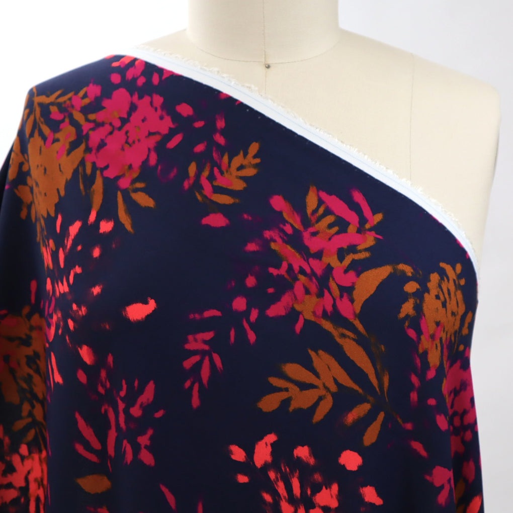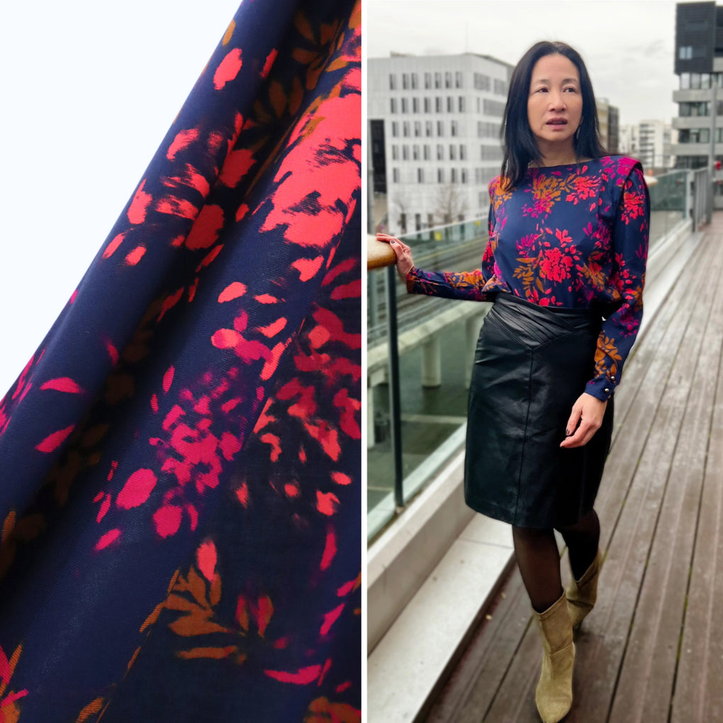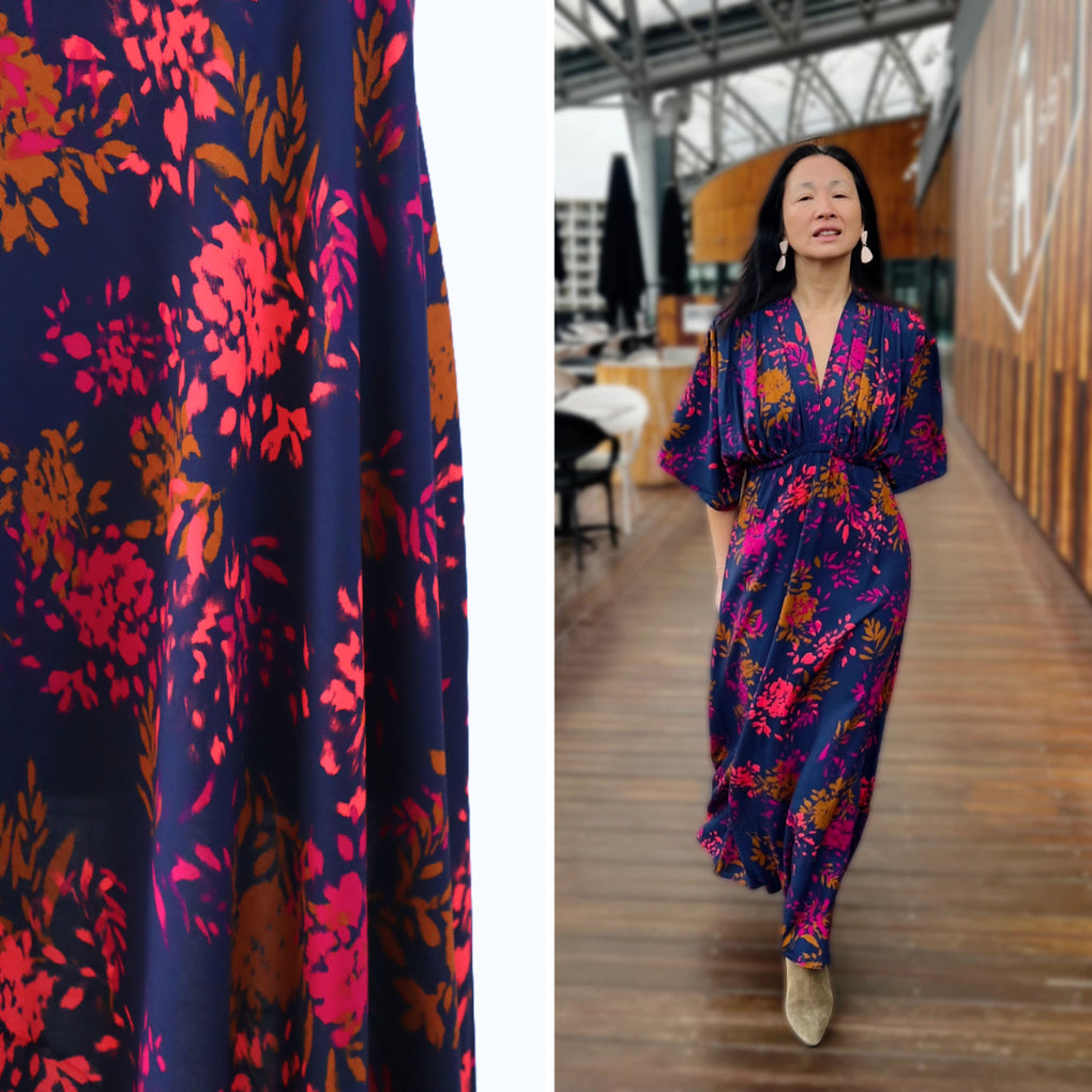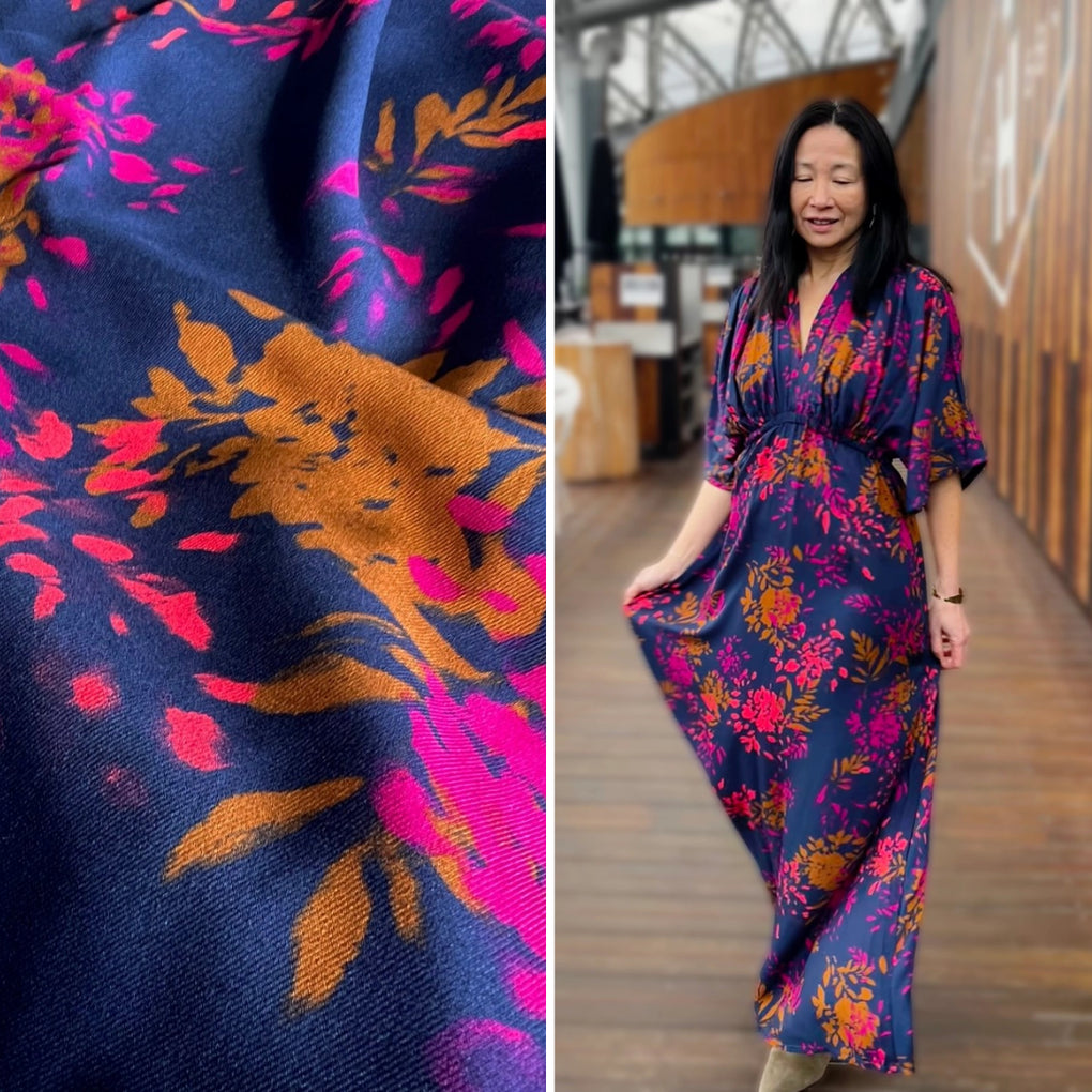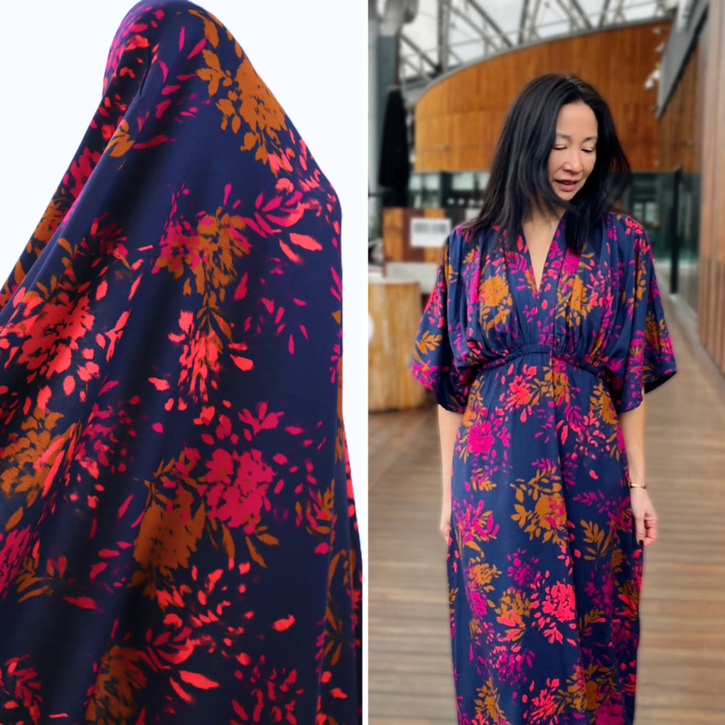 The 'Elena' viscose twill combines gorgeous bursts of coral and pink alongside ochre-brown, on a classic navy background. The cloth is 120gsm, which gives lovely drape with a little weight.  This is perfect for blouses, dressed, loose pants and skirts.  The colours are perfect for any time of year, and it will team well with black, navy, denim, white and ochre. I also think khaki and olive would be great partners to this unique print.