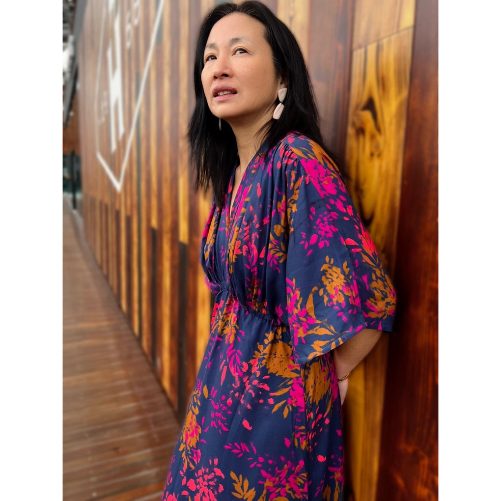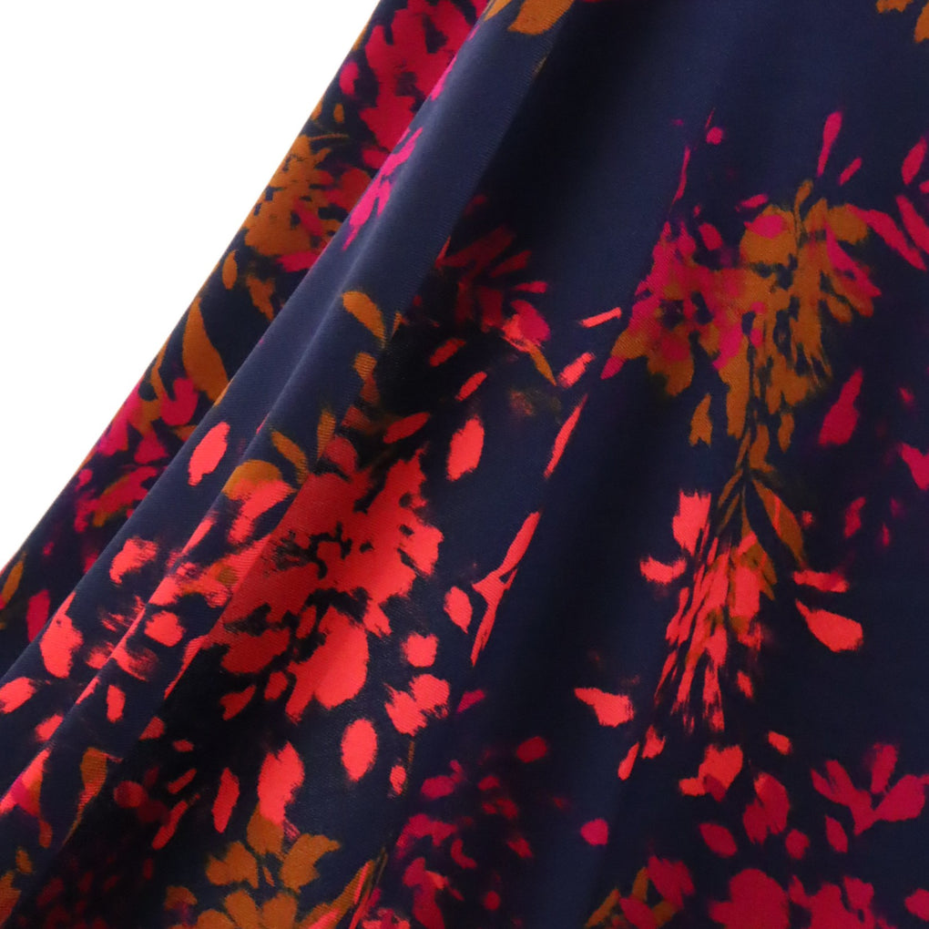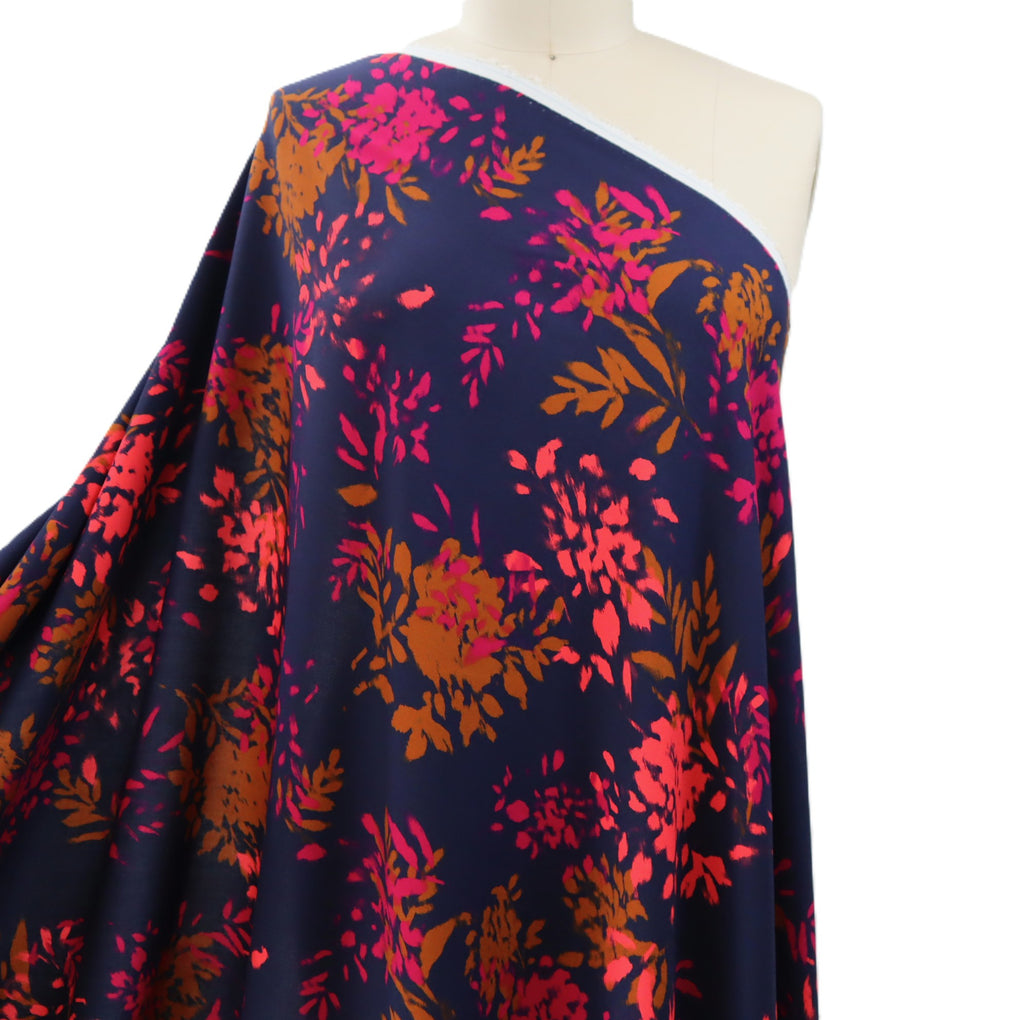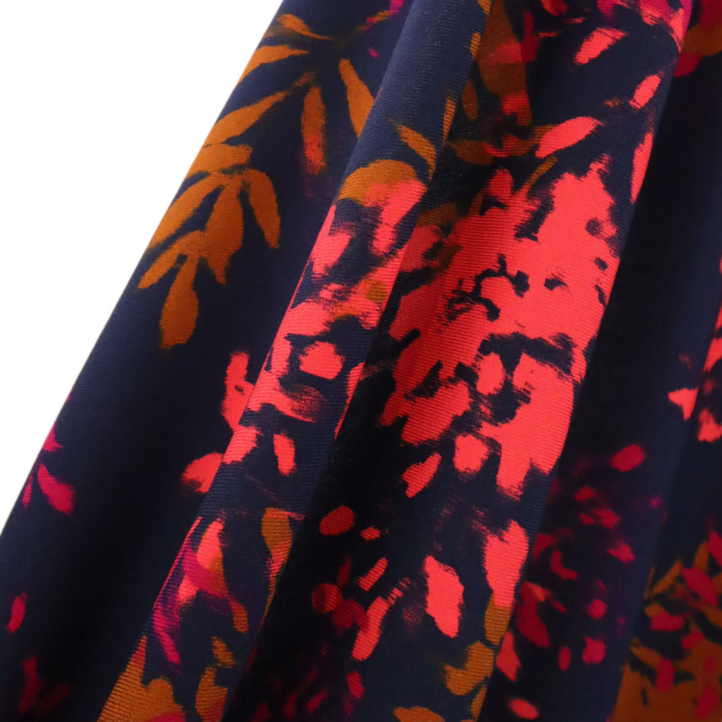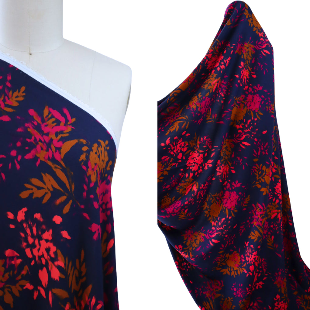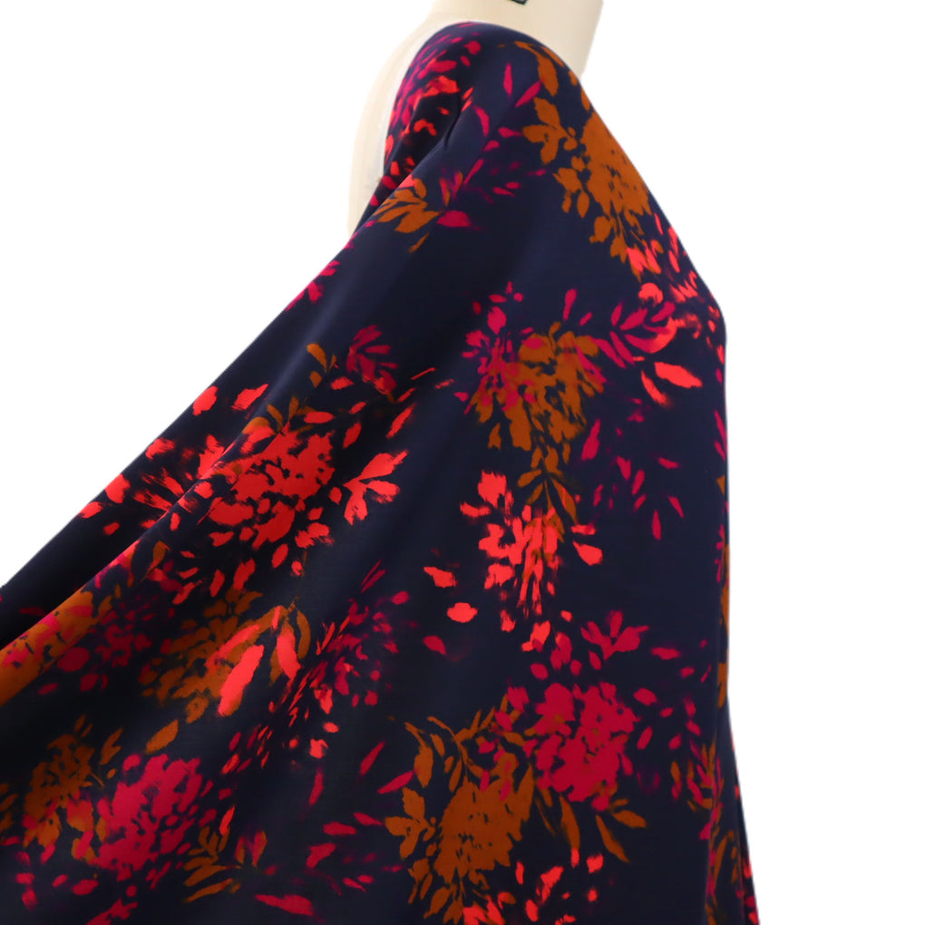 The 'Elena' viscose twill combines gorgeous bursts of coral and pink alongside ochre-brown, on a classic navy background. The cloth is 120gsm, which gives lovely drape with a little weight.  This is perfect for blouses, dressed, loose pants and skirts.  The colours are perfect for any time of year, and it will team well with black, navy, denim, white and ochre. I also think khaki and olive would be great partners to this unique print.