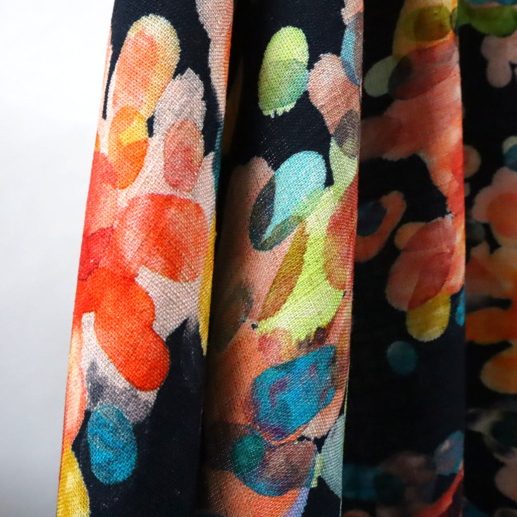 Fancy a bit of painted whimsy? I’m always quick to snap up this sort of print; with casual, colourful splatters of dots and dashes on a light or dark background. Despite the apparent irregularity of the artwork, the colours seem to fall in beautiful clusters that read as flowers. This is a new Viscose Linen fabric for Cloth Edit. It’s a 70% Viscose and 30% Linen blend. The weave is on the finer side with a little texture from the linen, and you can see this in some of the close-up images. The drape is akin to a light-medium weight, drapey linen. The viscose | linen blend is a great combination of fibres; perfect for all manner of garments: blouses, shirts, dresses, skirts, pants and shorts. I know you’ll love this.