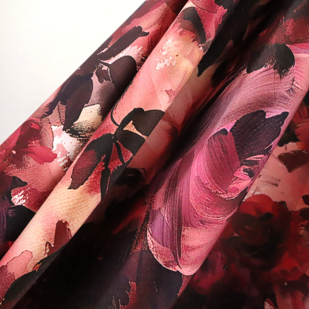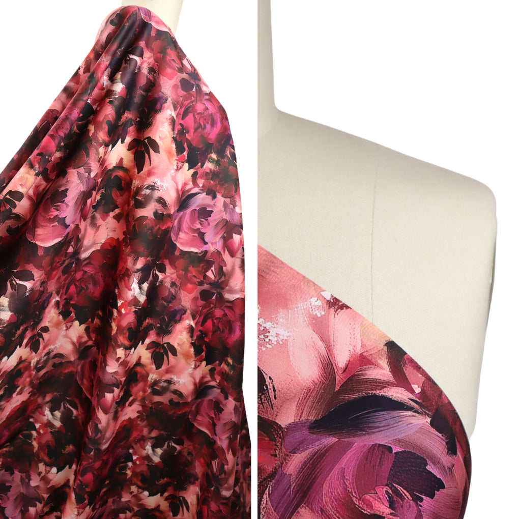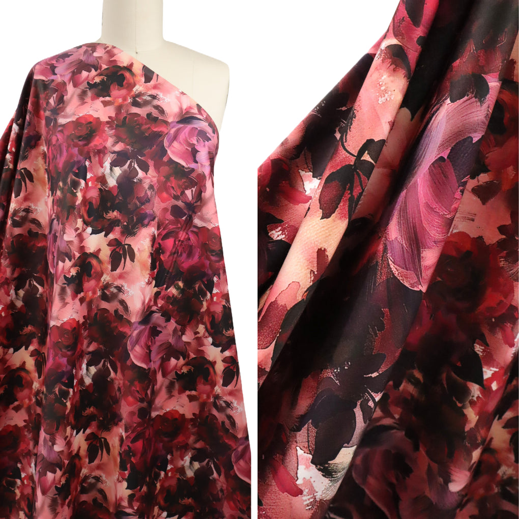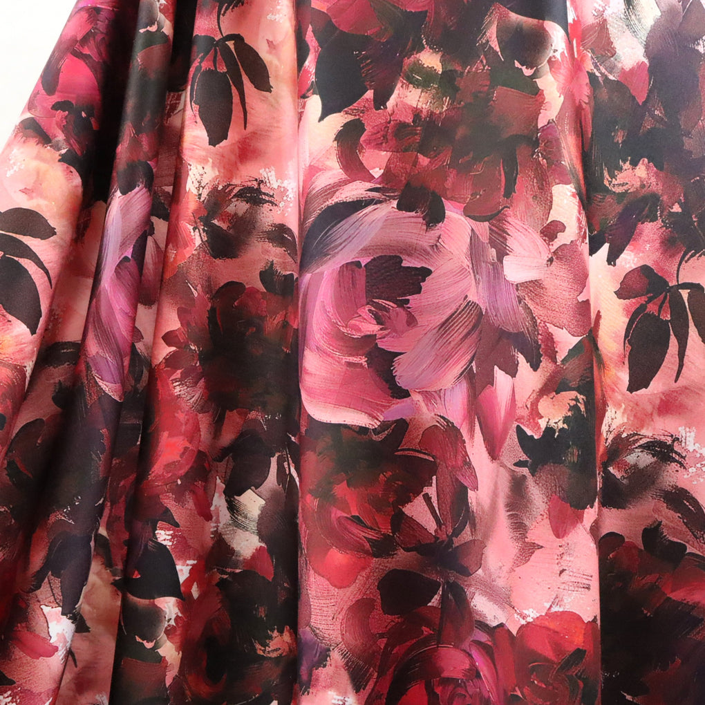 There's a stunning array of muted pinks and deep reds (with a touch of lavender) in this painterly style, abstract floral print. It also includes black, dark brown, and touches of white. The brush strokes look so casual and random, but their assembly produces the most amazing carpet of blooms, alongside the moody dark foliage. It's a sublime design, and perfect for all-year-round.