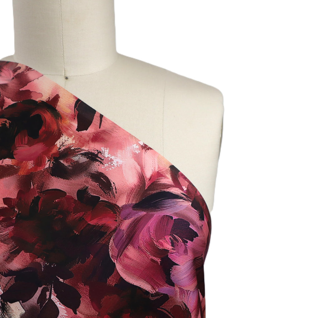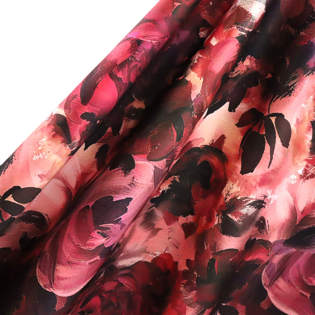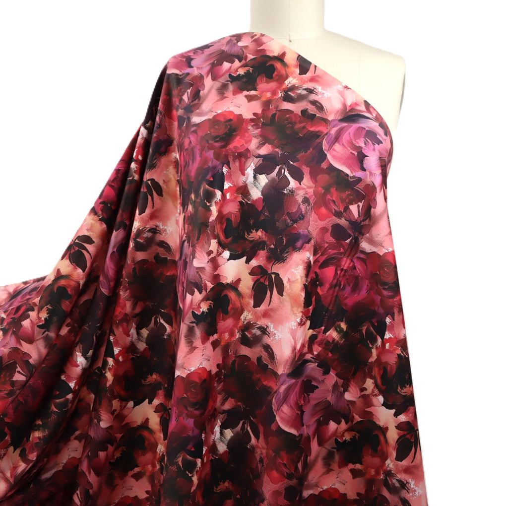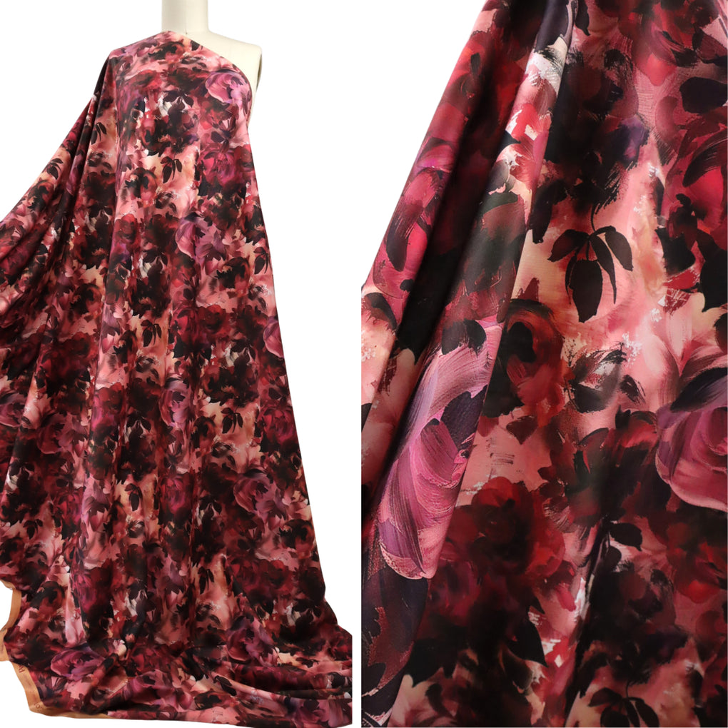 There's a stunning array of muted pinks and deep reds (with a touch of lavender) in this painterly style, abstract floral print. It also includes black, dark brown, and touches of white. The brush strokes look so casual and random, but their assembly produces the most amazing carpet of blooms, alongside the moody dark foliage. It's a sublime design, and perfect for all-year-round.