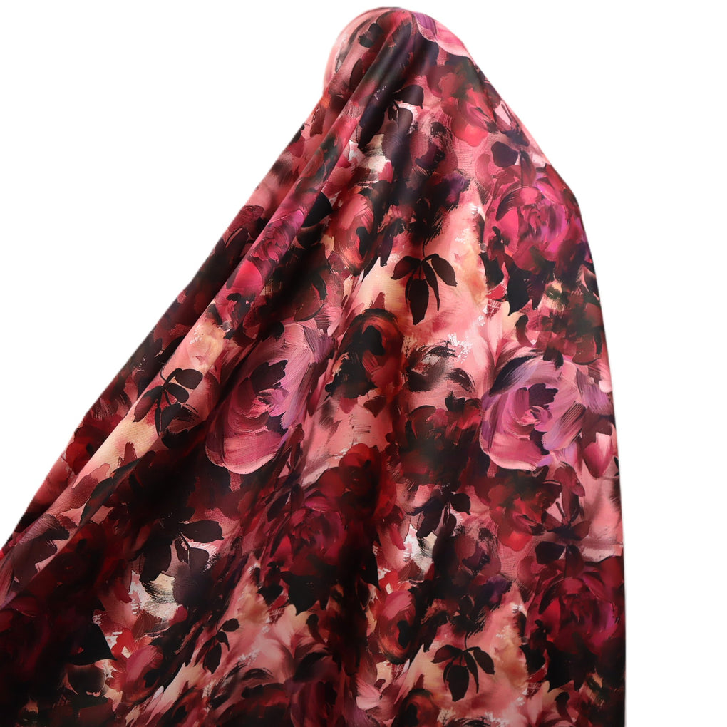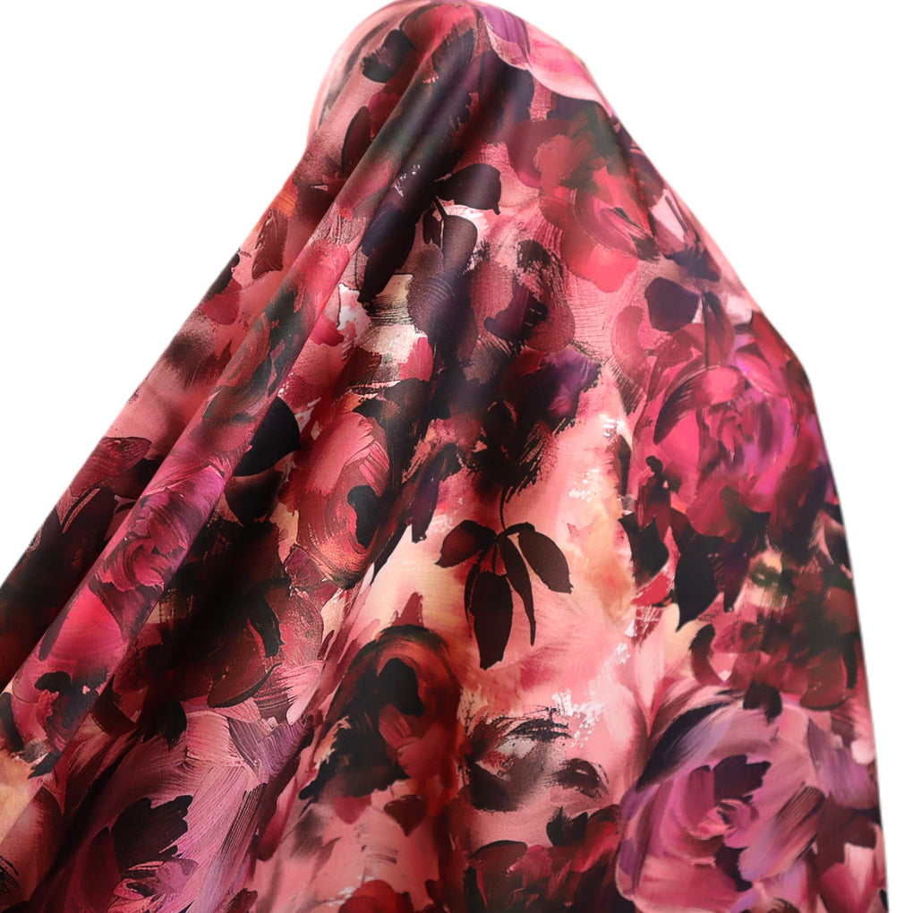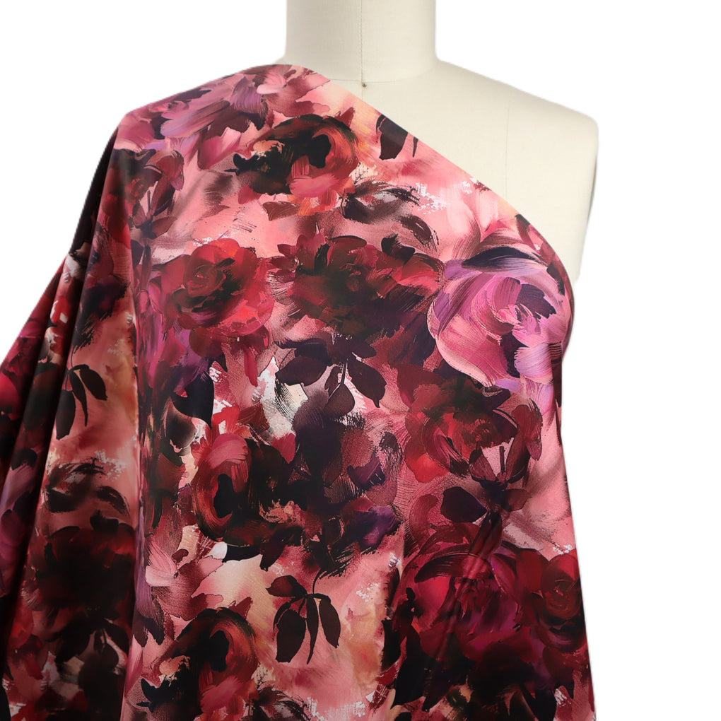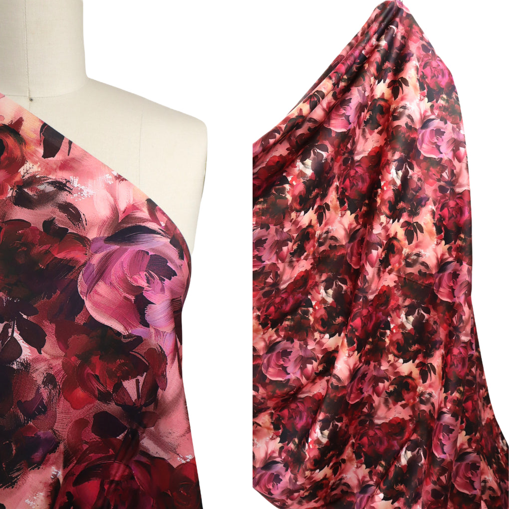 There's a stunning array of muted pinks and deep reds (with a touch of lavender) in this painterly style, abstract floral print. It also includes black, dark brown, and touches of white. The brush strokes look so casual and random, but their assembly produces the most amazing carpet of blooms, alongside the moody dark foliage. It's a sublime design, and perfect for all-year-round.