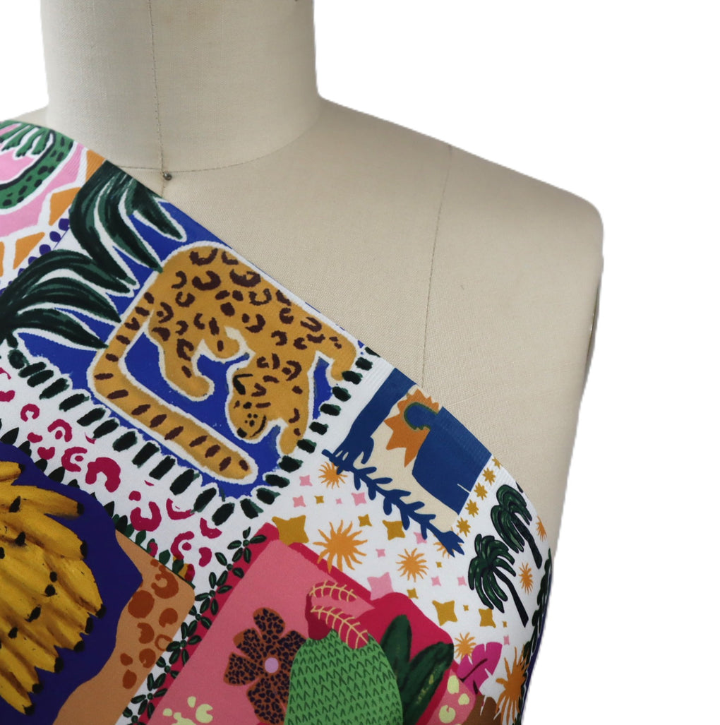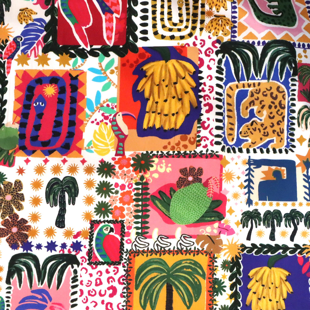 It was lovely to come across this version of a ‘postcard’ style print. It’s resplendent with tropical motifs, and perfect for summer dresses, tops, shirts, skirts or loose pants. In addition to palm trees and other tropical foliage you’ll see crocodiles, leopards, snakes, bananas, parrots, and a human form. You’ll have fun exploring all the features of this print. The colour palette is unique, combining purples, pinks, orange and cobalt with some ochre and olive greens. The background is white, which keeps the design fresh and summery.