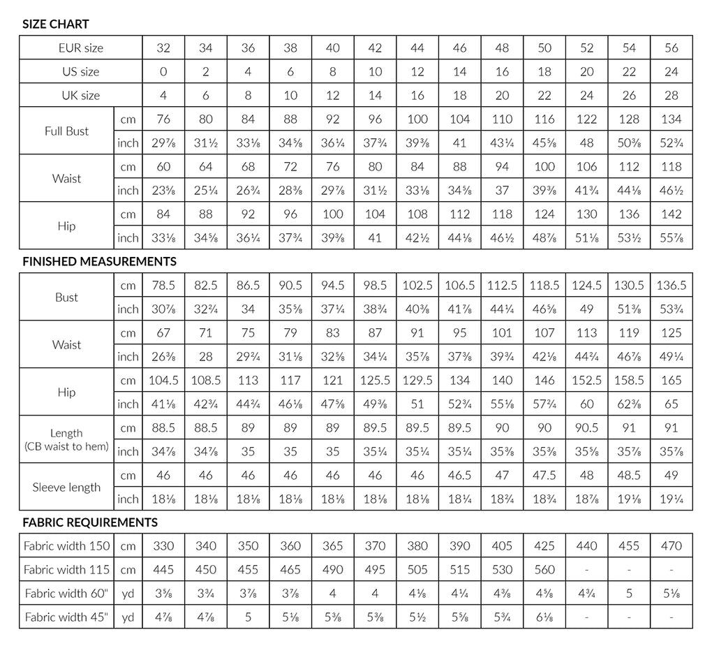 The size range is: EUR 32-56 | US 0-24 | UK 4-28 |