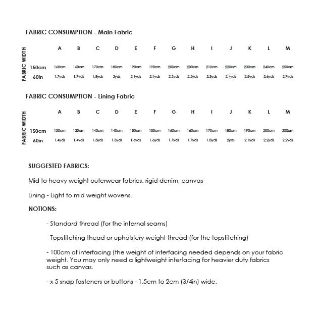 Main Fabric:  Mid to heavy weight outerwear fabrics - rigid denim, canvas