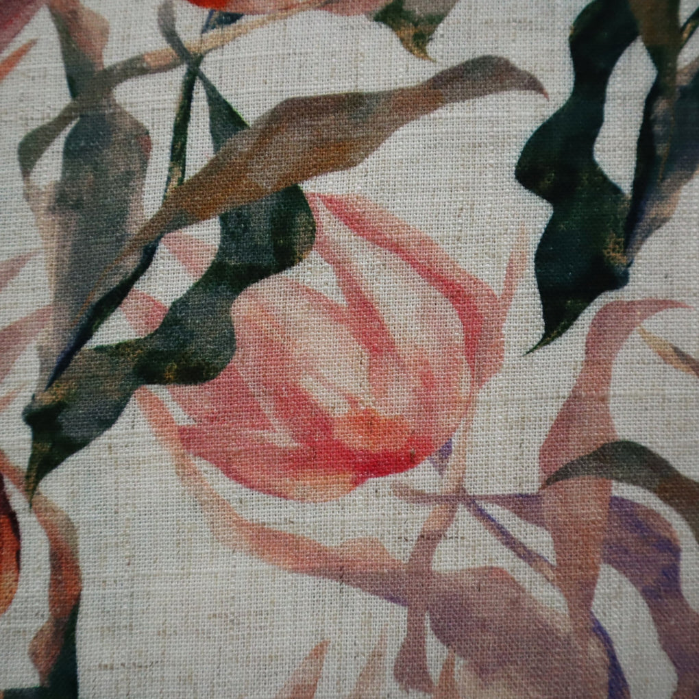 The Natural Colourway:  You'll love the variations of dark and pale dusky pink.  These hues are melded with a variety of taupes, and you'll also spot moments of rusty red, coral red, forest green and grey blue.  The colours rest perfectly on the natural background.