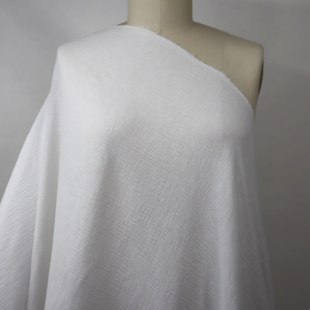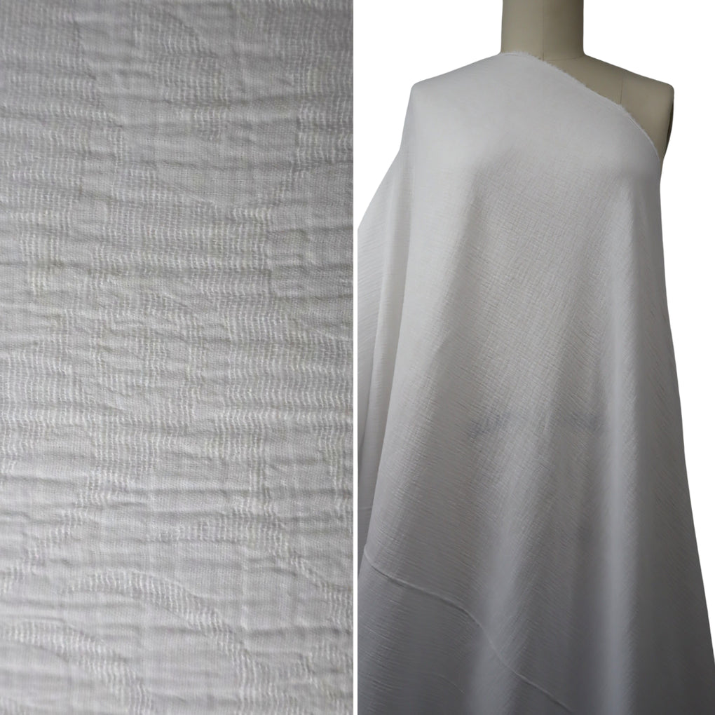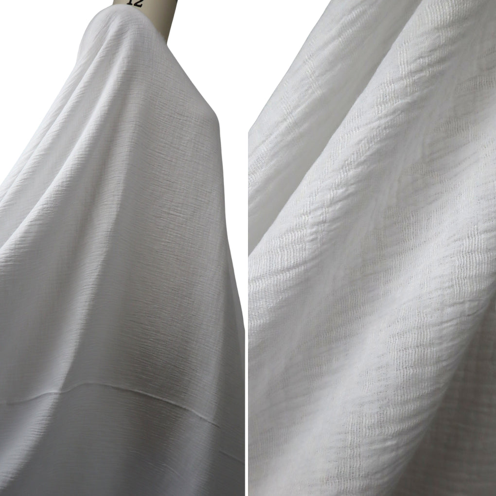 It's always a treat to find an unusual 'plain' fabric. 'Freyja' is a (snow) white cotton linen blend that has a similar crinkled look of a very high quality | good weight double gauze, but instead this is a gorgeous jacquard cloth. The jacquard pattern is almost imperceptible, but you'll see it in some of the close-ups. The weight is perfect for summer dress, pants, shirts, skirts and tops. It's a little bit transparent but it's not indecent. This is a dreamy option for mid-summer makes, or perfect for shirts in autumn.