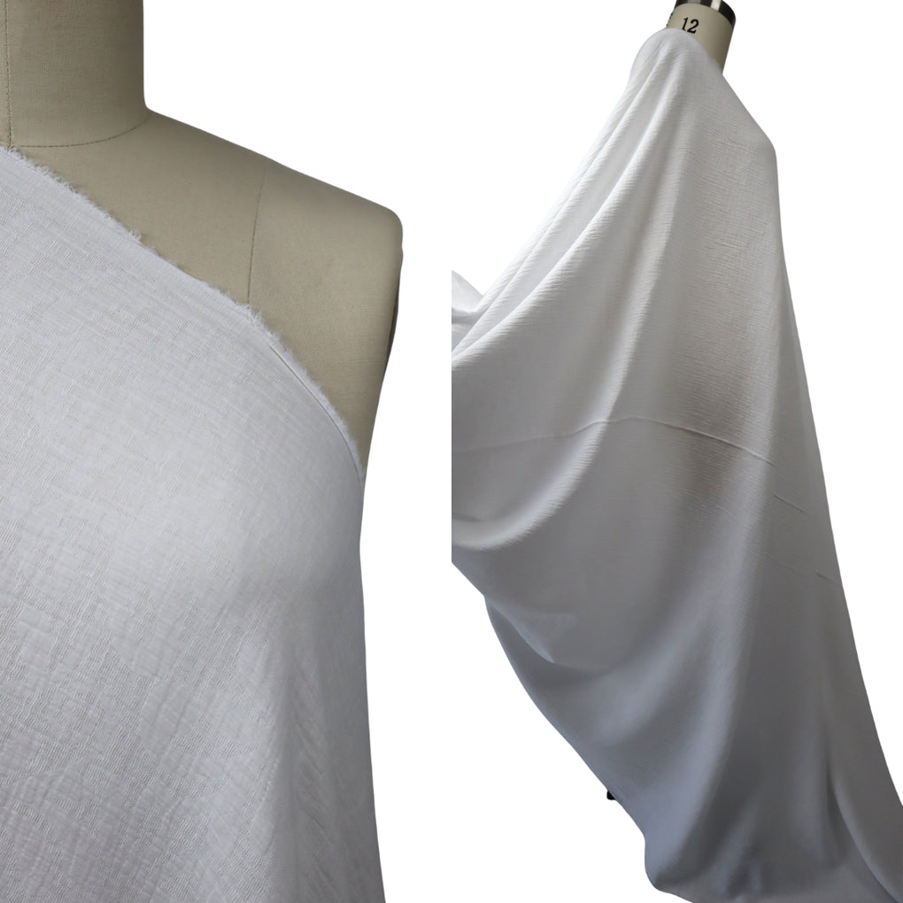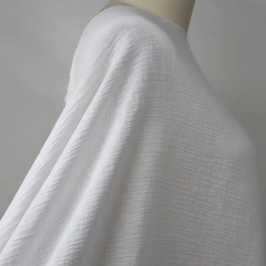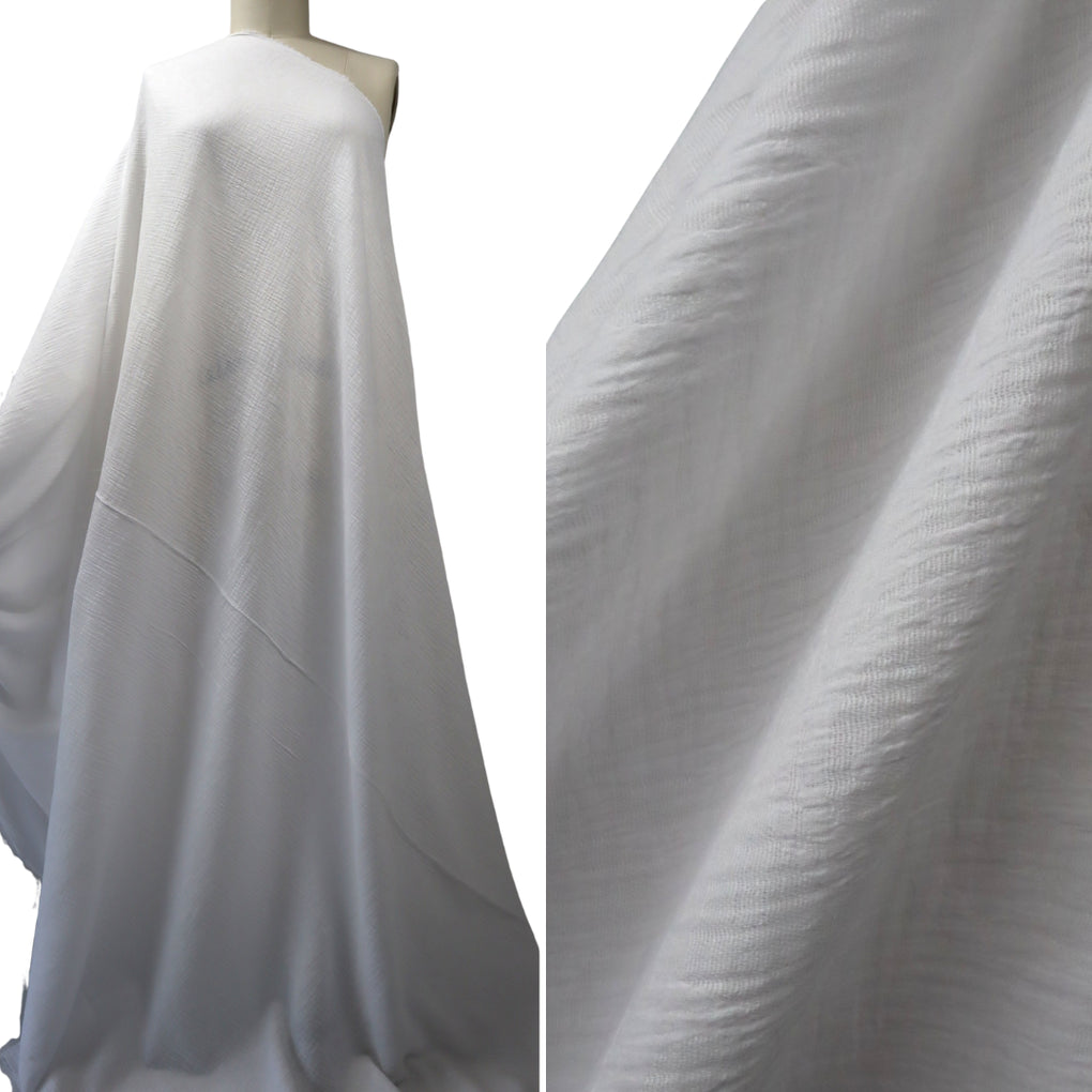 It's always a treat to find an unusual 'plain' fabric. 'Freyja' is a (snow) white cotton linen blend that has a similar crinkled look of a very high quality | good weight double gauze, but instead this is a gorgeous jacquard cloth. The jacquard pattern is almost imperceptible, but you'll see it in some of the close-ups. The weight is perfect for summer dress, pants, shirts, skirts and tops. It's a little bit transparent but it's not indecent. This is a dreamy option for mid-summer makes, or perfect for shirts in autumn.