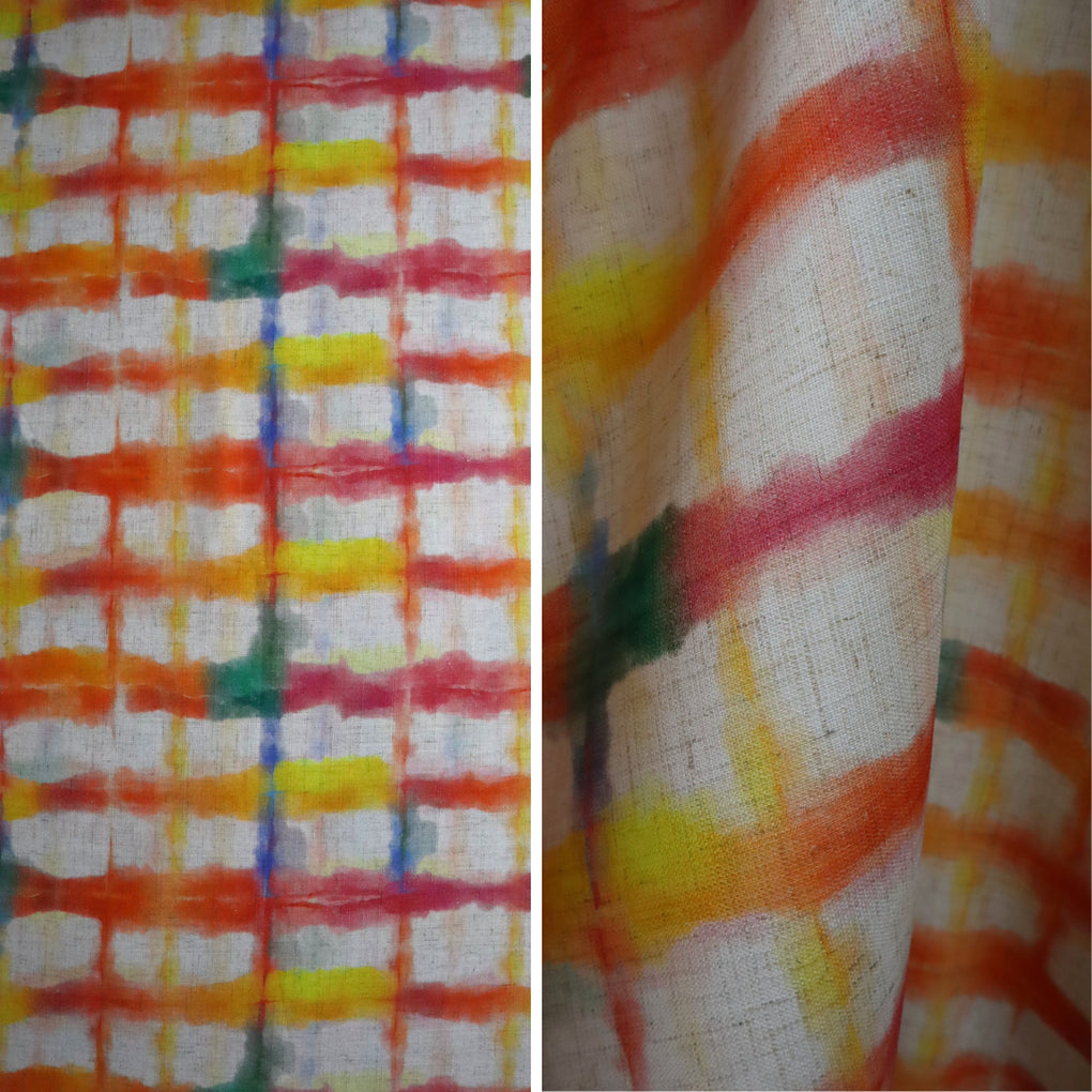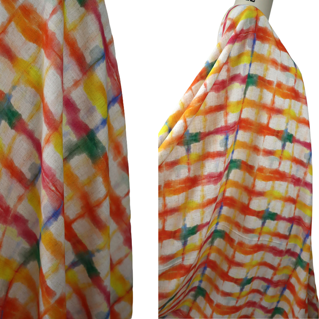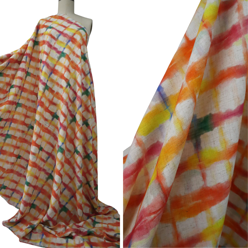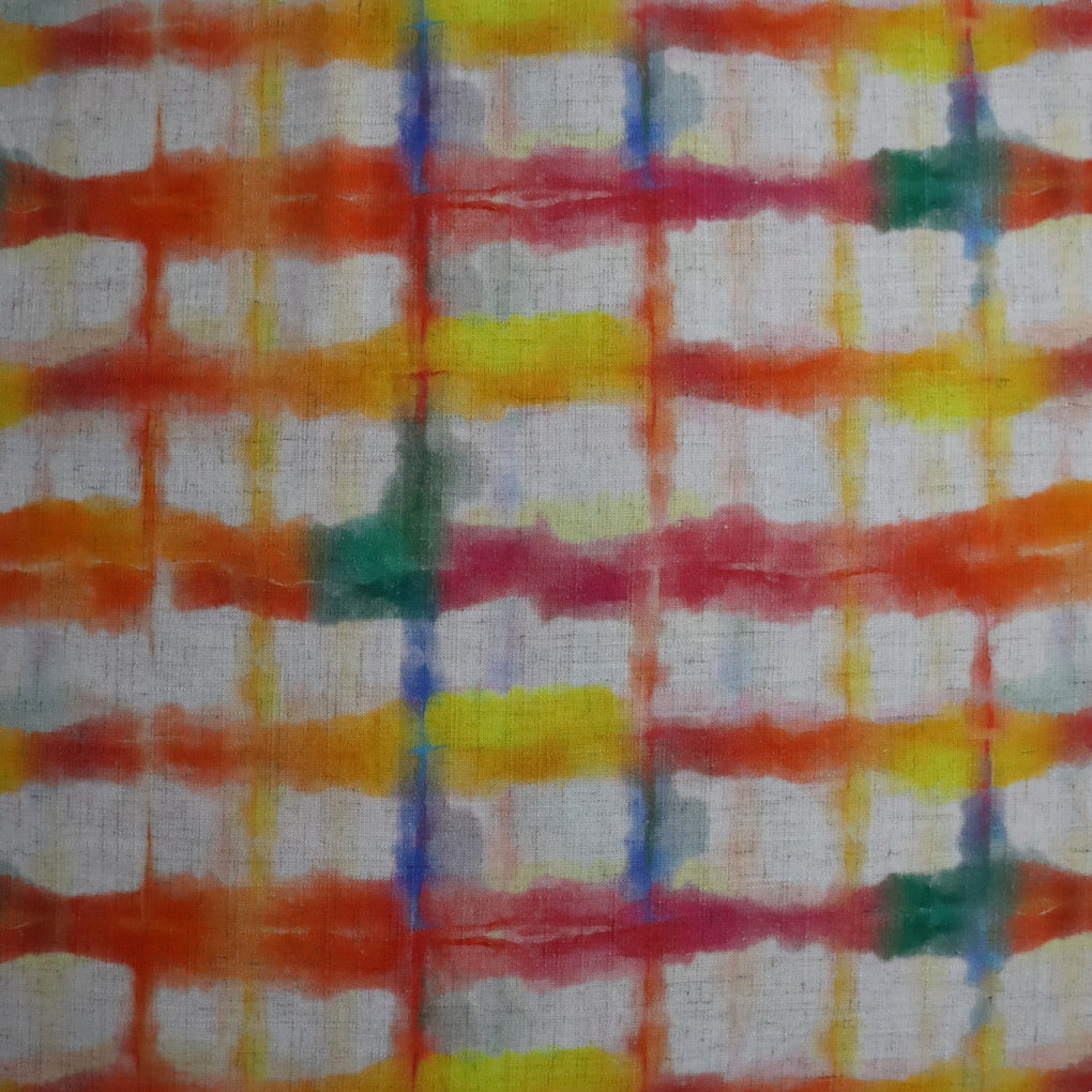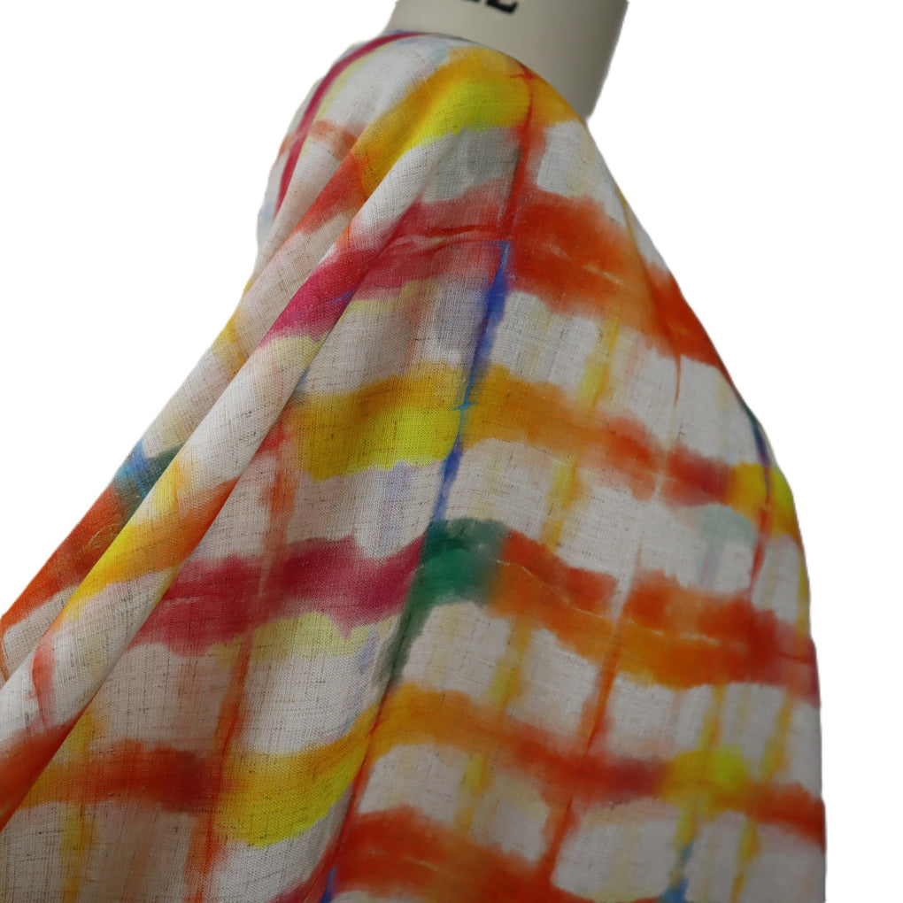 This grid design is a great alternative to a check. The blurred cobalt lines and strokes of jade green amongst the yellow, gold, raspberry and orange work so well. The natural background makes it perfect for a summer dress, pants or blouse, and it will look amazing with blue and green.