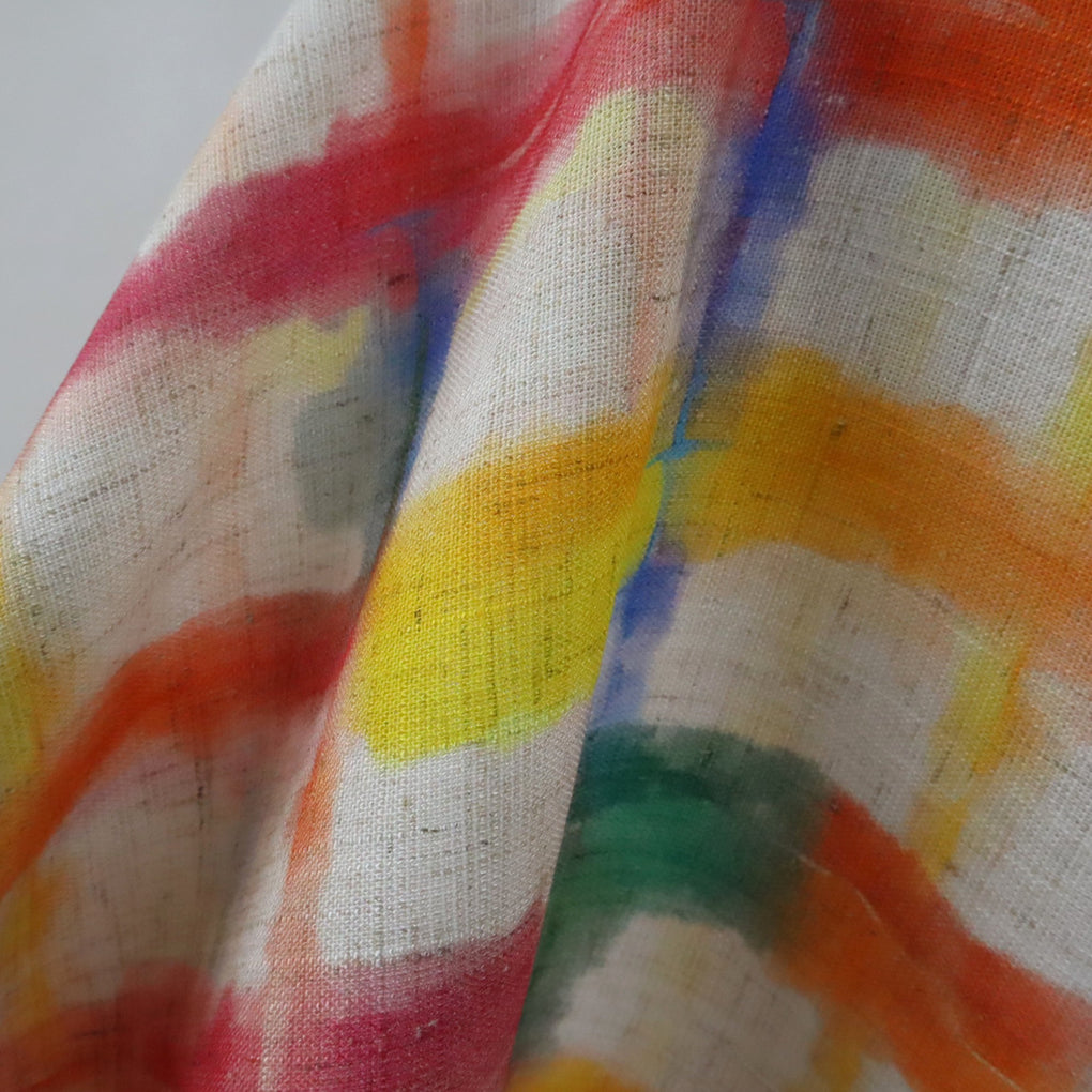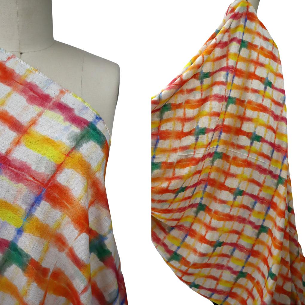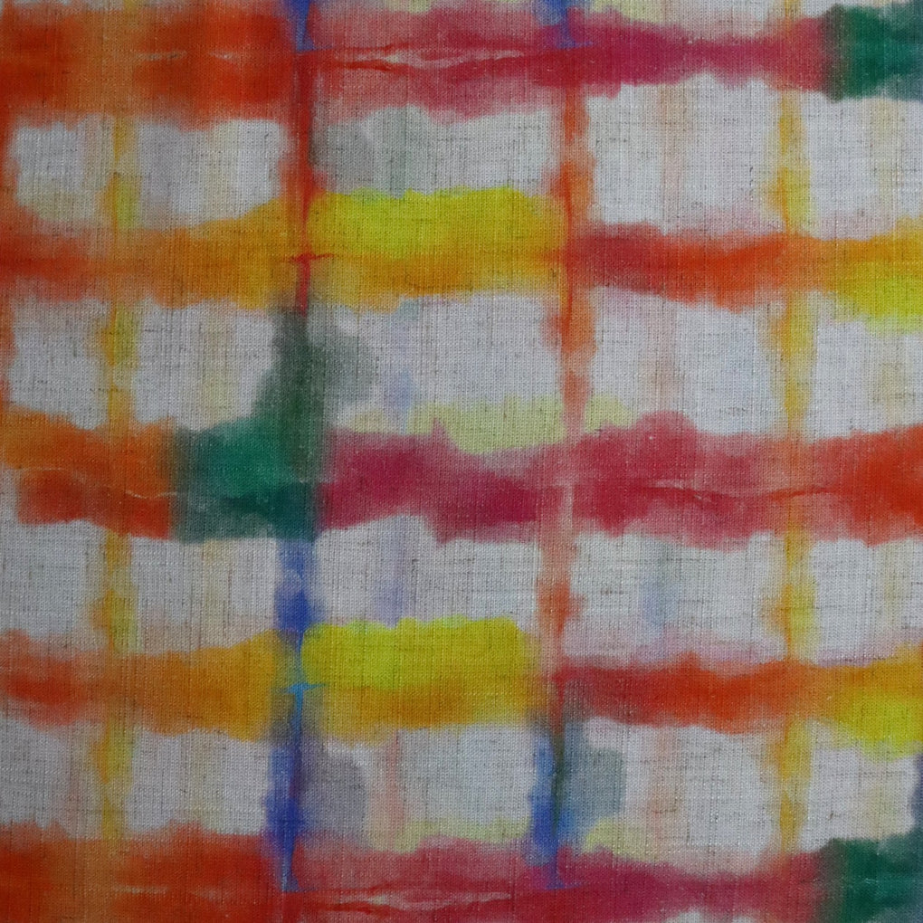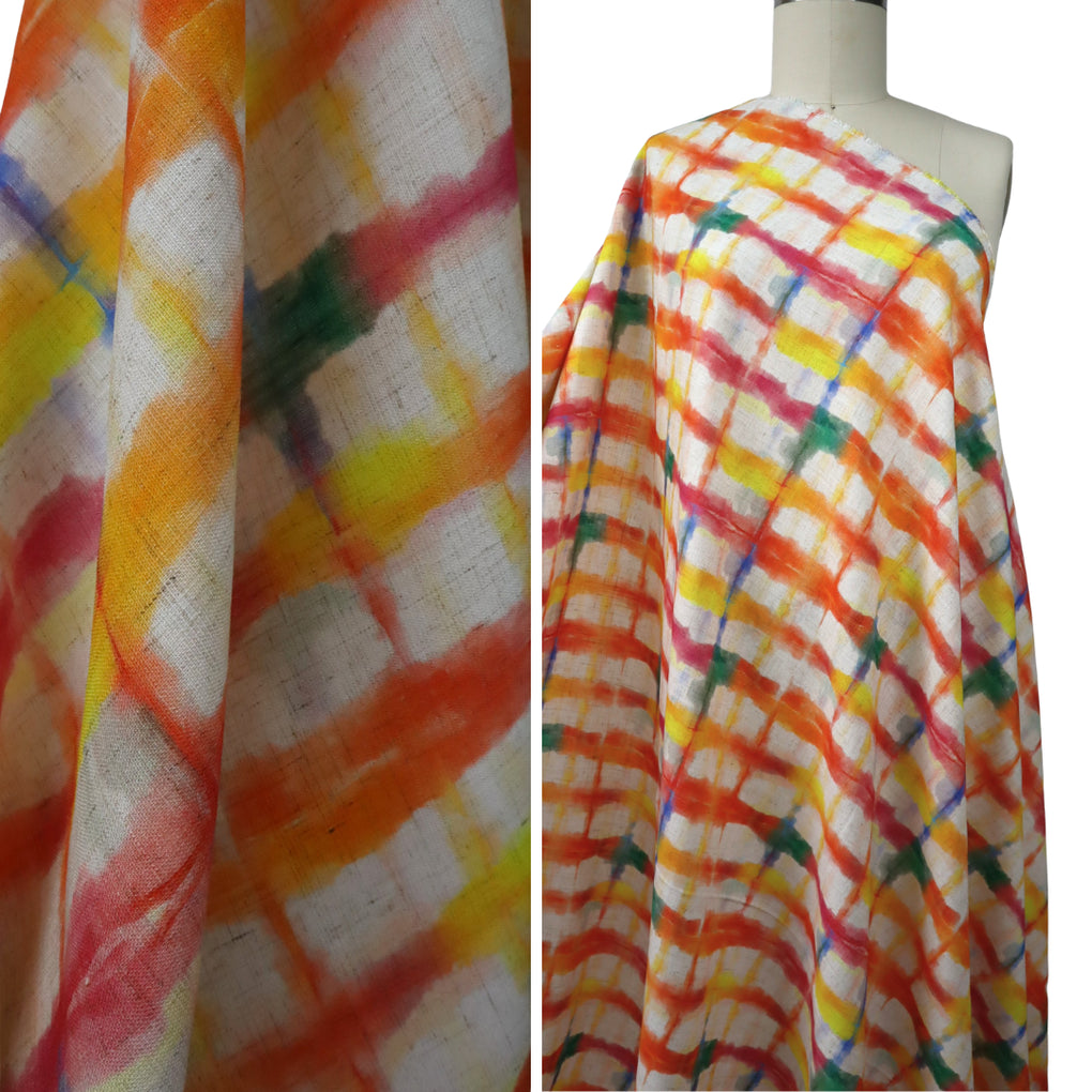 This grid design is a great alternative to a check. The blurred cobalt lines and strokes of jade green amongst the yellow, gold, raspberry and orange work so well. The natural background makes it perfect for a summer dress, pants or blouse, and it will look amazing with blue and green.
