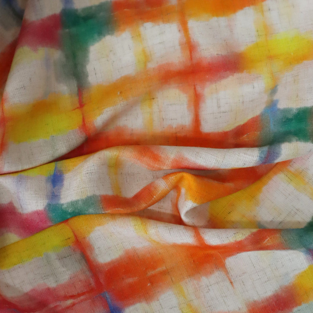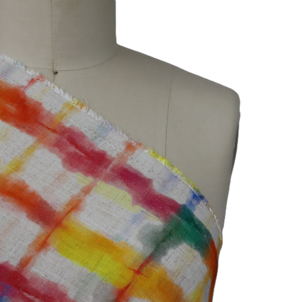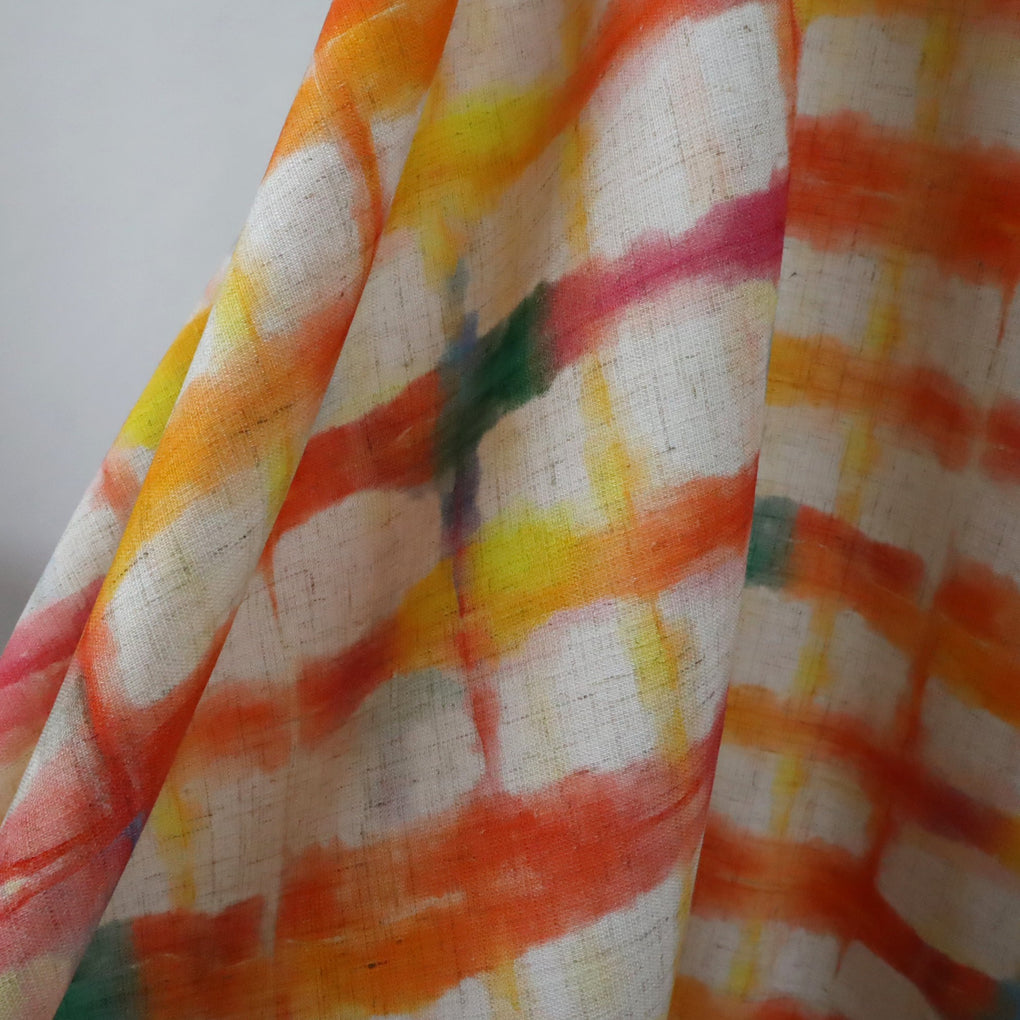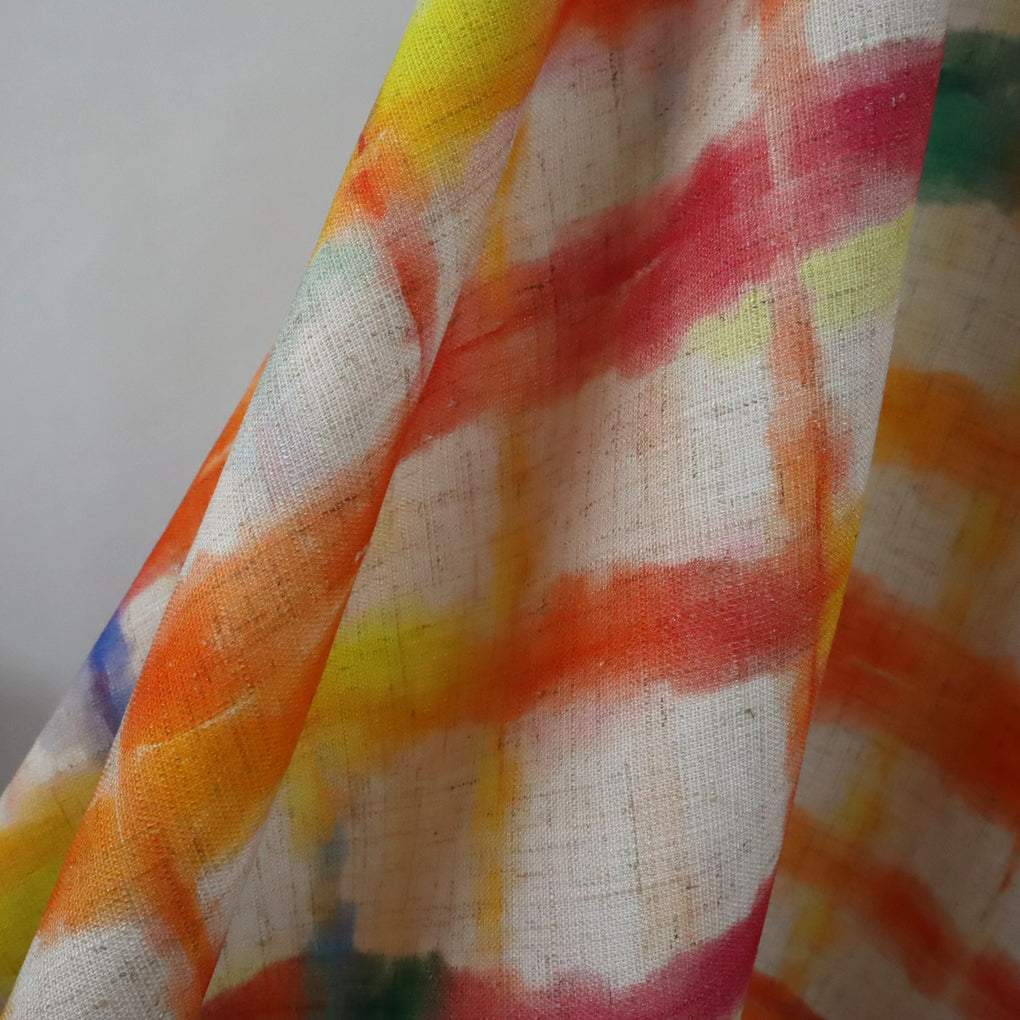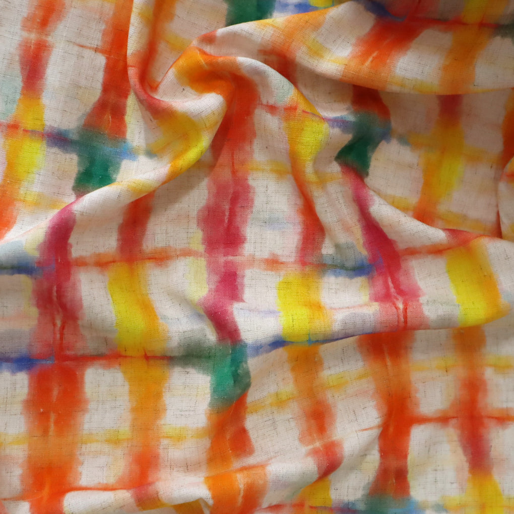 This grid design is a great alternative to a check. The blurred cobalt lines and strokes of jade green amongst the yellow, gold, raspberry and orange work so well. The natural background makes it perfect for a summer dress, pants or blouse, and it will look amazing with blue and green.