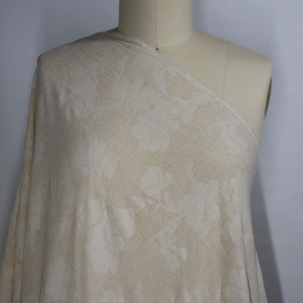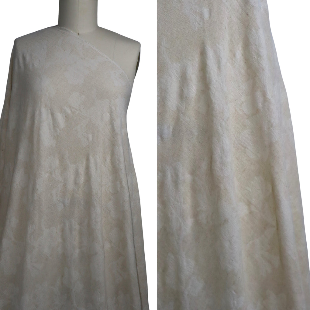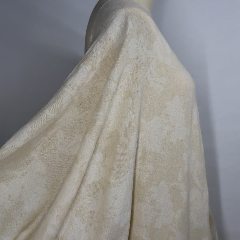 If you love understated, natural looking cloth, then this beautiful jacquard will have you saying 'Oui Oui' :-). This is a natural-on-natural floral jacquard, with a wonderful combination of cotton, linen and viscose. It feels soft, and has a desirable, slightly crumpled look. You'll notice that the floral design is more off white, and the background is more natural, complete with a slight texture. There is no stiffness, and it drapes in soft folds. This is a little lighter in colour when compared to the 'Dunes' Stonewashed linen, but it would pair beautifully. This is going to be gorgeous in blouses, shirts, loose pants, skirts, and dresses.