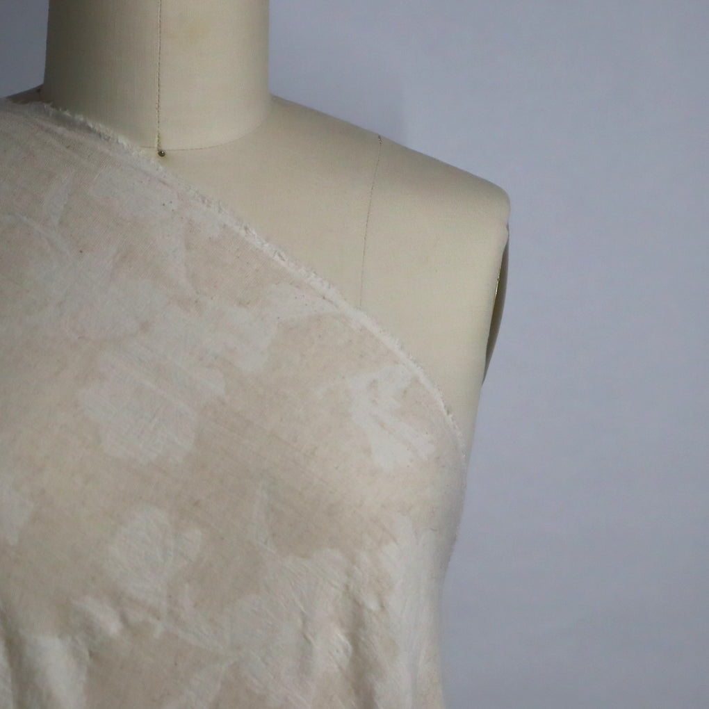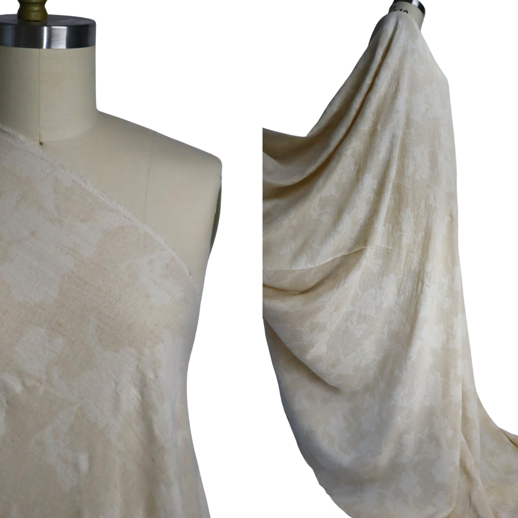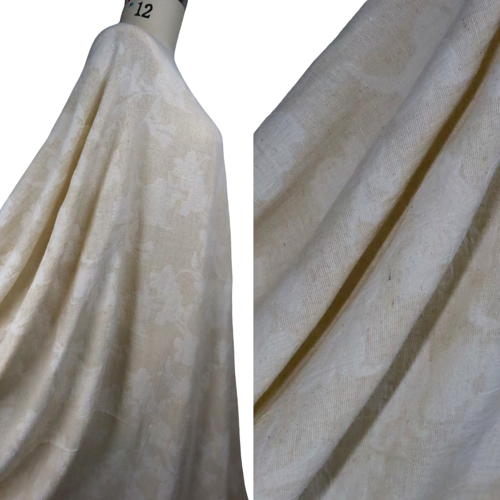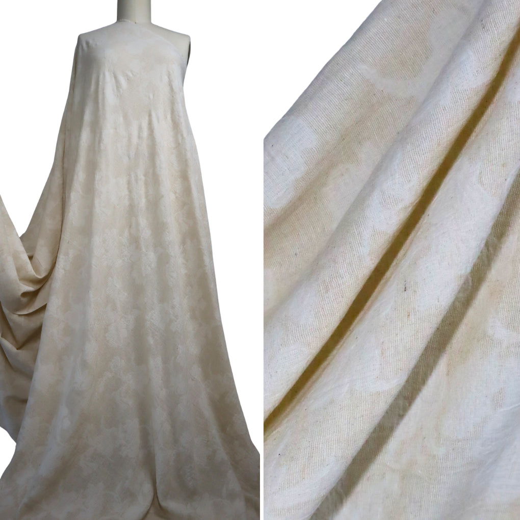 If you love understated, natural looking cloth, then this beautiful jacquard will have you saying 'Oui Oui' :-). This is a natural-on-natural floral jacquard, with a wonderful combination of cotton, linen and viscose. It feels soft, and has a desirable, slightly crumpled look. You'll notice that the floral design is more off white, and the background is more natural, complete with a slight texture. There is no stiffness, and it drapes in soft folds. This is a little lighter in colour when compared to the 'Dunes' Stonewashed linen, but it would pair beautifully. This is going to be gorgeous in blouses, shirts, loose pants, skirts, and dresses.