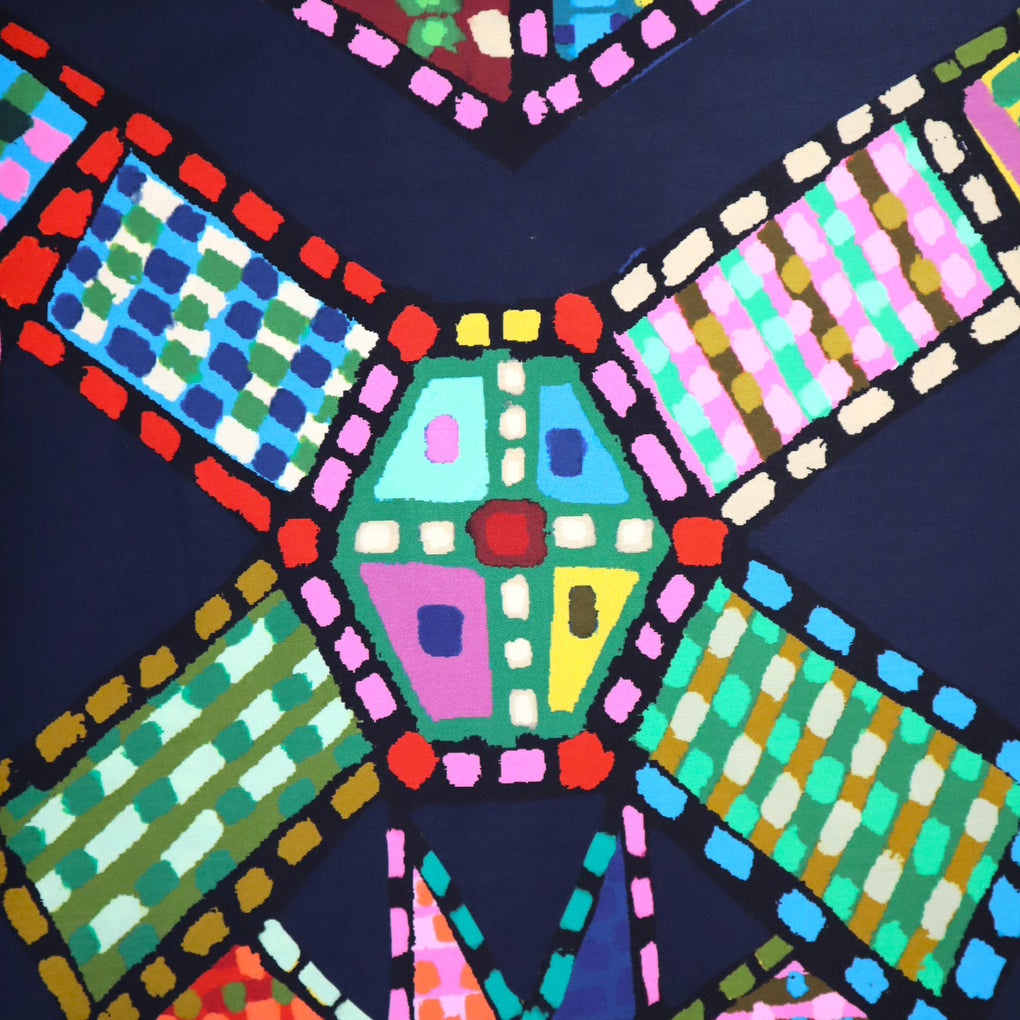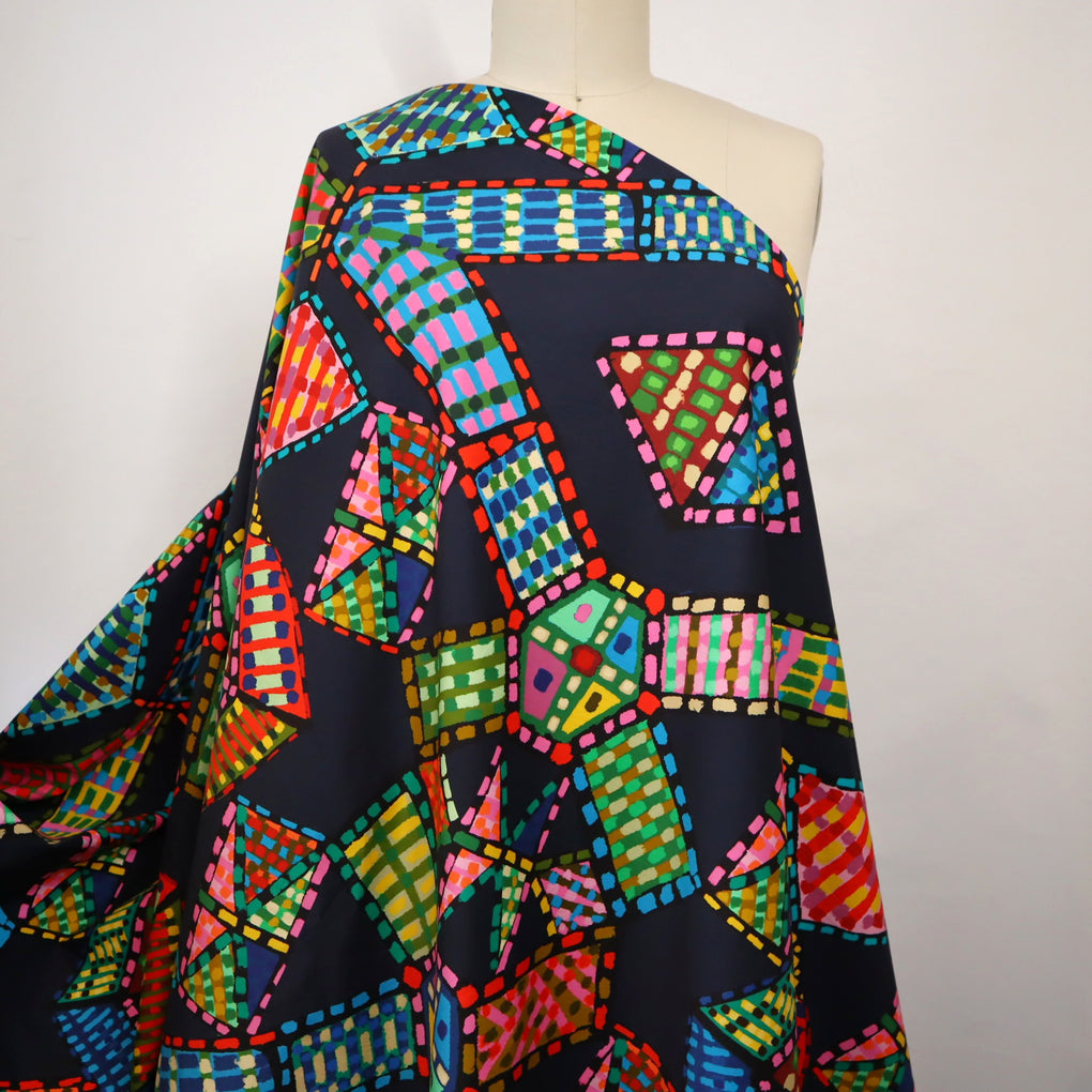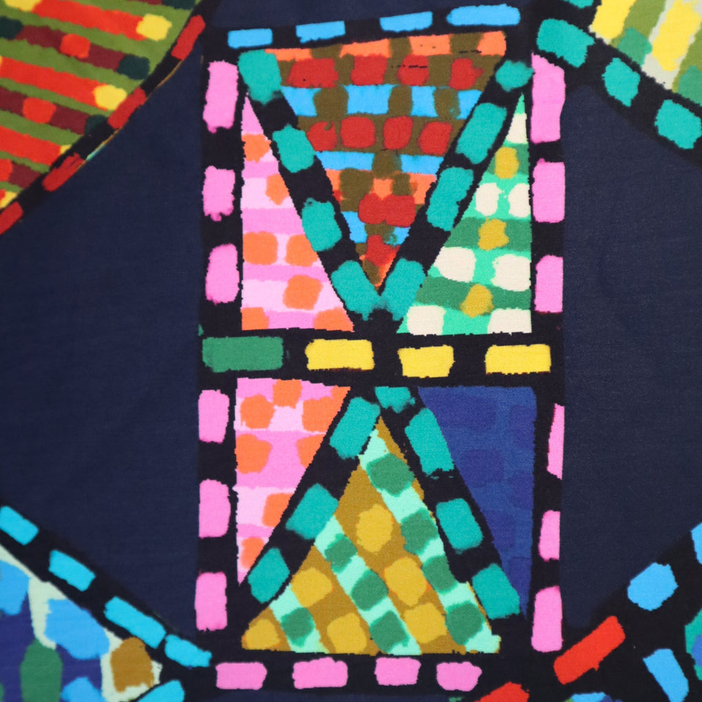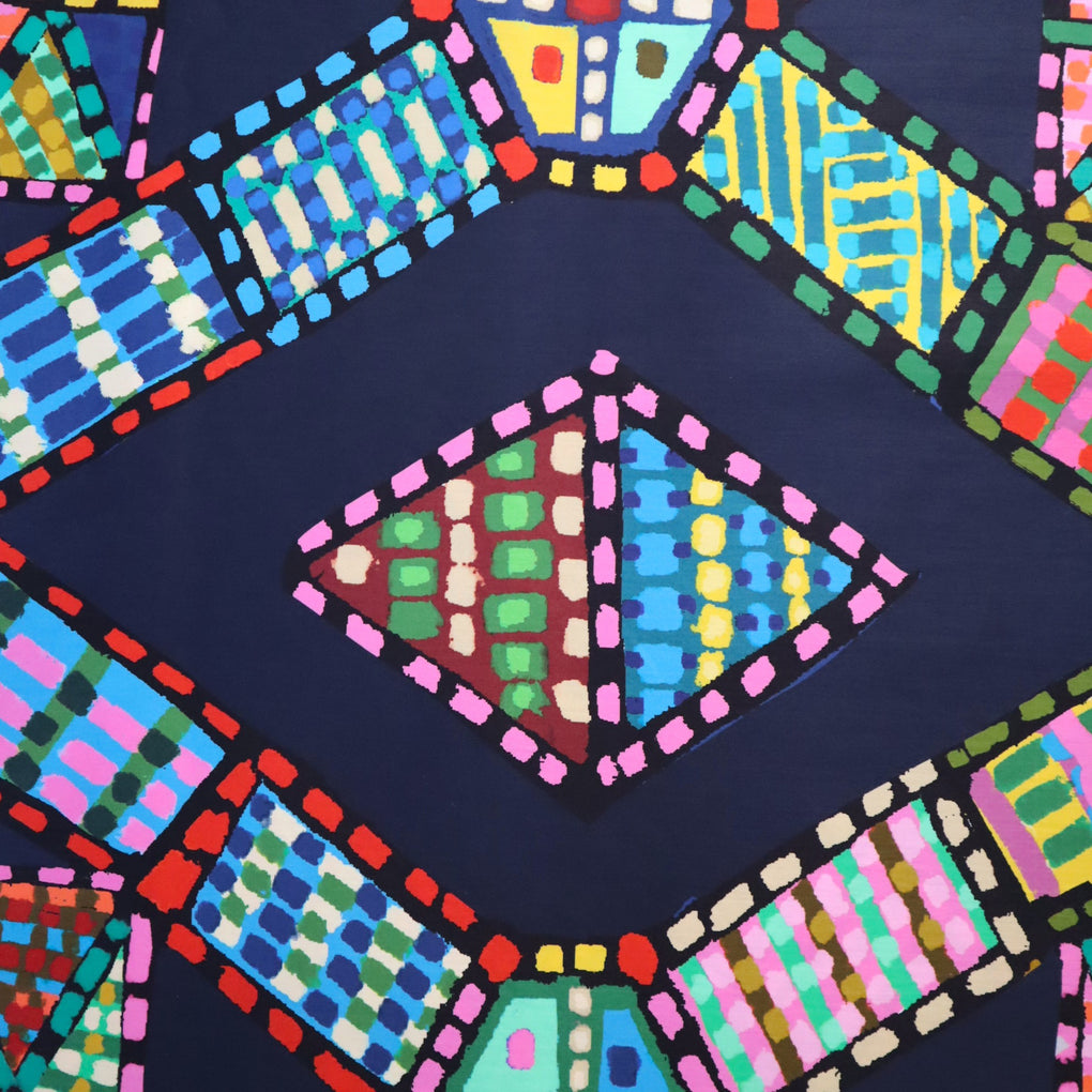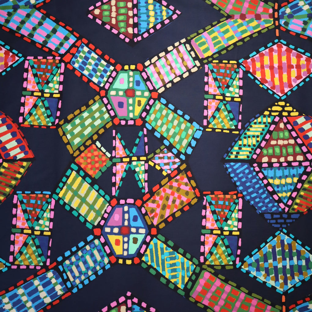 A ‘truss’ is an assembly of triangular shapes that support a structure, but I rather like the Old French meaning, which is a ‘collection of things bound together’.   This stunning Miss Moresby print has all the hallmarks of Sarah’s playful aesthetic, but the use of ‘truss’ shapes and other geometric forms like rectangles, diamonds, and hexagons brings a fresh, modern take.  It is such a unique way to showcase creative colour and pattern-play.   The whole design is indeed ‘bound together’ by the overarching theme, and the echoes of colours and dashes, lines, and other shapes throughout the print.  It’s a darker navy background than the ‘Saturdays’ print. Even though the navy backgrounds are different, I’d be inclined to mix the prints 😉.