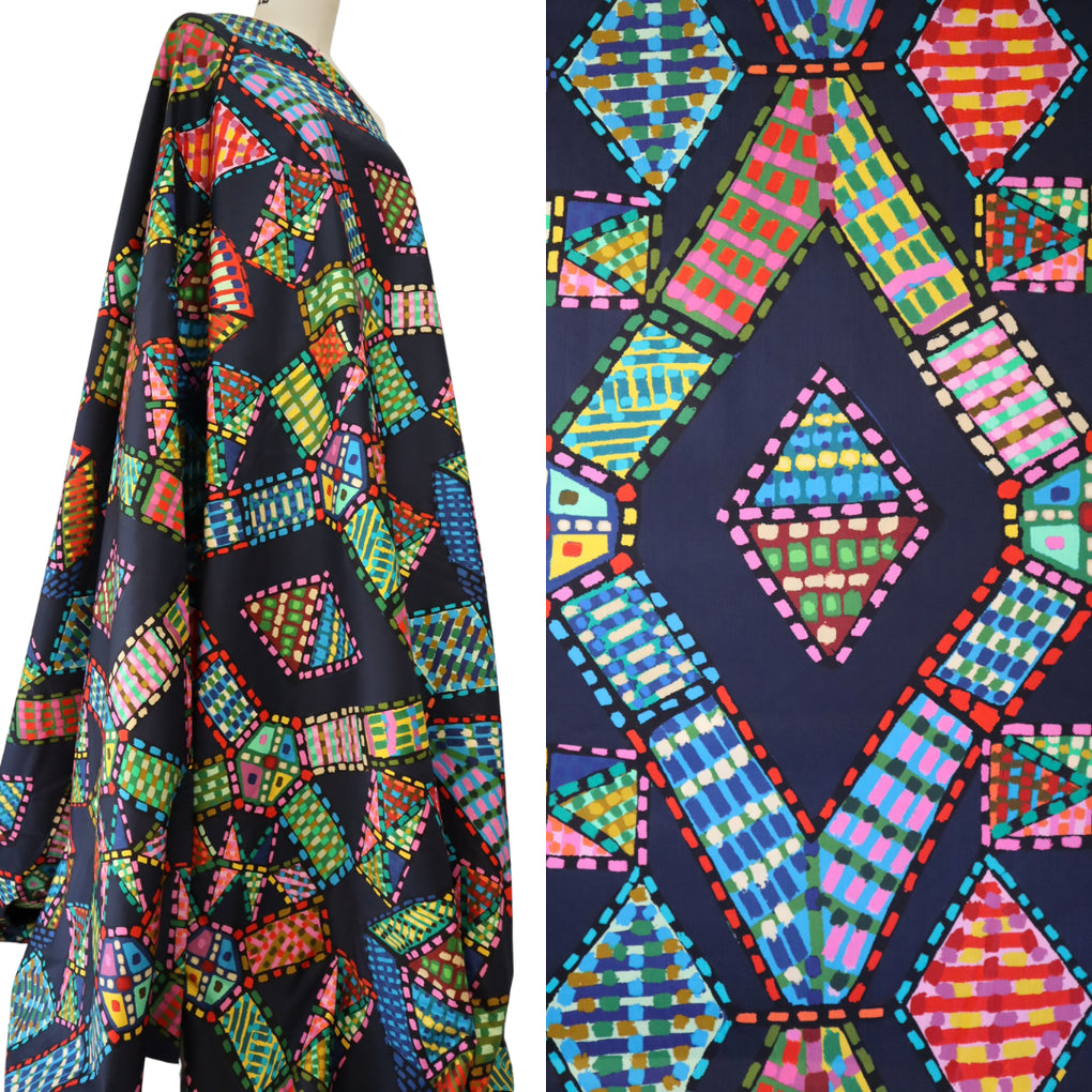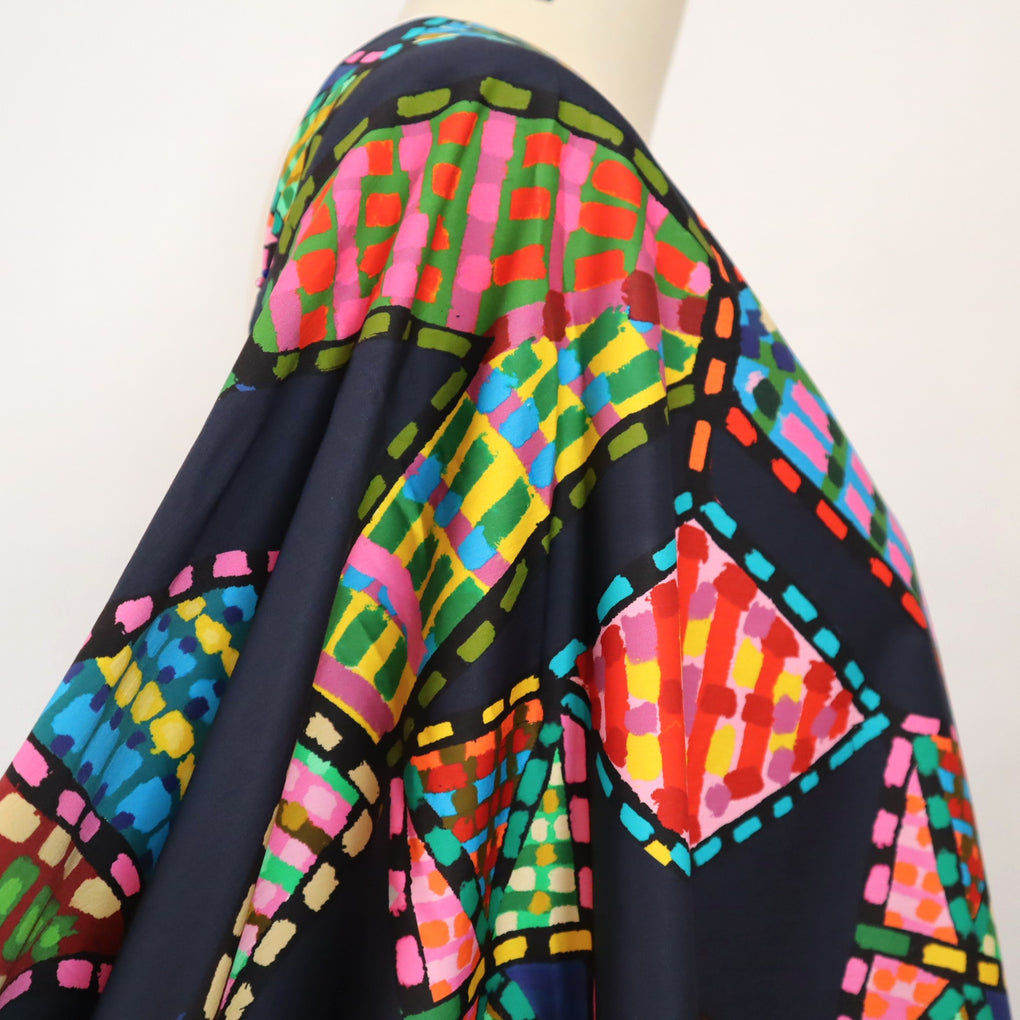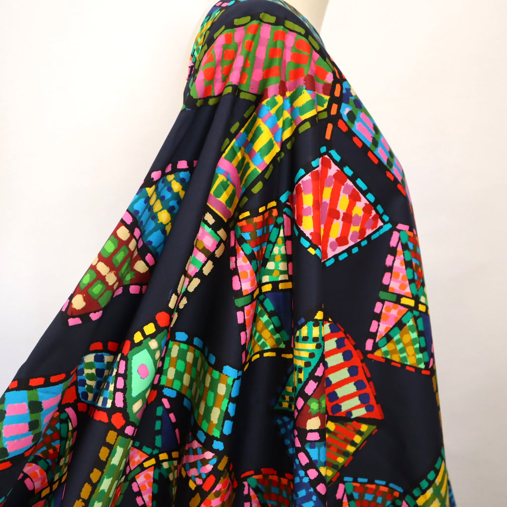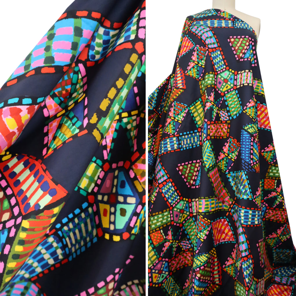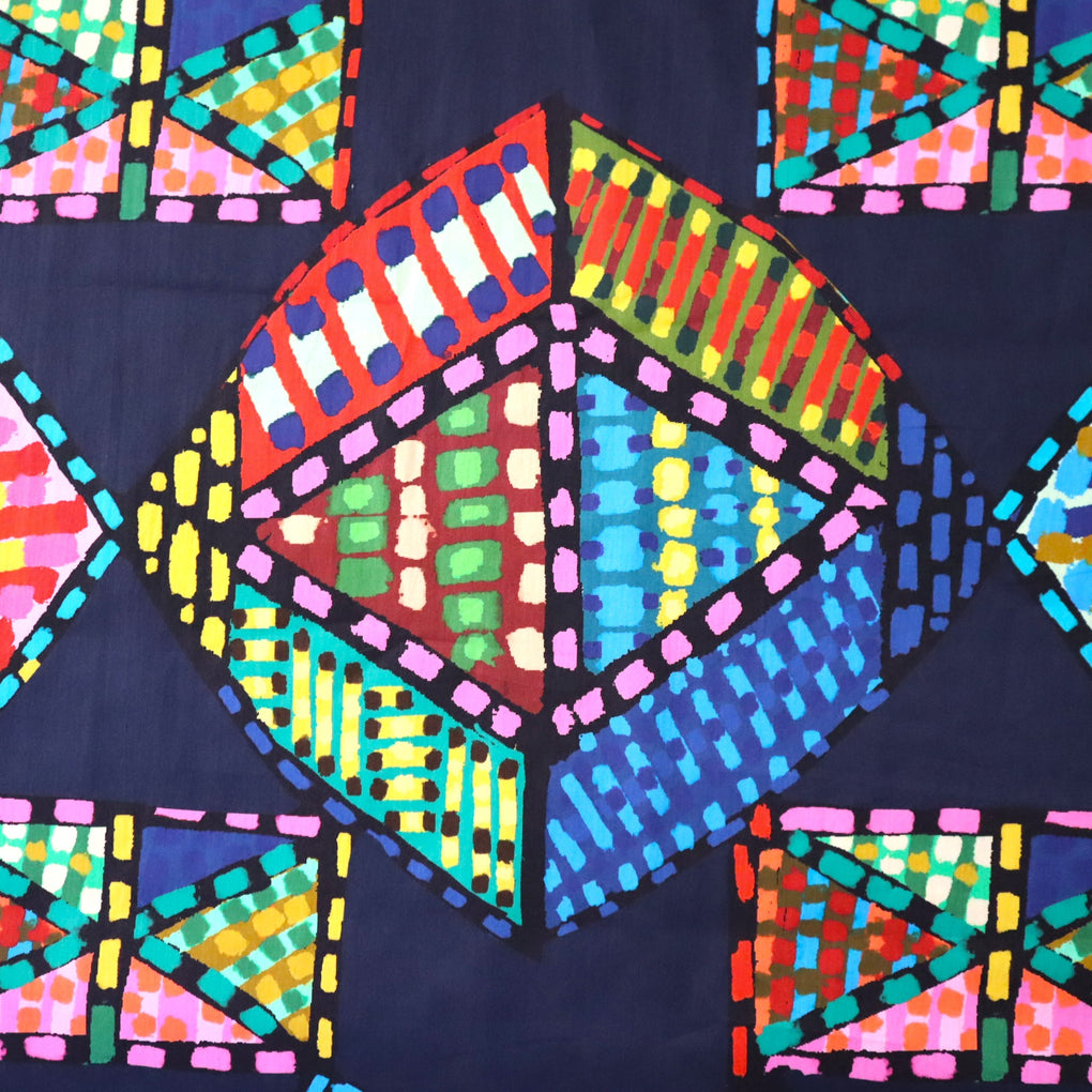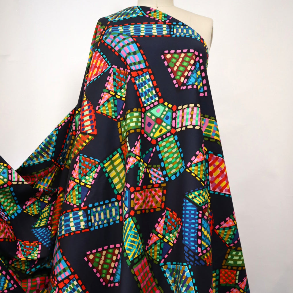 A ‘truss’ is an assembly of triangular shapes that support a structure, but I rather like the Old French meaning, which is a ‘collection of things bound together’.   This stunning Miss Moresby print has all the hallmarks of Sarah’s playful aesthetic, but the use of ‘truss’ shapes and other geometric forms like rectangles, diamonds, and hexagons brings a fresh, modern take.  It is such a unique way to showcase creative colour and pattern-play.   The whole design is indeed ‘bound together’ by the overarching theme, and the echoes of colours and dashes, lines, and other shapes throughout the print.  It’s a darker navy background than the ‘Saturdays’ print. Even though the navy backgrounds are different, I’d be inclined to mix the prints 😉.