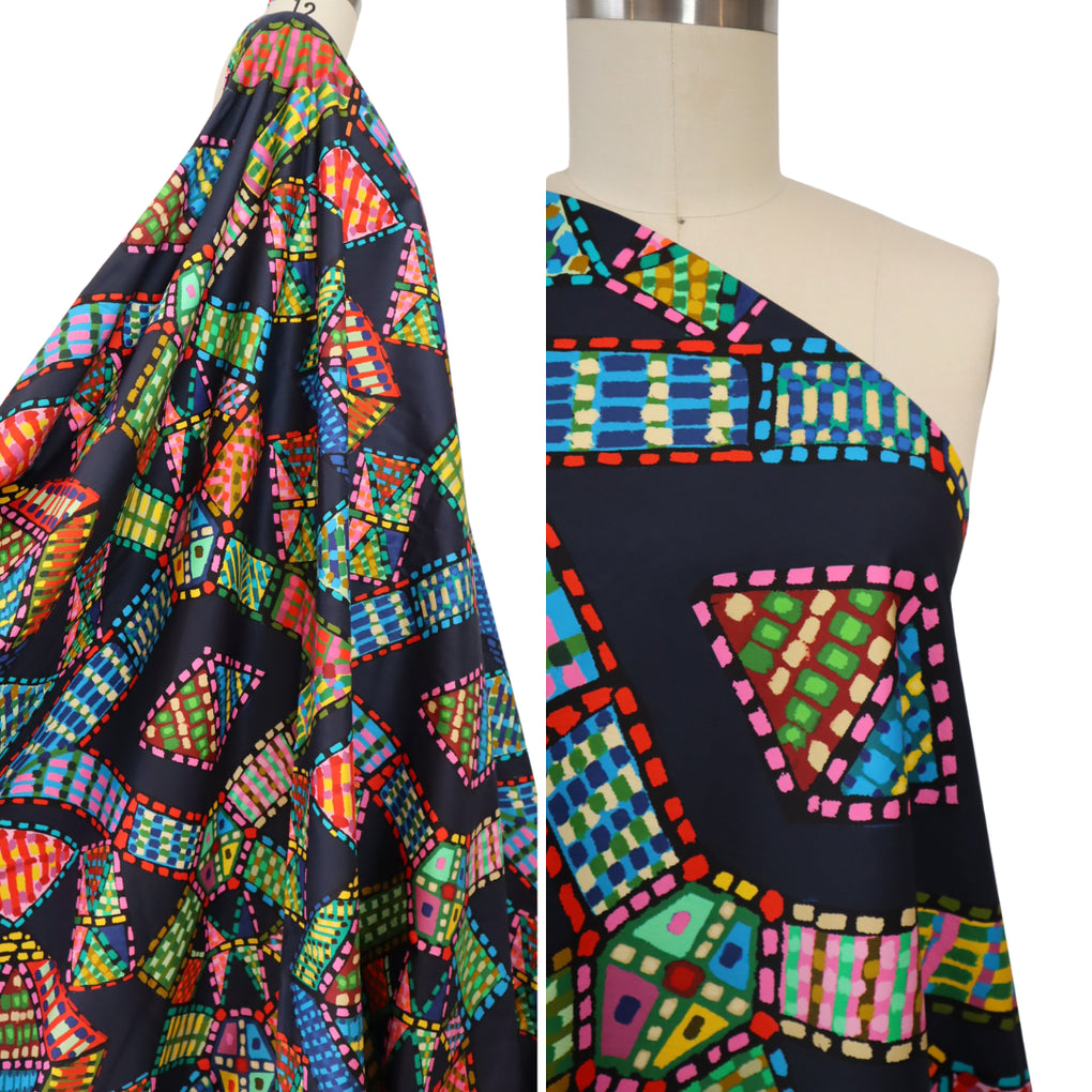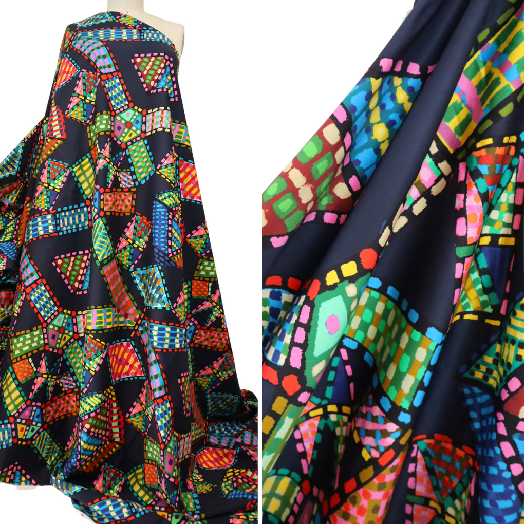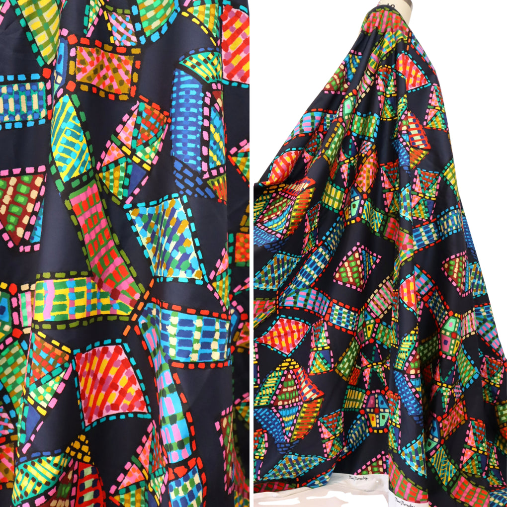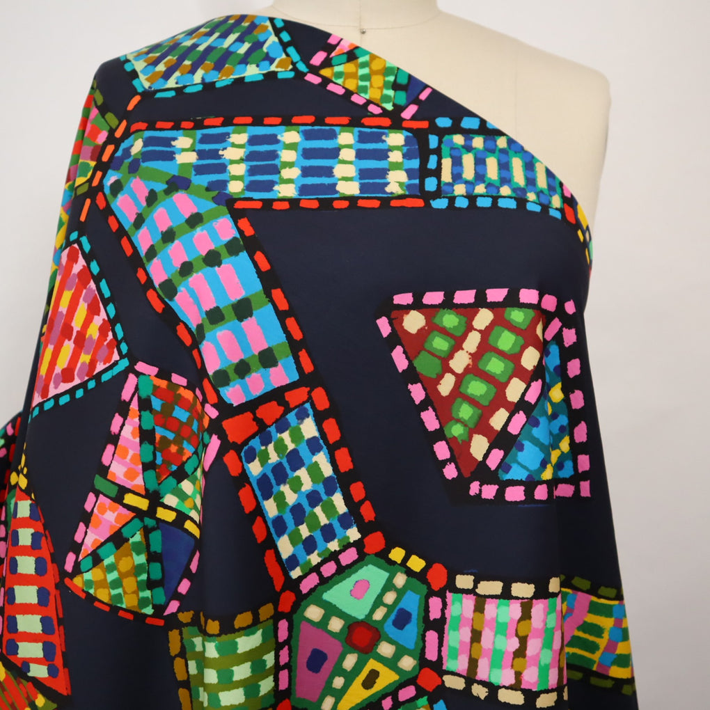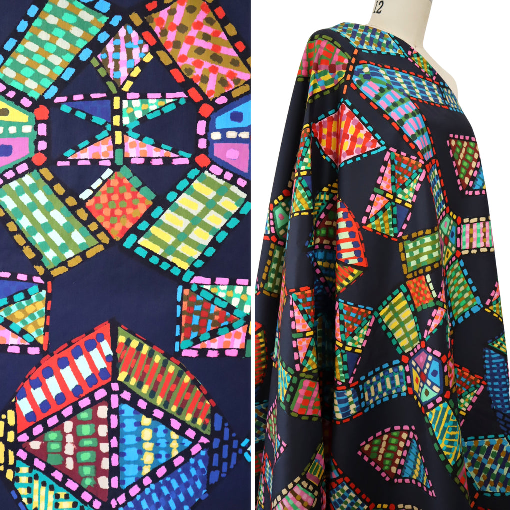 A ‘truss’ is an assembly of triangular shapes that support a structure, but I rather like the Old French meaning, which is a ‘collection of things bound together’.   This stunning Miss Moresby print has all the hallmarks of Sarah’s playful aesthetic, but the use of ‘truss’ shapes and other geometric forms like rectangles, diamonds, and hexagons brings a fresh, modern take.  It is such a unique way to showcase creative colour and pattern-play.   The whole design is indeed ‘bound together’ by the overarching theme, and the echoes of colours and dashes, lines, and other shapes throughout the print.  It’s a darker navy background than the ‘Saturdays’ print. Even though the navy backgrounds are different, I’d be inclined to mix the prints 😉.
