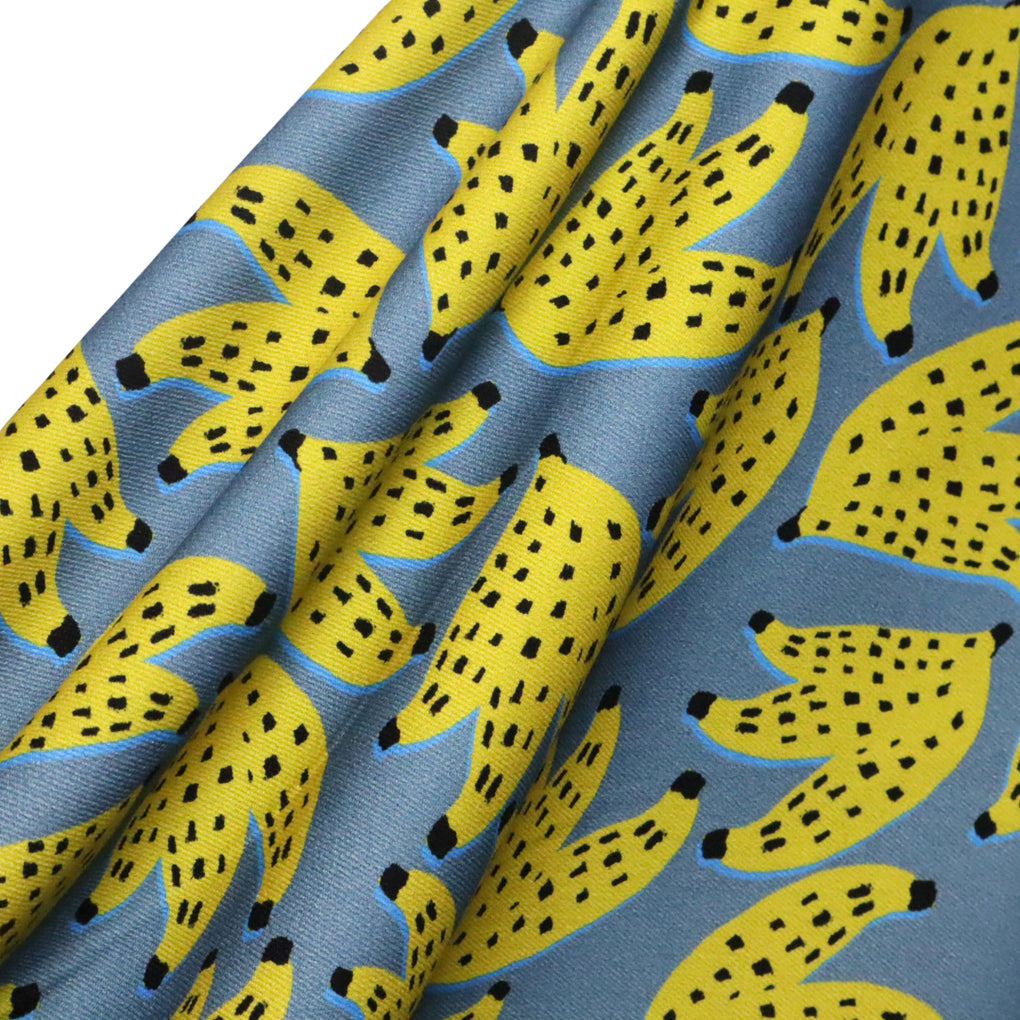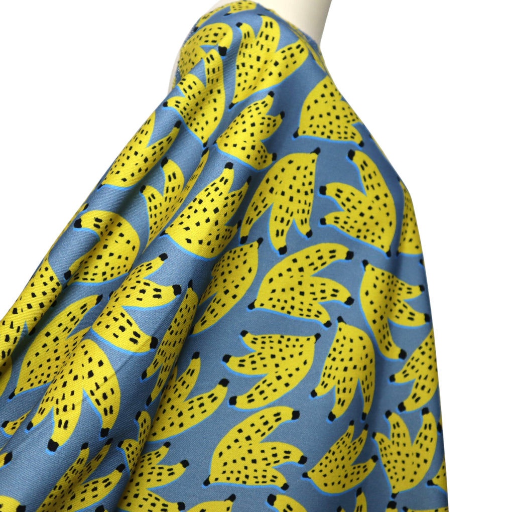 Fabric Godmother's exclusive denim print features bunches of bananas. This is such a fun take on a tropical themed print, and it has real designer vibes. The denim blue background is perfect to showcase the little bunches of yellow bananas, complete with black spots. If you look carefully, you can see a brighter blue outline of the fruit, which is a subtle but effective addition. For me this level of fruity fun harkens back to a particular designer that begins with 'P' and ends in 'rada'. I love the fact that Fabric Godmother decided to put this print on denim. Genius!