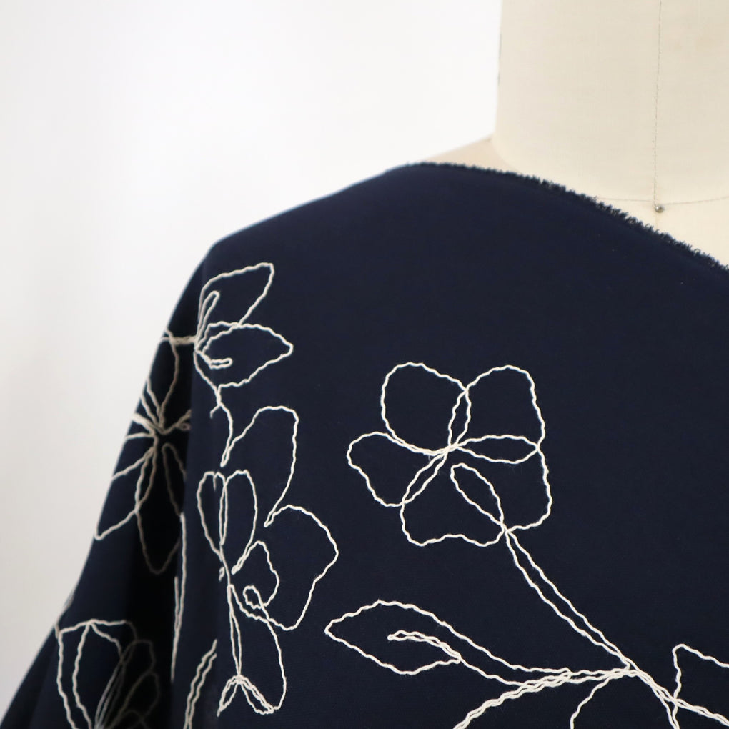 'Hadley' is a navy viscose linen blend with off-white floral embroidery. The couching stitch entails sewing (or embroidering) a thin white thread | cord onto the fabric using a fine thread. You will see what I mean in the close-up images. The underside features the flat cotton sewing thread and not the corded design. The soft viscose linen blend has drape with folds falling on and away from the body. It is only a bit transparent when you hold a single layer to the light. You might want to use a light black slip, but once the cloth is around your body, you will be fine.