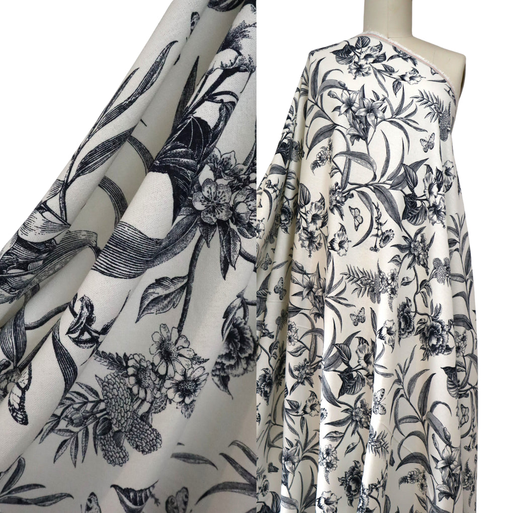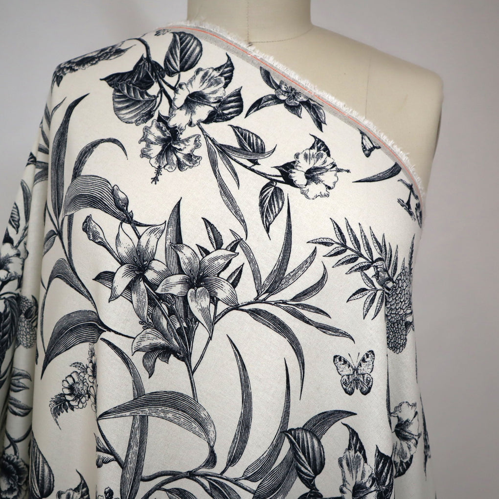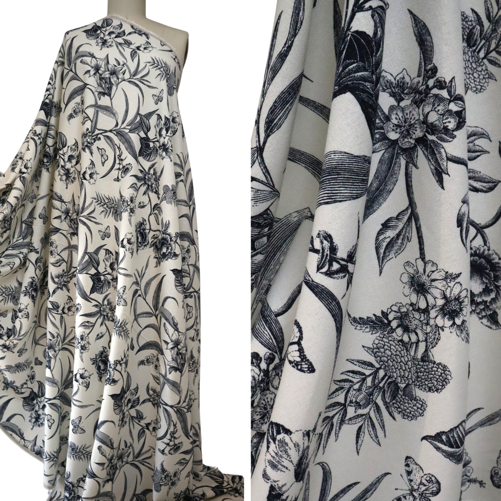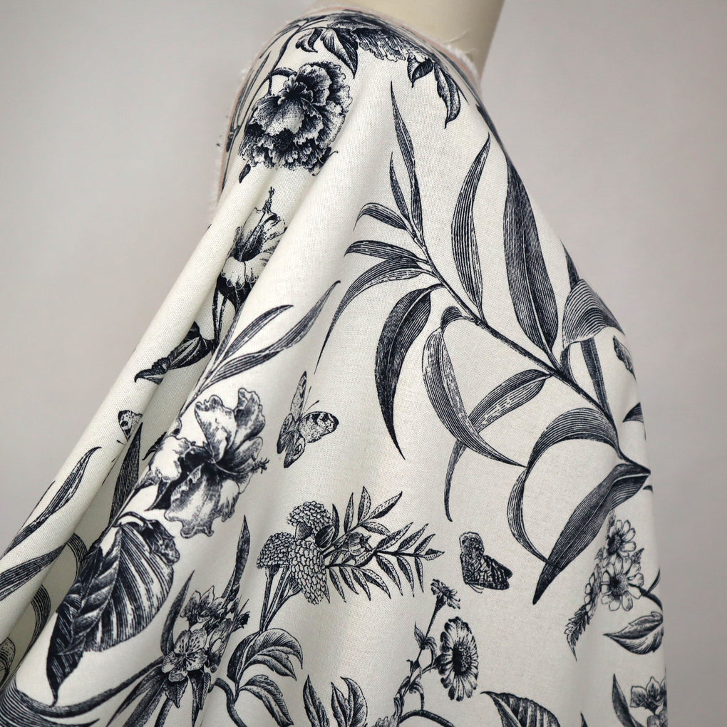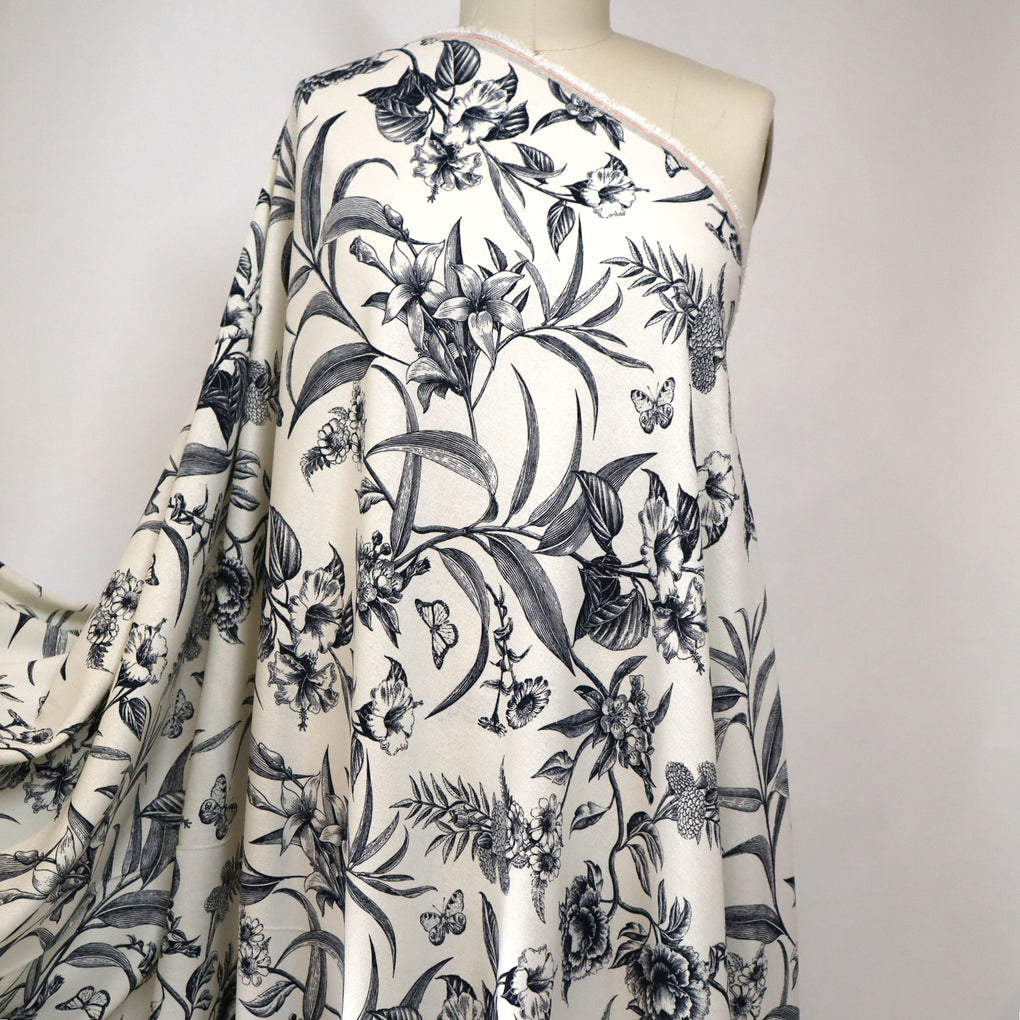 'Juniper' is a soft and drapey ivory viscose linen blend with a dark navy botanical design. The pattern goes in both directions along the grainline, so you can cut out economically. I love the little butterflies that feature across the design, and the mix of tropical flowers and striking foliage echo classic drawings you might see in old botanical books. It's so chic.