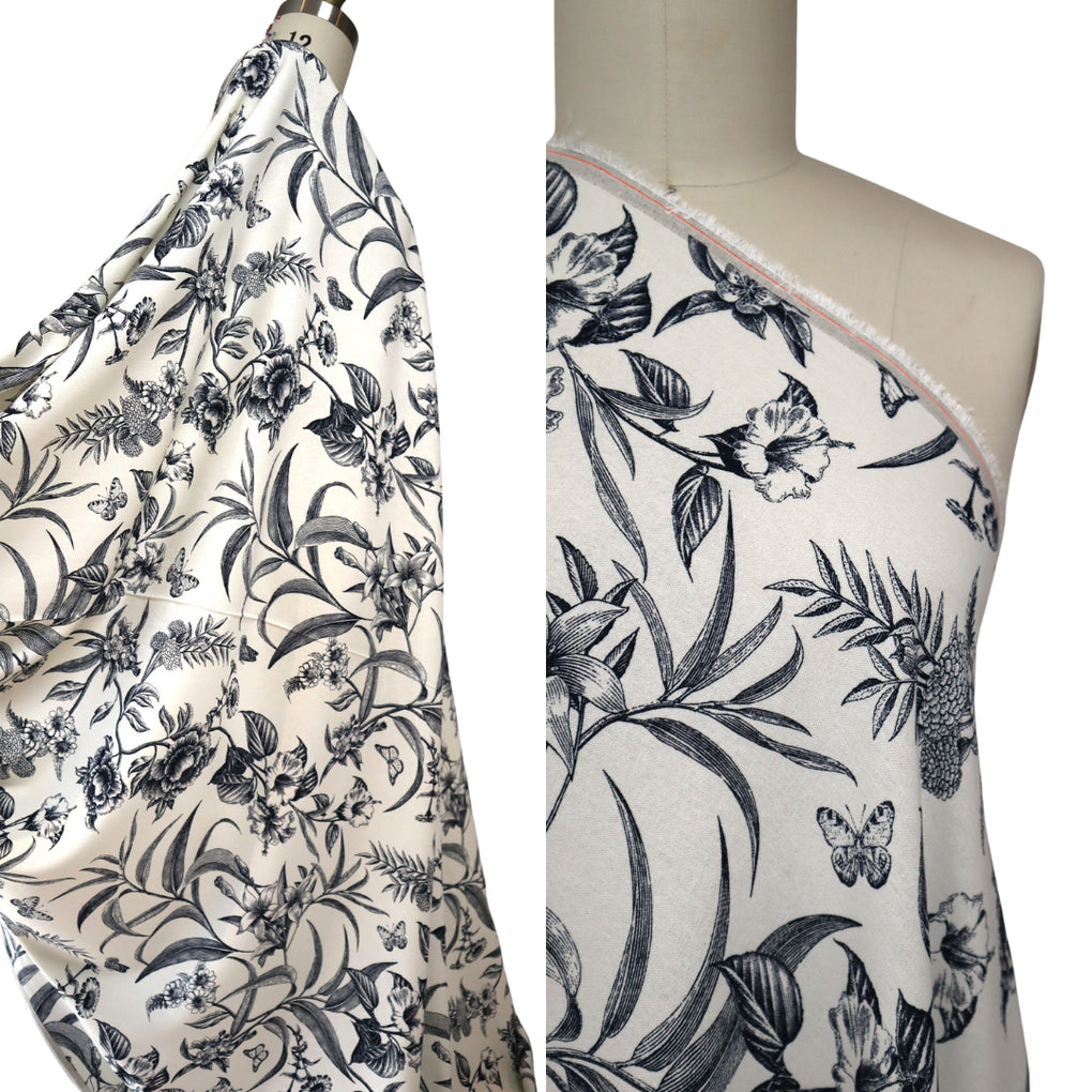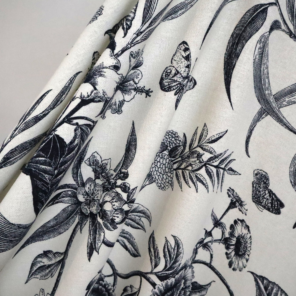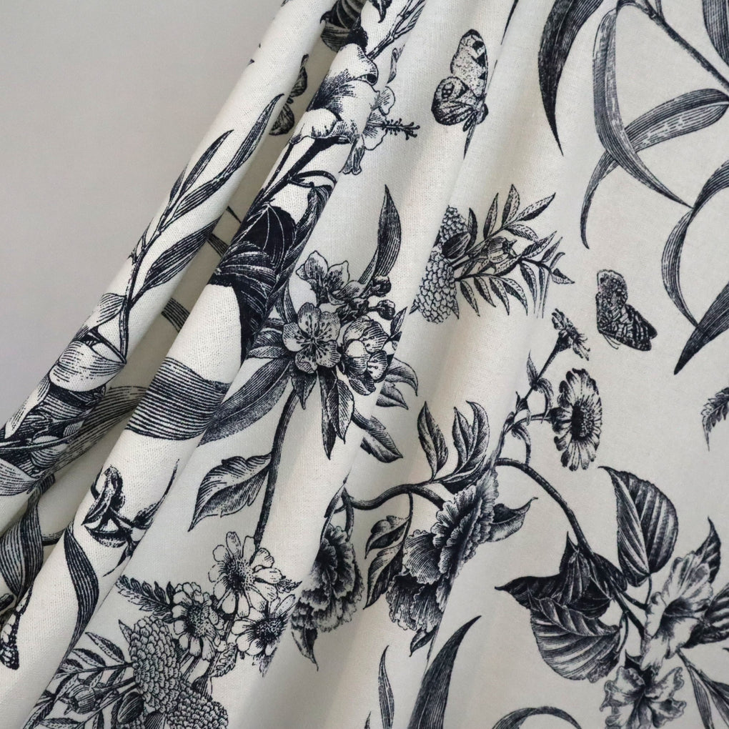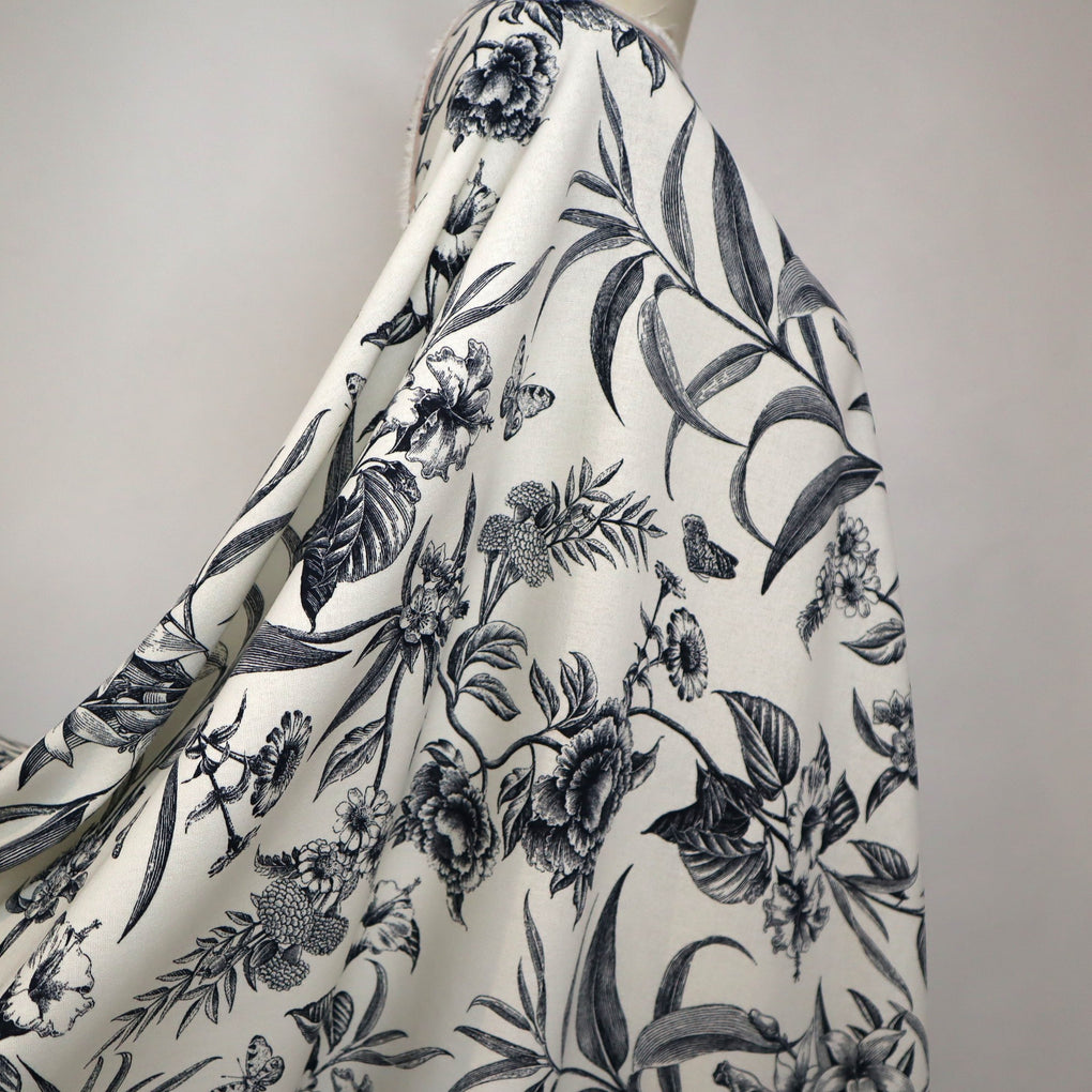 'Juniper' is a soft and drapey ivory viscose linen blend with a dark navy botanical design. The pattern goes in both directions along the grainline, so you can cut out economically. I love the little butterflies that feature across the design, and the mix of tropical flowers and striking foliage echo classic drawings you might see in old botanical books. It's so chic.