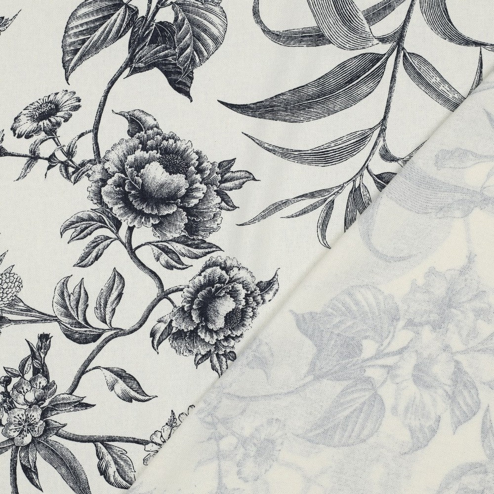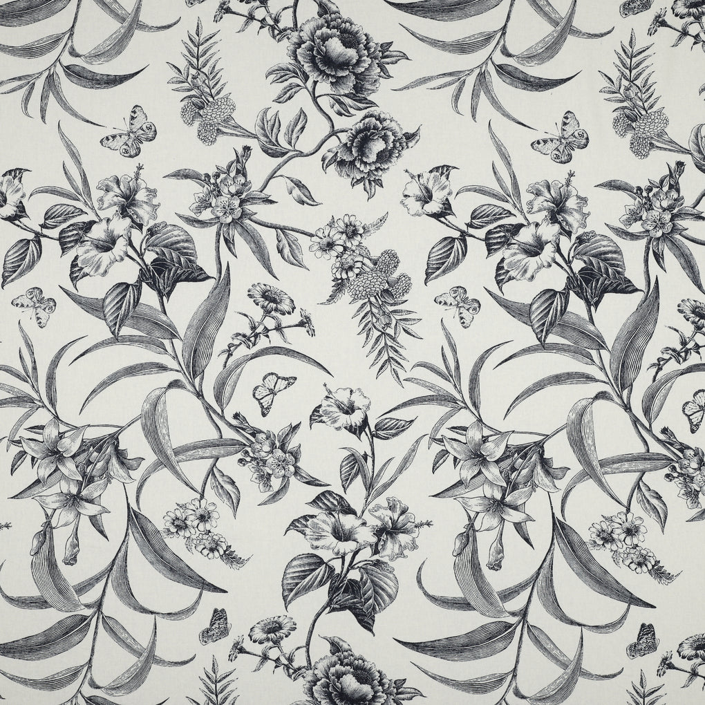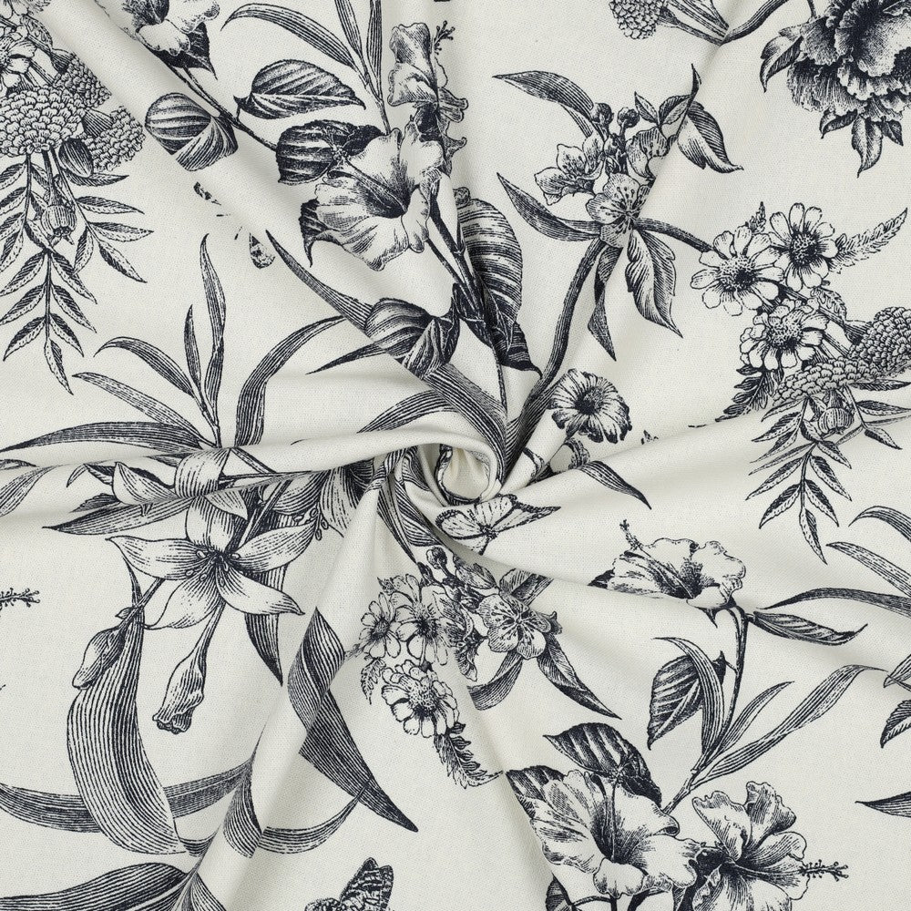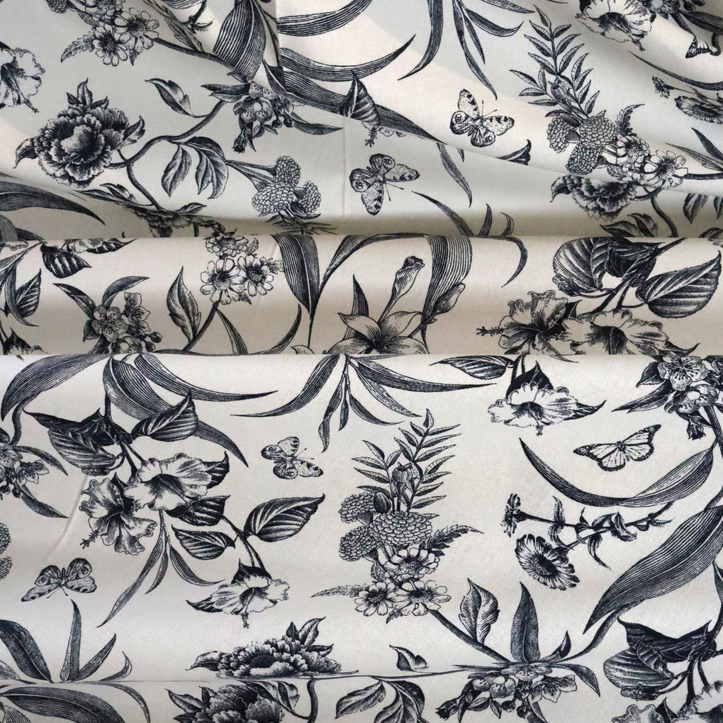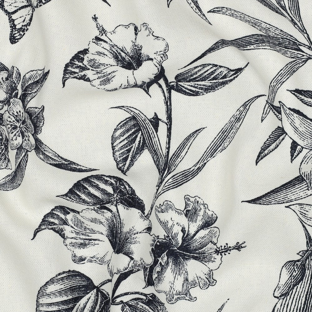 'Juniper' is a soft and drapey ivory viscose linen blend with a dark navy botanical design. The pattern goes in both directions along the grainline, so you can cut out economically. I love the little butterflies that feature across the design, and the mix of tropical flowers and striking foliage echo classic drawings you might see in old botanical books. It's so chic.