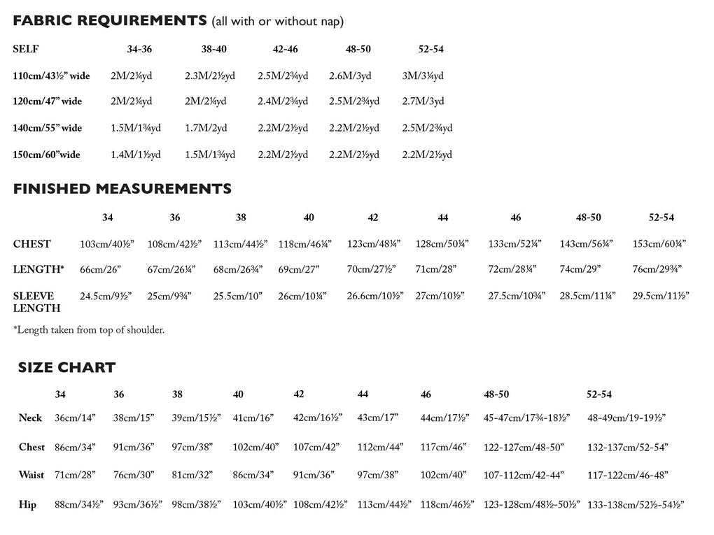 This is a multi-size pattern including sizes UK 36-46. This has chest | bust finished measurements of 103cm - 133cm. All seam allowances are 1.5cm unless otherwise stated.